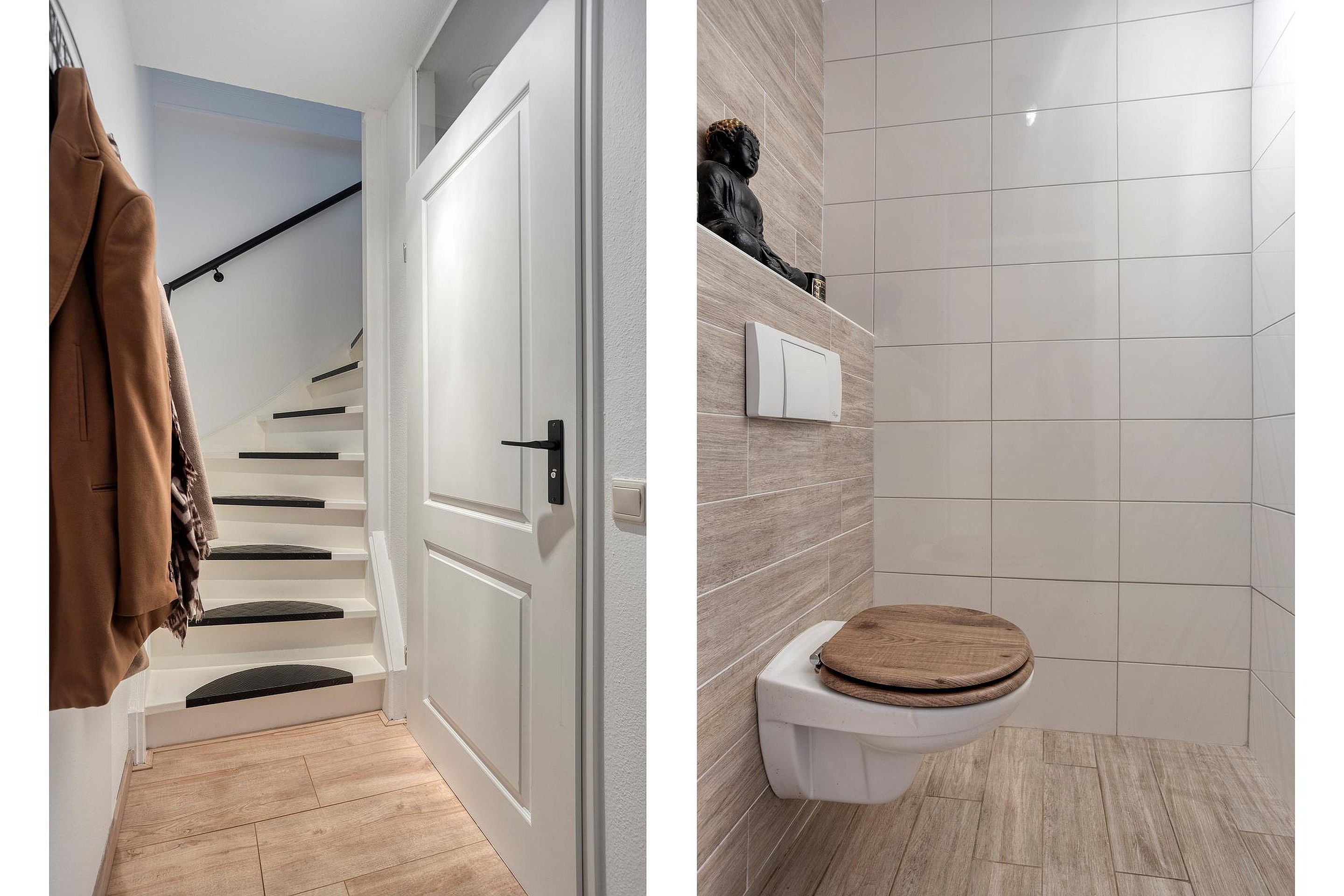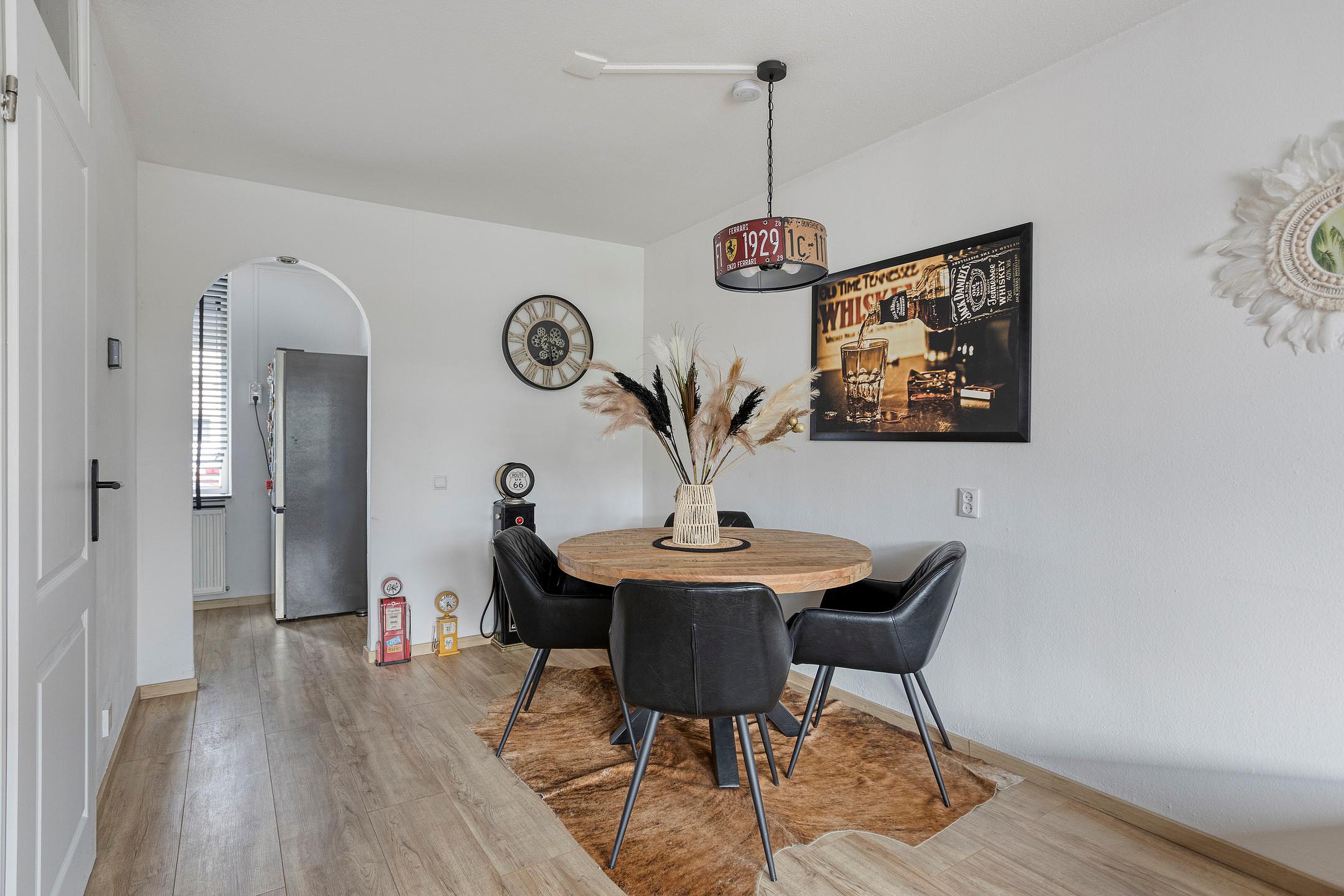 Entree/inkomhal (ca. 2m2) met meterkast (automatische groepen en slimme meters) en toegang tot de living. Sfeervolle L- living (ca. 26m2), voorzien van een keurige laminaatvloer. De zitkamer is aan de achterzijde gelegen en middels een schuifpui met horraam is er toegang tot de achtertuin. Het eetgedeelte bevindt zich aan de andere zijde en geeft toegang tot de semi-open keuken (ca. 7m2), gelegen aan de voorzijde van de woning. De keuken is voorzien van een luxe keukeninstallatie in hoekopstelling met boven- en onderkasten, lades en de volgende (inbouw)apparatuur, te weten: spoelbak, vaatwasser, 4-pits inductie kookplaat, design afzuiginstallatie, oven en een losse koel-vriescombinatie. Het geheel is netjes afgewerkt met een kunststof werkblad. Tussenhal met toilet en trapopgang naar de verdieping. Het toilet (ca. 1m2) is deels betegeld en voorzien van een wandcloset.