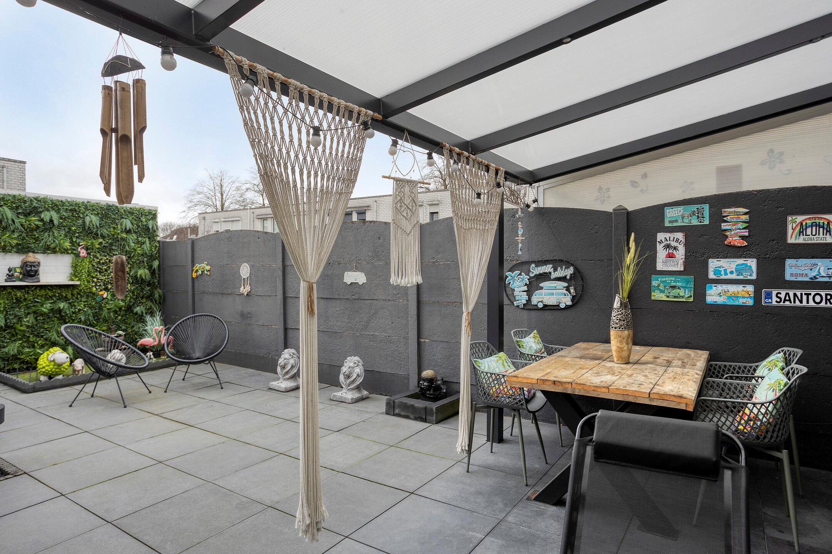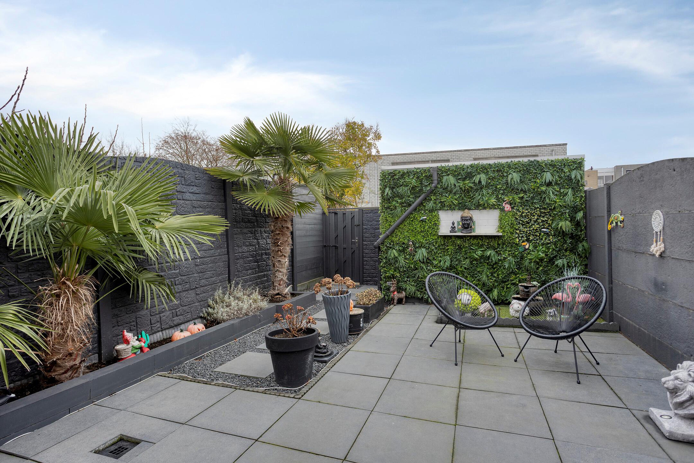 De onderhoudsvriendelijke achtertuin (ca. 50m2) is gesitueerd op het zuidoosten. De tuin is grotendeels betegeld en beschikt verder over een border met diverse (volwassen) beplantingen, een buitenberging (ca. 7m2) en een achteringang. Tevens is er een fijne terrasoverkapping gerealiseerd, met ingebouwde verlichting, alwaar men fijn kan genieten van warme zomeravonden.