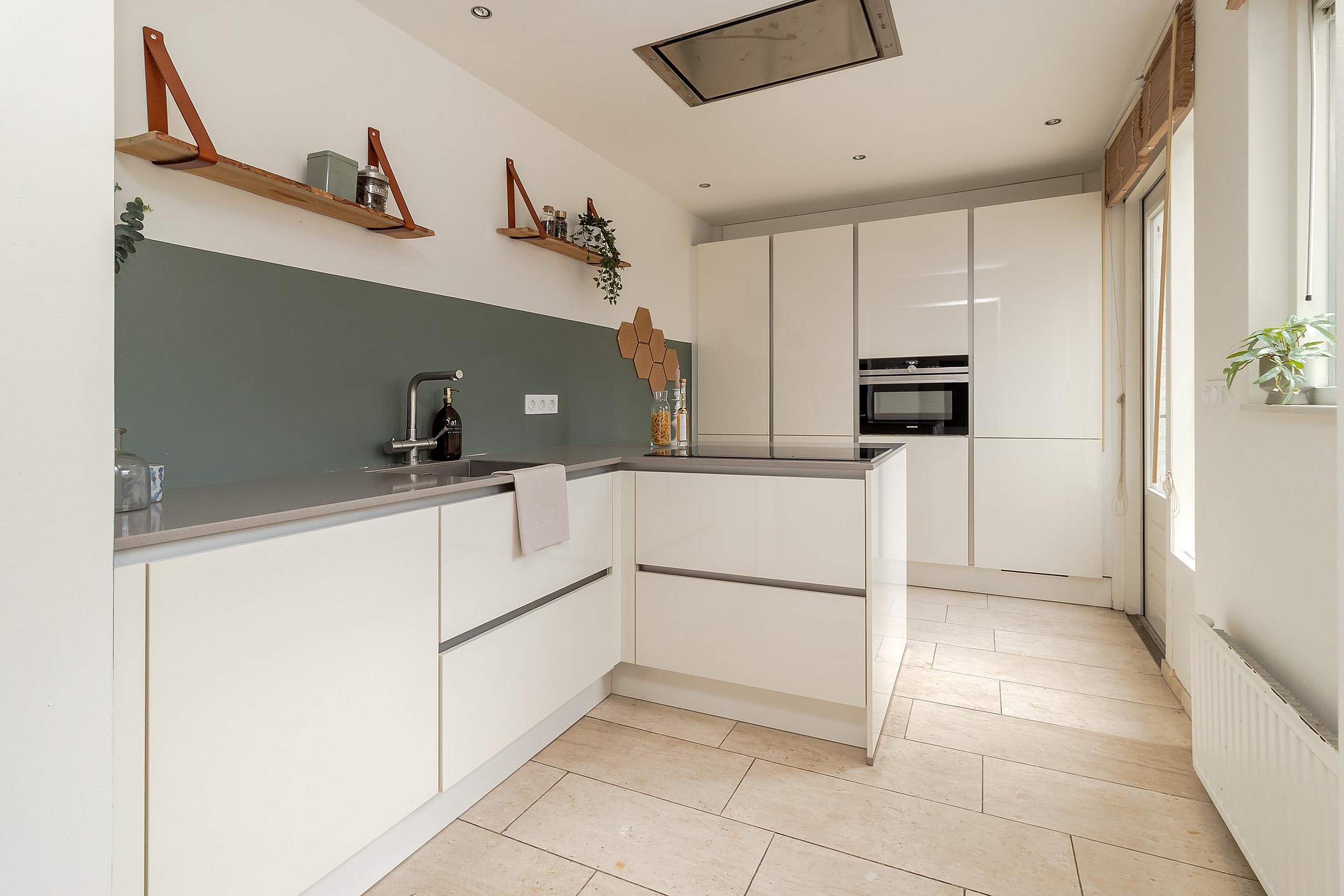 Entree, hal, toilet voorzien van wandcloset en fonteintje. De woonkamer (ca.29m2) en de keuken (ca.10m2) zijn beide voorzien van een travertin vloer en bieden toegang naar de tuin. De keuken is gesitueerd in de uitbouw en is voorzien van inrichting in wandopstelling met kookeiland plus kastenwand met de volgende inbouwapparatuur: spoelbak, afzuigkap, inductiekookplaat, combi-magnetron, vaatwasser en koelkast. In de trappenkast aan de linkerzijde van de woonkamer bevinden zich de cv-ketel en de meterkast.