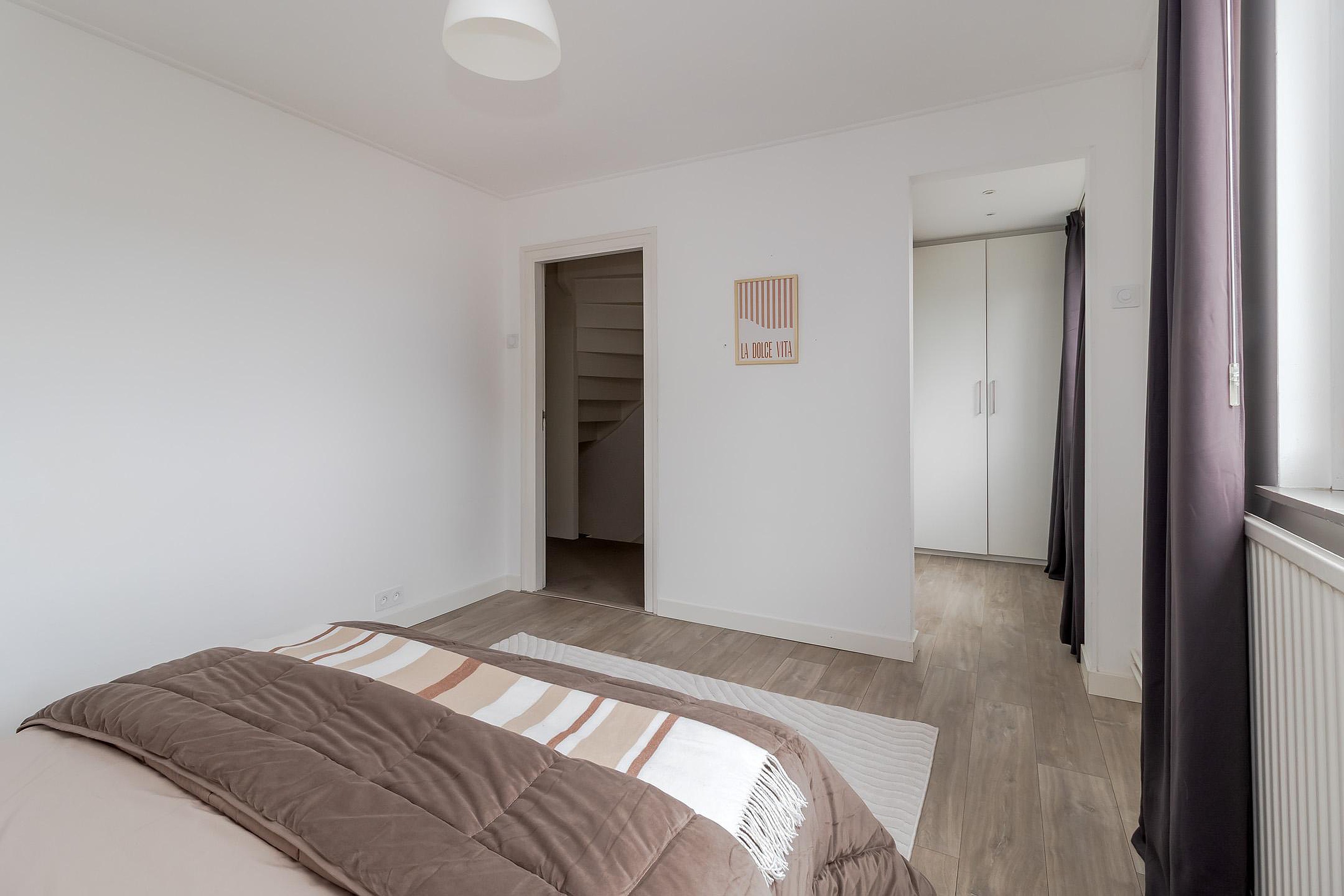 Overloop met toegang tot de 2 slaapkamers (ca.11m2 en ca.10m2) en de badkamer (ca.3m2) De hoofdslaapkamer met een praktische walk-in closet, voormalige derde slaapkamer (ca.4m2). Beide slaapkamers zijn van een laminaatvloer voorzien. Moderne badkamer (gemoderniseerd in 2016) voorzien van een inloopdouche en een vaste wastafel.