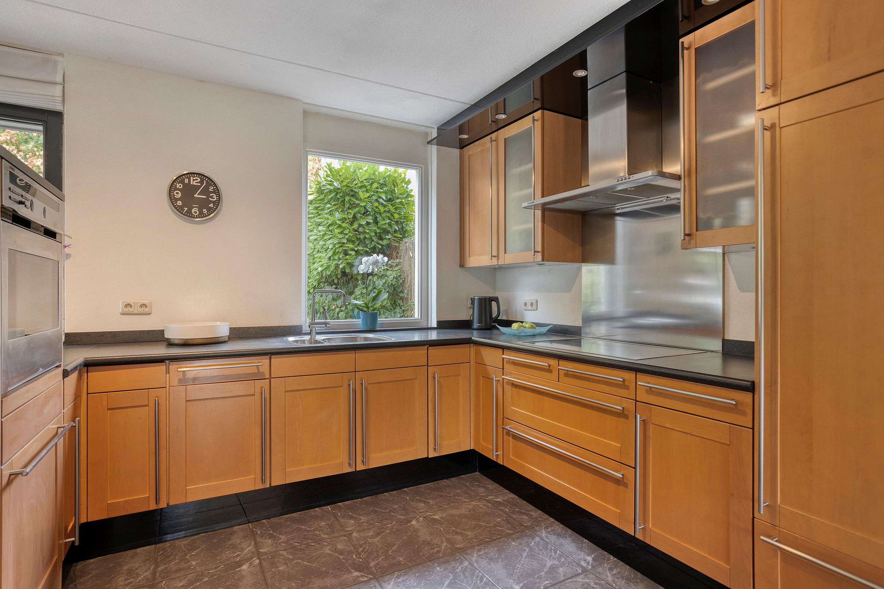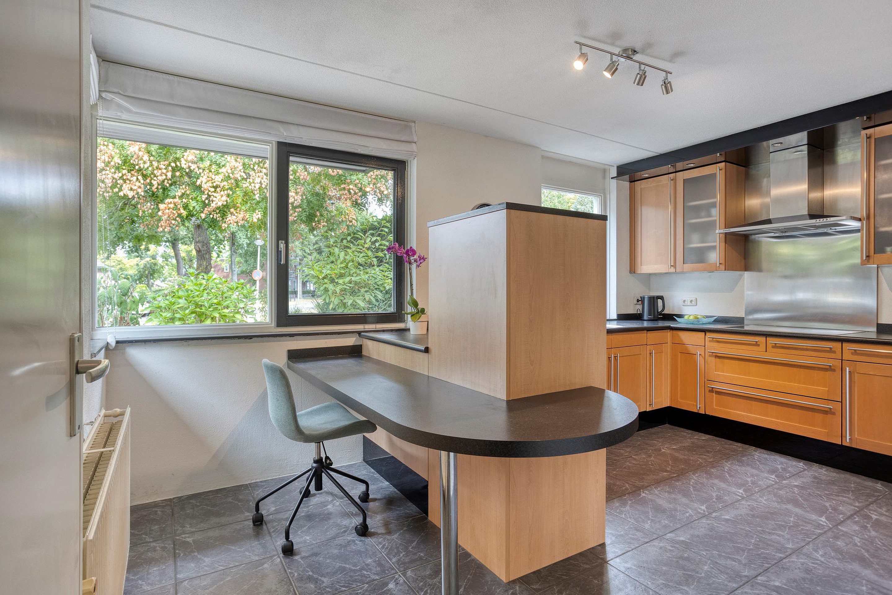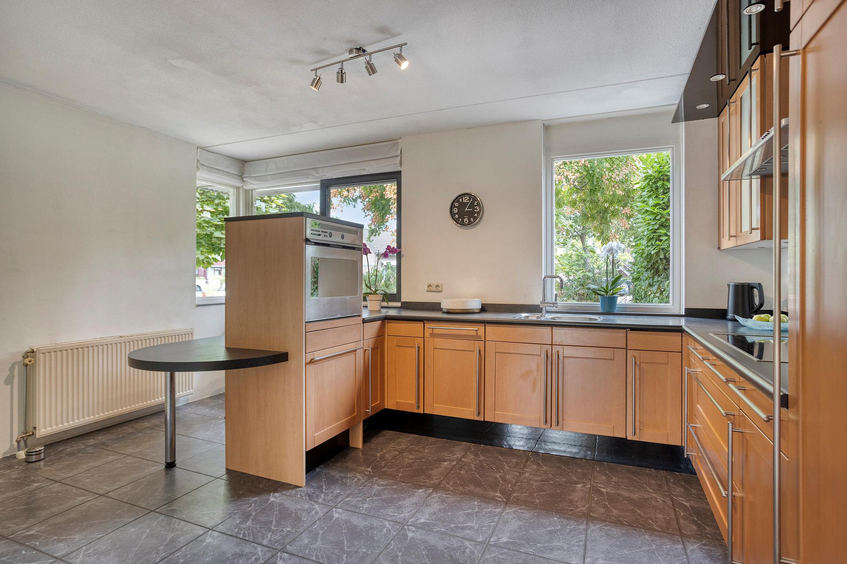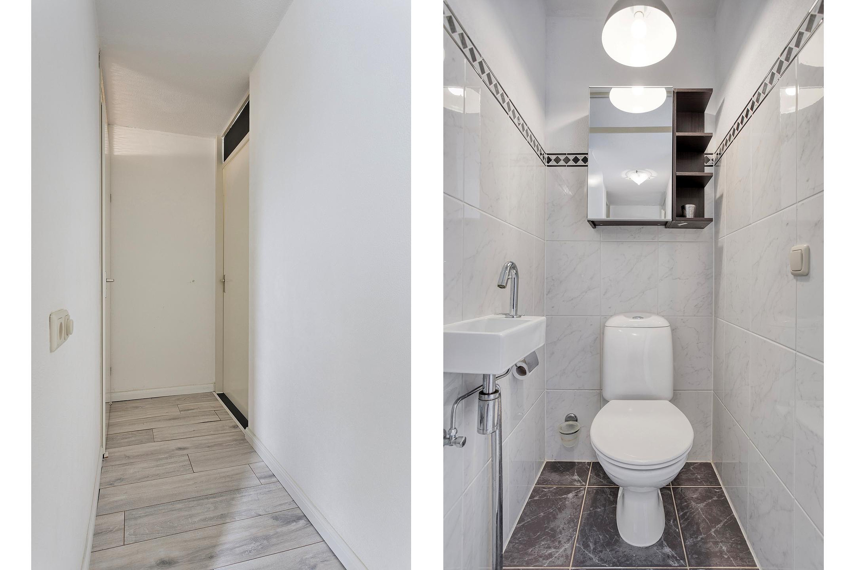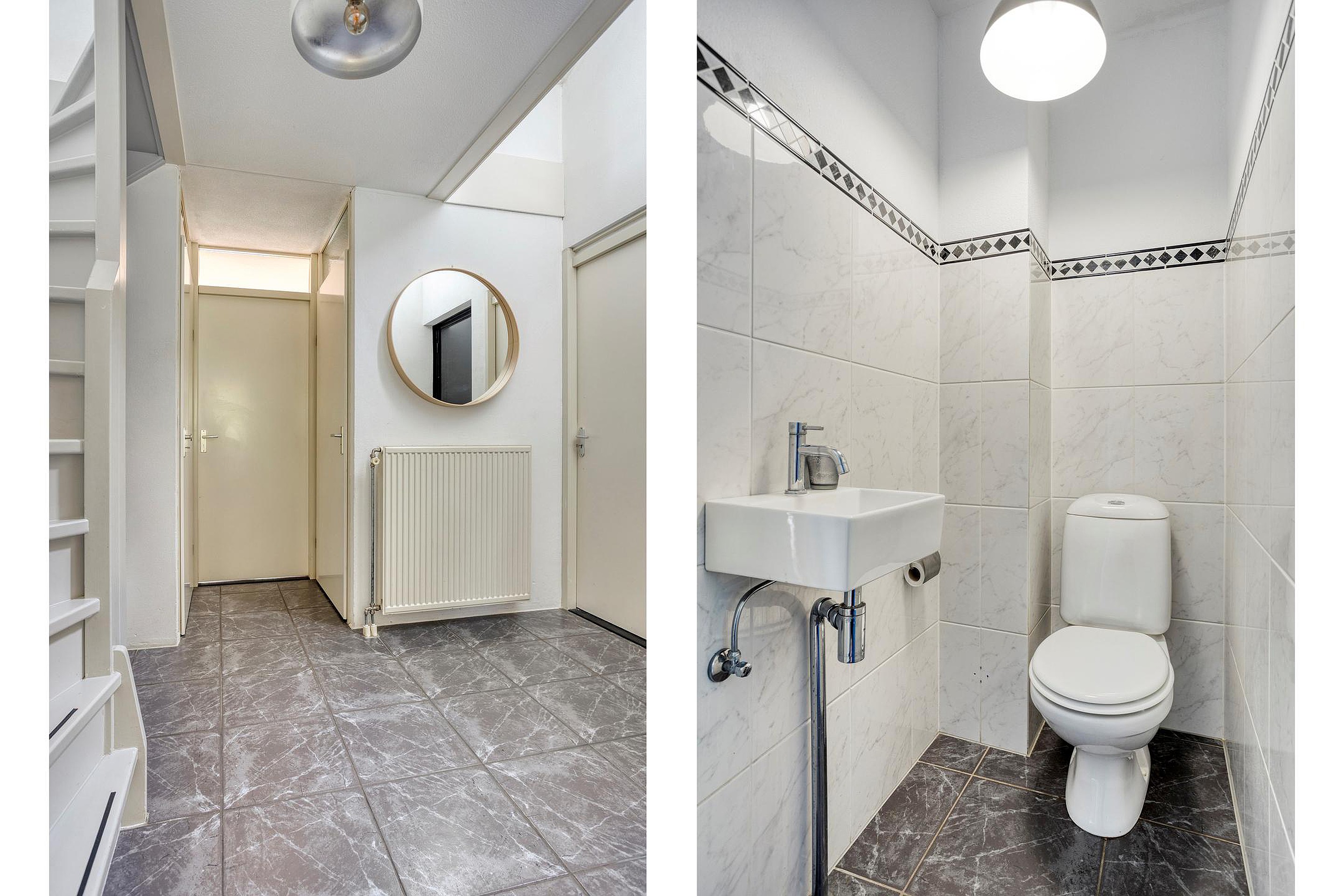 Overdekte entree met toegang tot inkomhal en berging/bijkeuken. Ruime inkomhal (ca. 7m2) voorzien van een donkere tegelvloer, met meterkast (moderne groepenkast met automaatgroepen en slimme meters), toilet, trapopgang en toegang tot de woonkamer, keuken en berging/bijkeuken. De toiletruimte (ca. 1m2) is geheel betegeld en beschikt over een staand closet en een fonteintje. Sfeervolle en lichtovergoten doorzonwoonkamer met open keuken (totaal ca. 65m2). De zitkamer (ca. 43m2) is aan de achterzijde van de woning gelegen en geniet veel lichtinval vanwege de grote ramenpartijen. De vloer is afgewerkt met een houten parketvloer en via een grote schuifpui (met schuifhordeur) is er toegang tot de tuin. Vanuit de zitkamer bereikt men de eetkamer (ca. 9m2), met doorloop naar de keuken (ca. 13,5m2), welke aan de voorzijde van de woning is gelegen. De keuken beschikt over een nette keukenopstelling in U-opstelling, met onder- en bovenkasten, wandkast, ontbijtbar en de navolgende inbouwapparatuur: 1,5 spoelbak, vaatwasser, keramische kookplaat, RVS-afzuiginstallatie (defect) met RVS-achterwand, koelkast en een combi-oven. Het geheel is mooi afgewerkt met een kunststof werkblad en een donkere tegelvloer. De berging/bijkeuken (ca. 5m2) beschikt over voldoende opslagruimte. Hier kan men eventueel ook de aansluitpunten voor het witgoed realiseren.