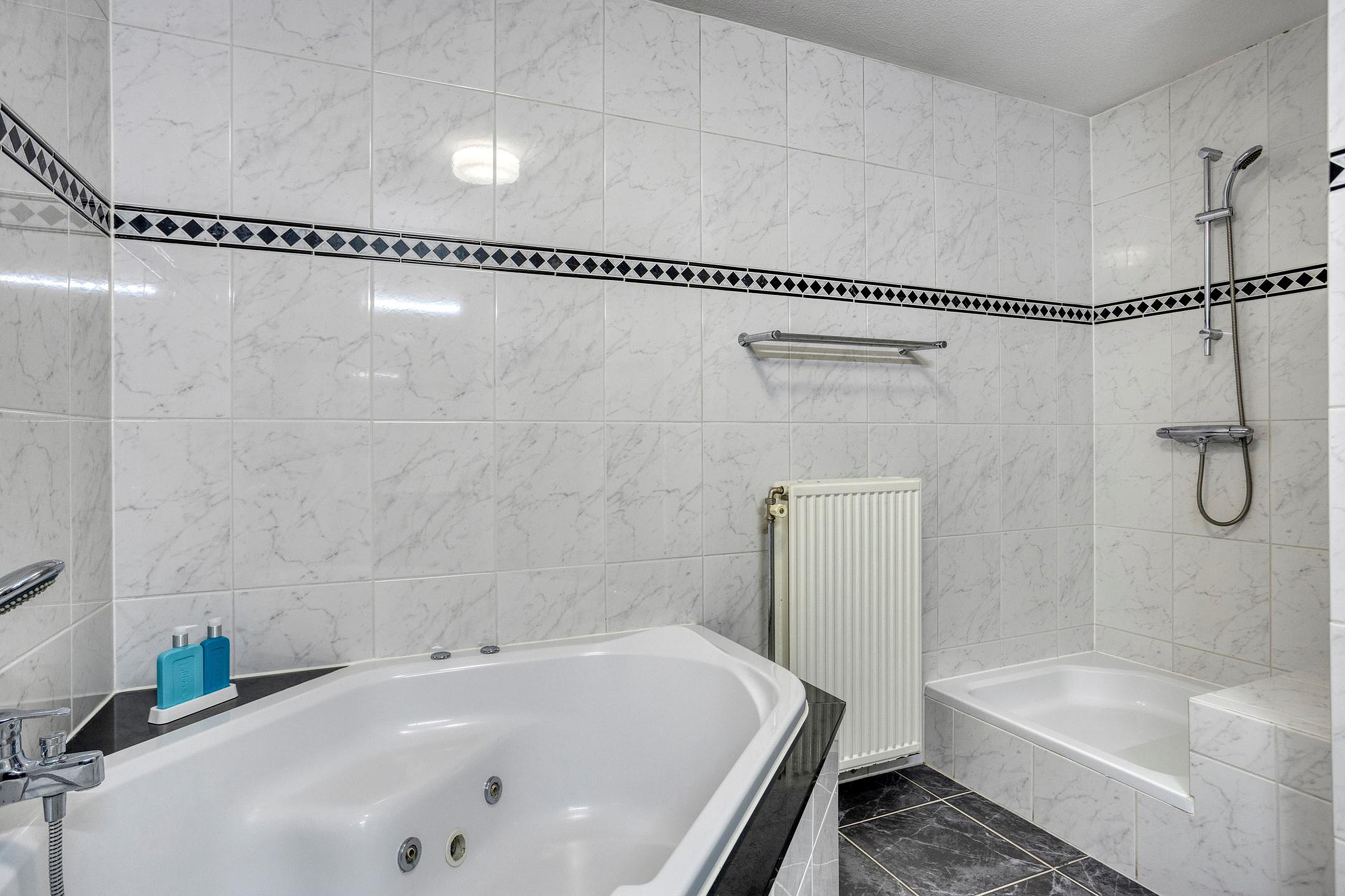 Via vaste trap te bereiken overloop met toilet, trapopgang naar de tweede verdieping en toegang tot 3 slaapkamers en de badkamer. De slaapkamers (ca. 14, 12 en 12m2) beschikken over keurige laminaatvloeren, hardhouten kozijnen met isolerende beglazing, rolluiken en op maat gemaakte horren. Nette, geheel betegelde badkamer (ca. 7m2) voorzien van een douche, wastafel met onderkast, Whirlpool, radiator en een spiegel. Het aparte toilet (ca. 1m2) is geheel betegeld en voorzien van een staand closet en een fonteintje.