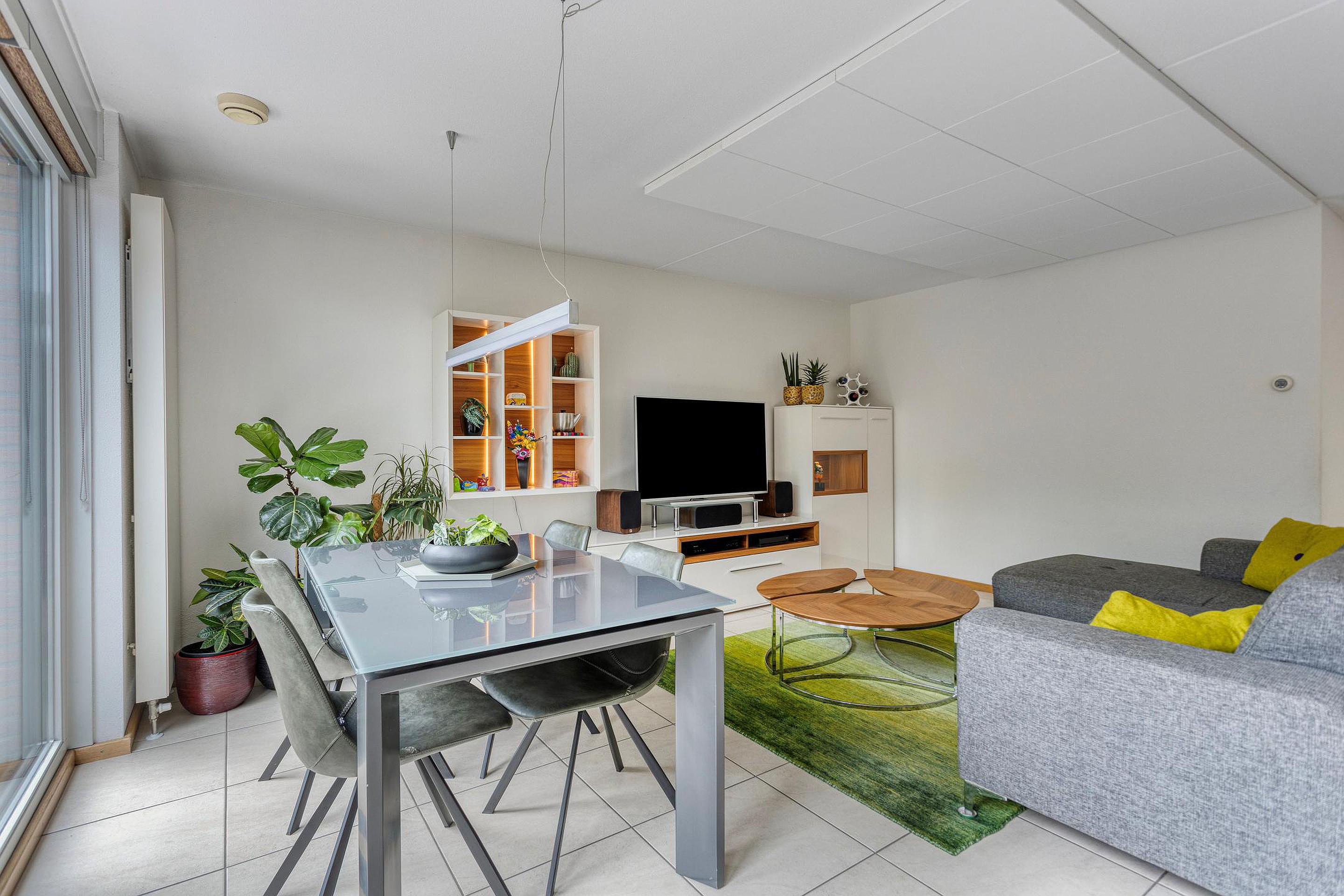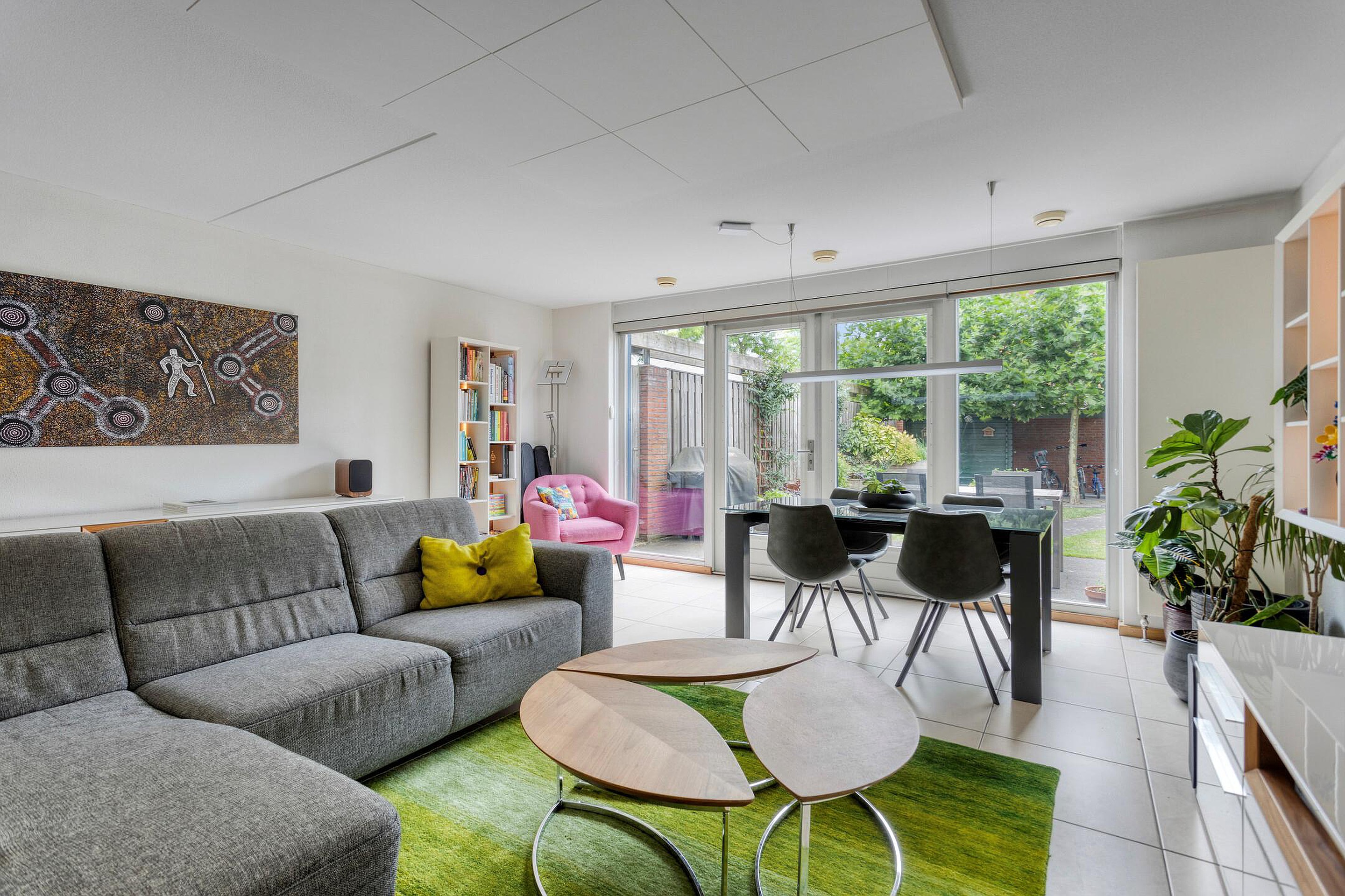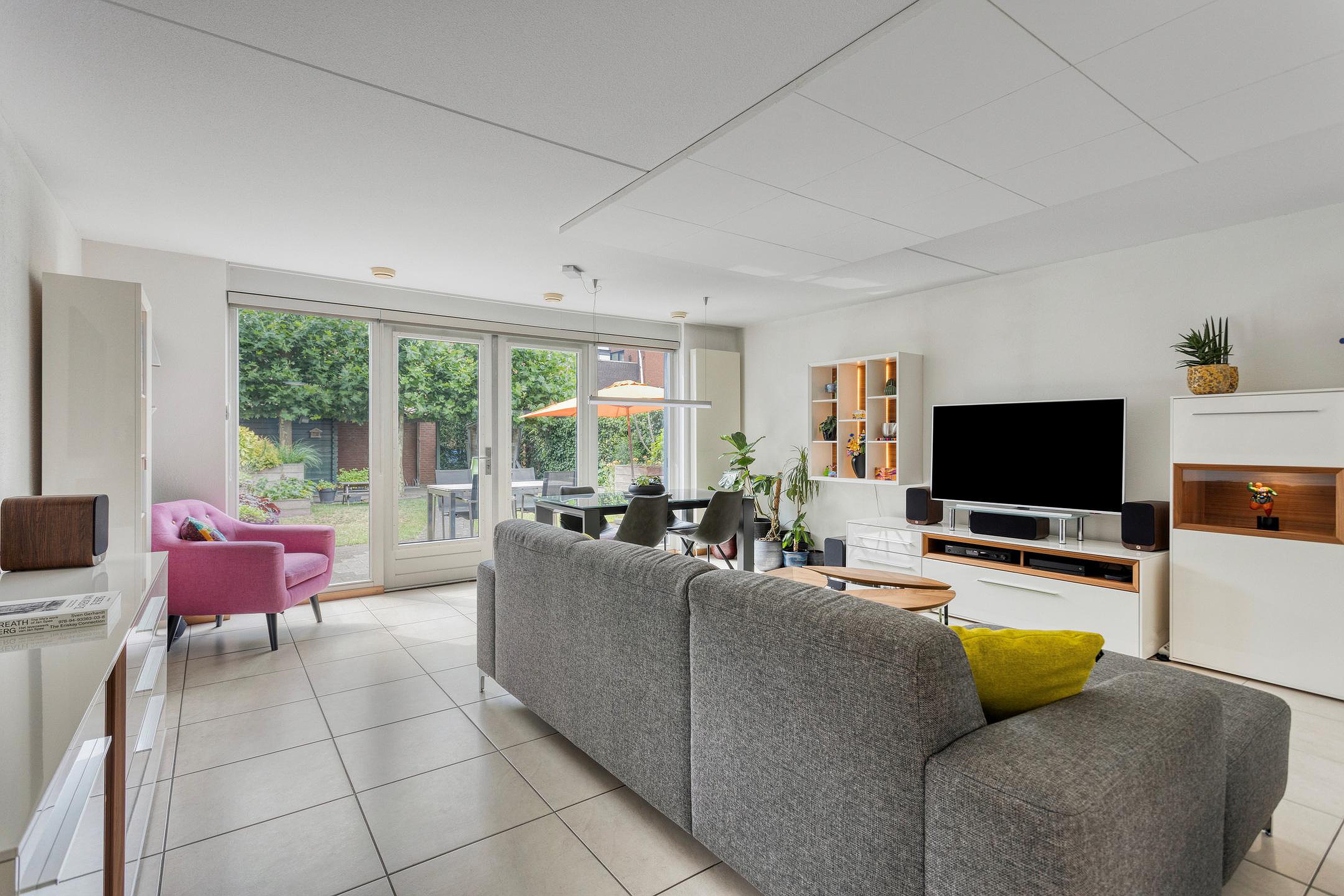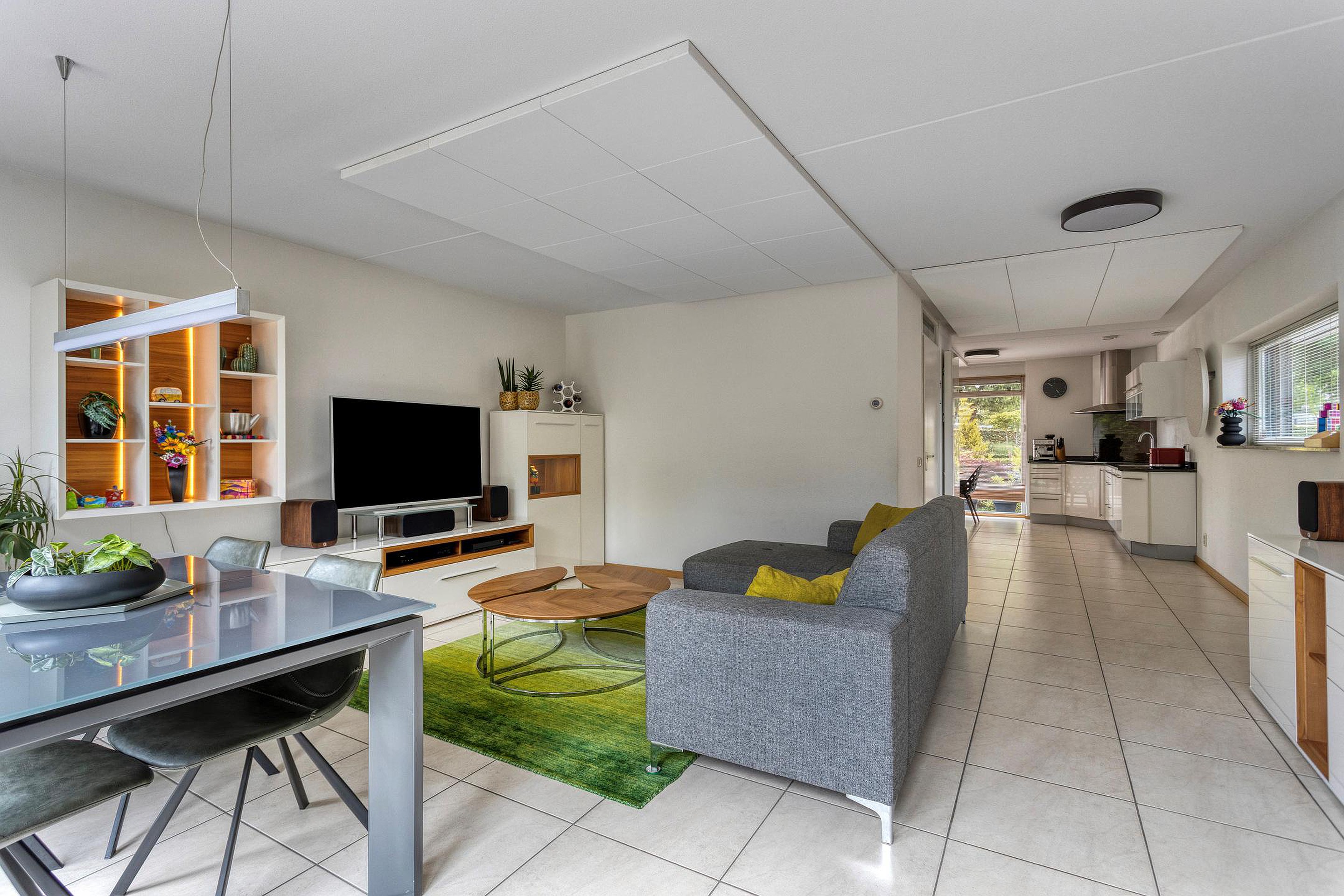 De royale woonkamer (32m2) is aan de achterzijde gelegen en is voorzien van een tegelvloer met vloerverwarming en akoestische panelen aan het plafond. Middels openslaande deuren is er directe toegang tot de achtertuin met een royaal terras met elektrisch zonnescherm, zij-ingang en een buitenberging.