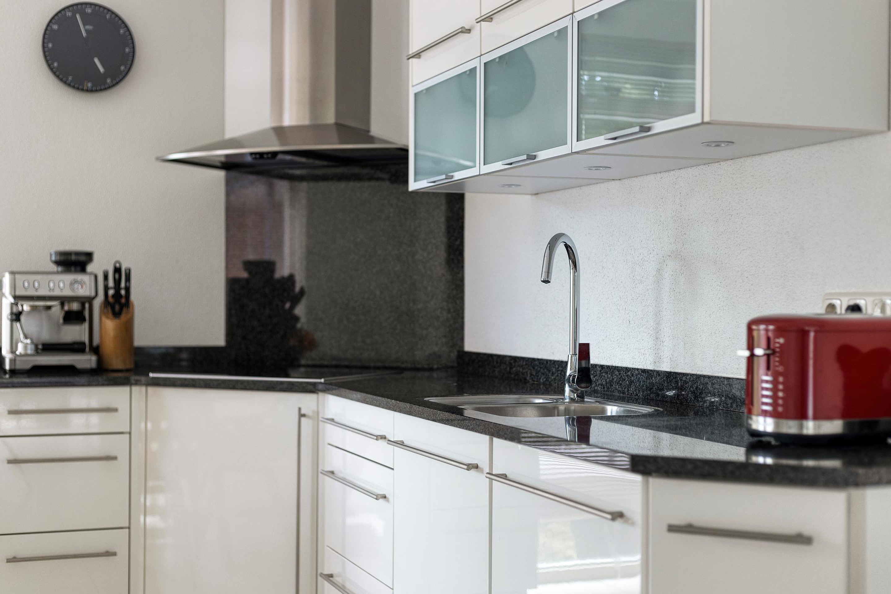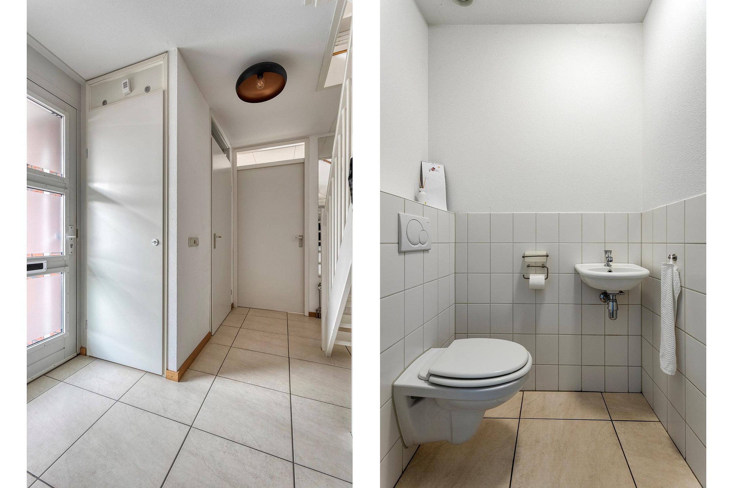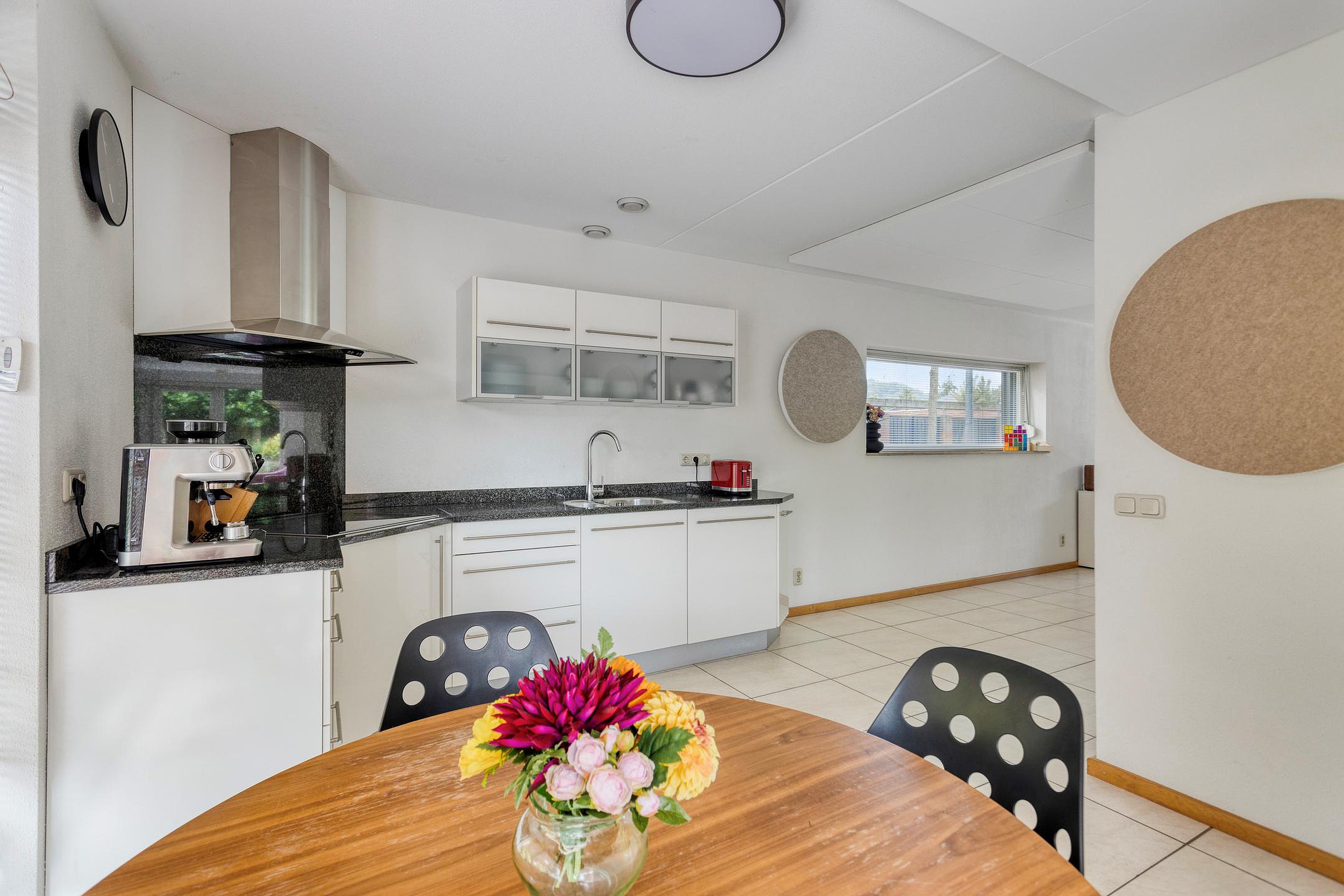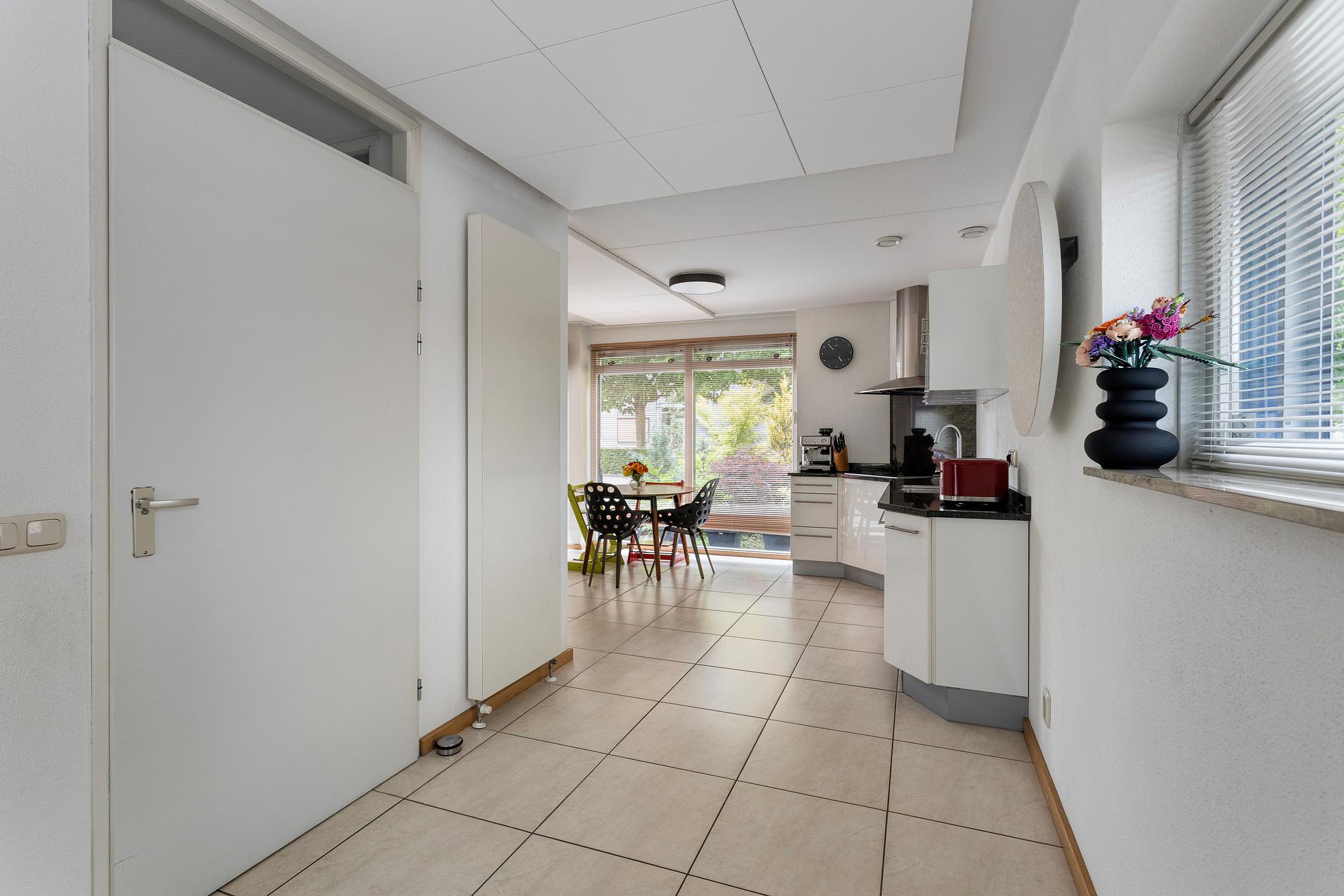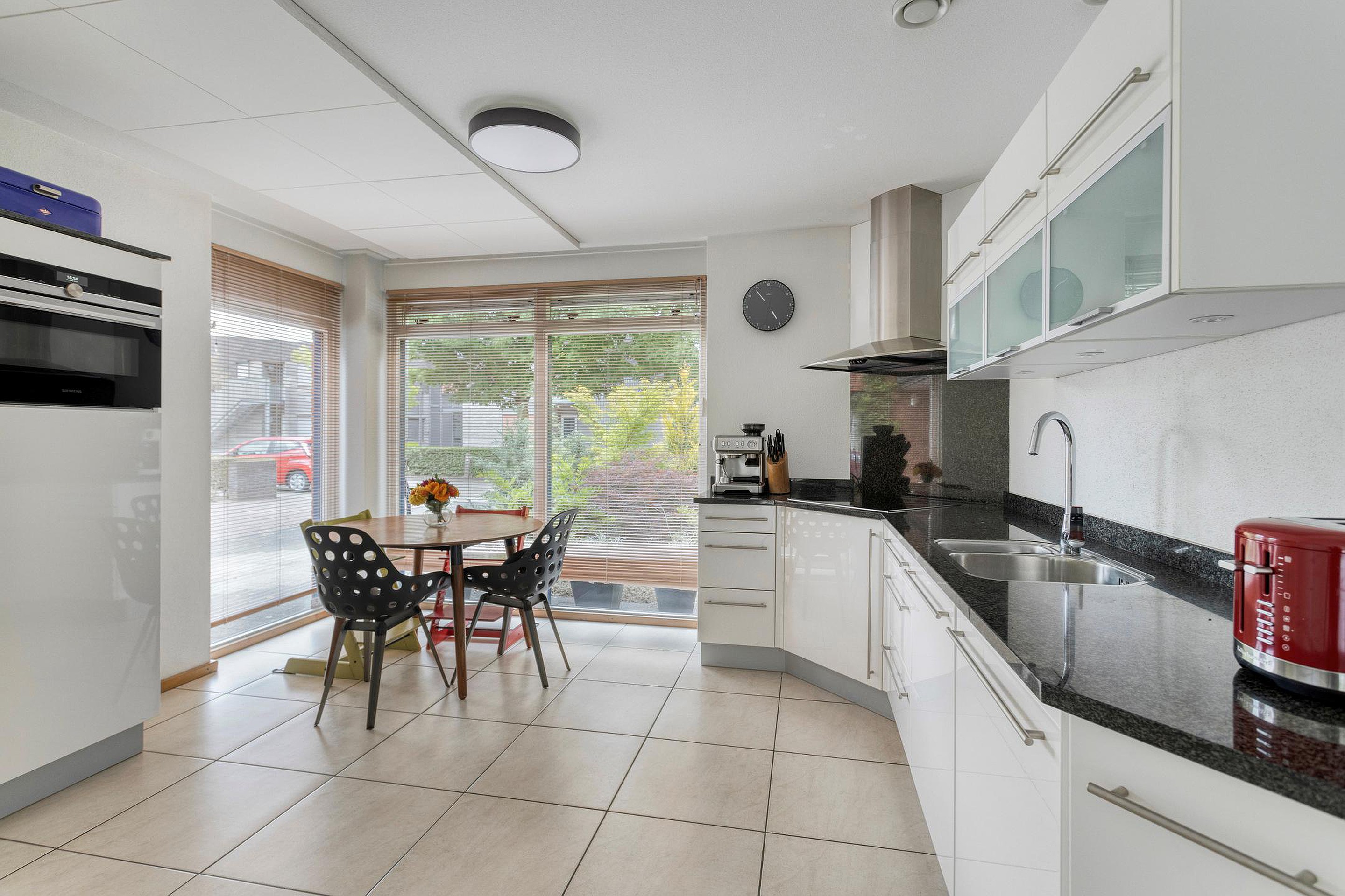 De oprit aan de voorzijde biedt toegang tot de woning via de entreehal, waar zich de meterkast en een separate toiletruimte bevinden met wandcloset en fonteintje. Middels toegangsdeur is de woonkamer te bereiken. Dankzij de grote ramen aan de voor-, zijgevel en achterzijde is het overvloed aan natuurlijk licht. De keuken (14m2) is gesitueerd aan de voorzijde en beschikt over een praktische hoekopstelling en een granieten aanrechtblad. De (inbouw)apparatuur omvat onder meer een 4-pits inductiekookplaat met afzuigkap, een vaatwasser, een stoomoven, een koelkast en een dubbele spoelbak.