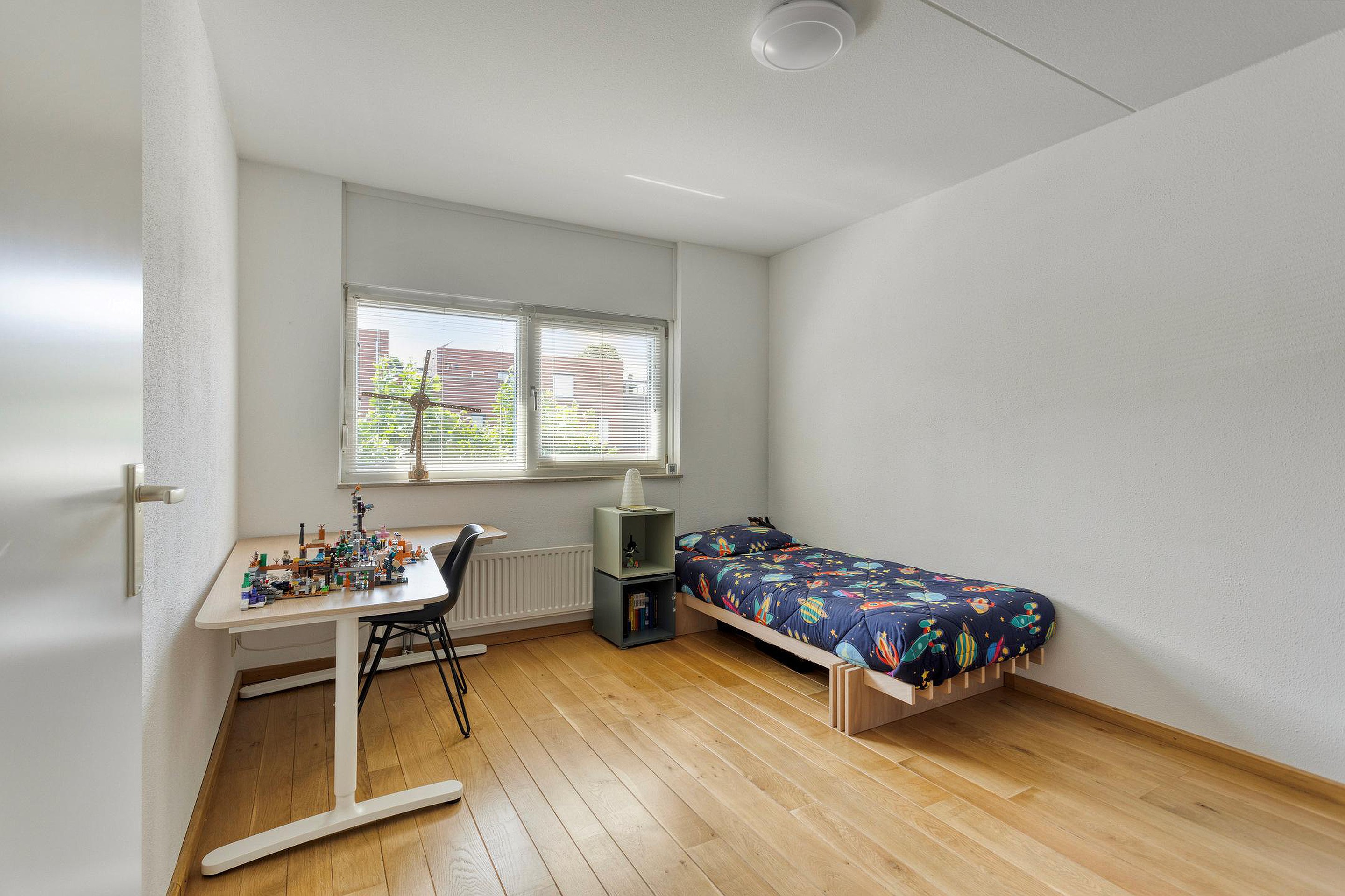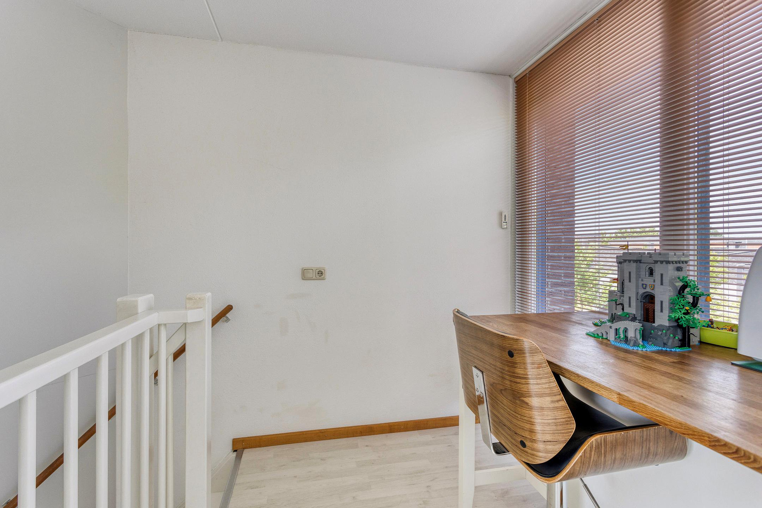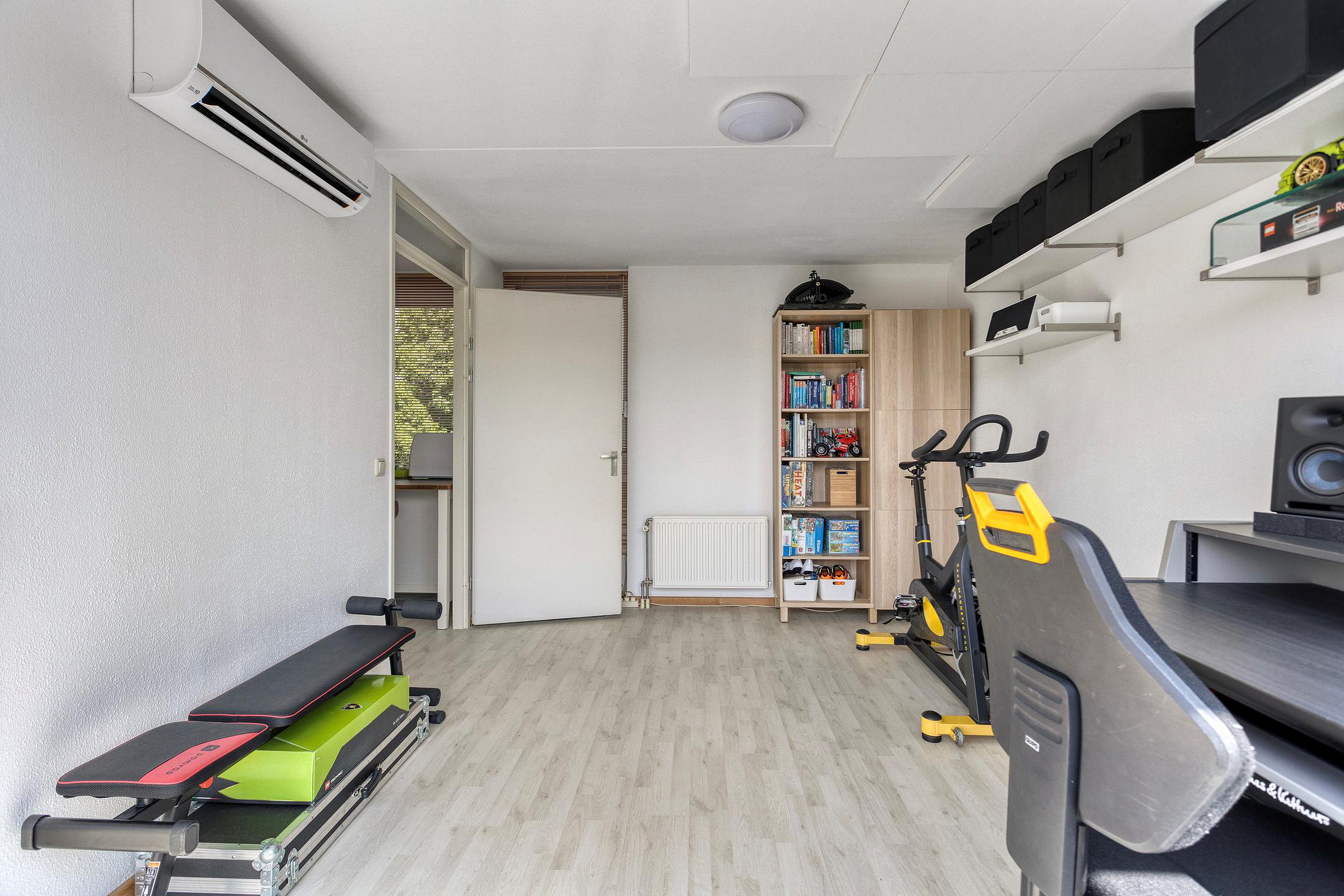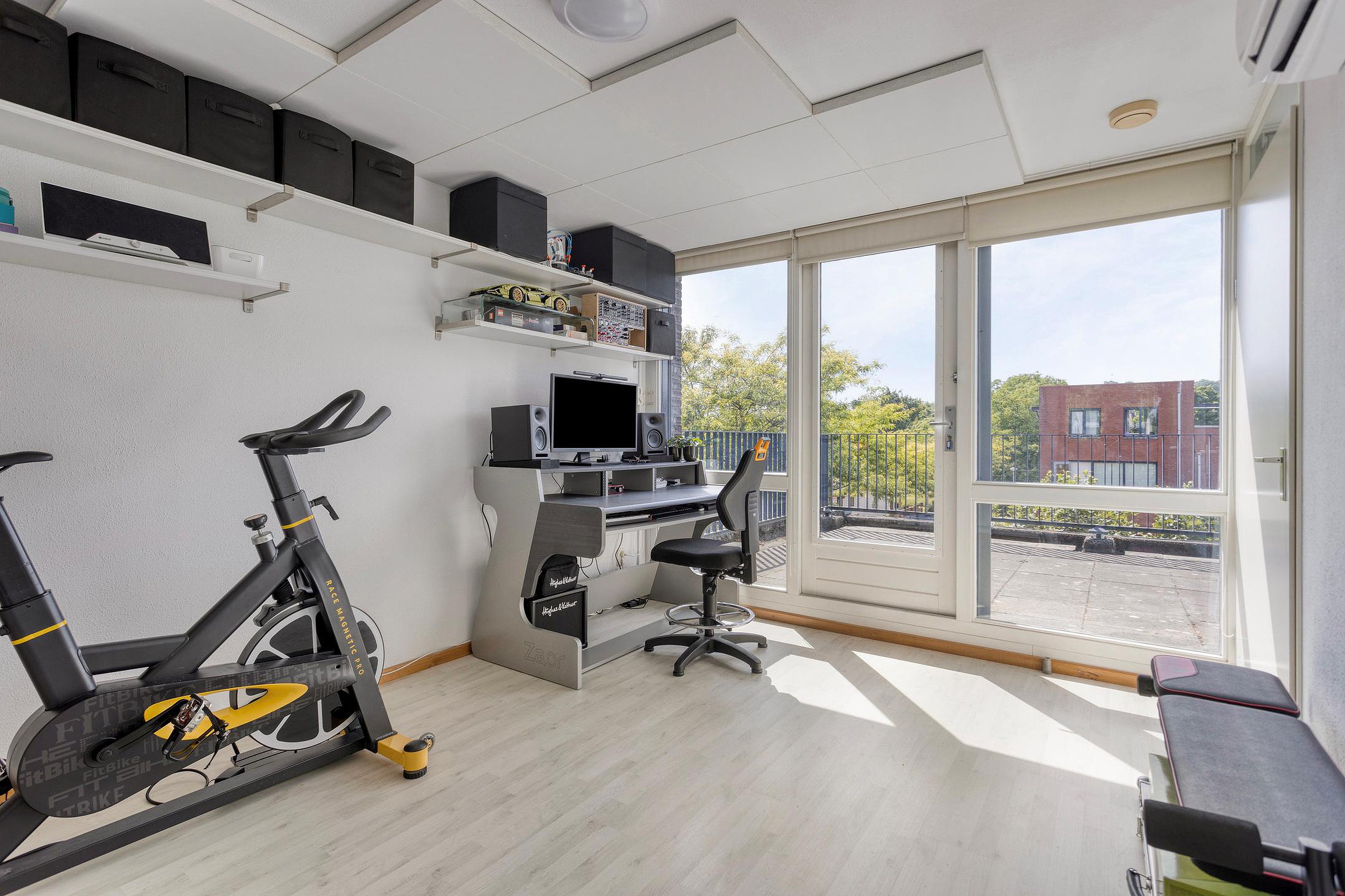 De tweede verdieping bestaat uit een royale overloop (6m2)met veel daglicht dankzij de grote raampartijen en een vierde (slaap)kamer (14m2) met airco en akoestische panelen aan het plafond. Deze kamer is momenteel in gebruik is als thuiswerkplek/kantoorruimte. Vanuit deze kamer is toegang tot een ruim dakterras van circa 20m2, een ideale plek om in de zomer te ontspannen in alle rust en privacy. Tevens bevindt zich op deze verdieping een aparte berging (3m2) met de WTW installatie, de c.v. ketel en de aansluitingen voor wasmachine en droger.