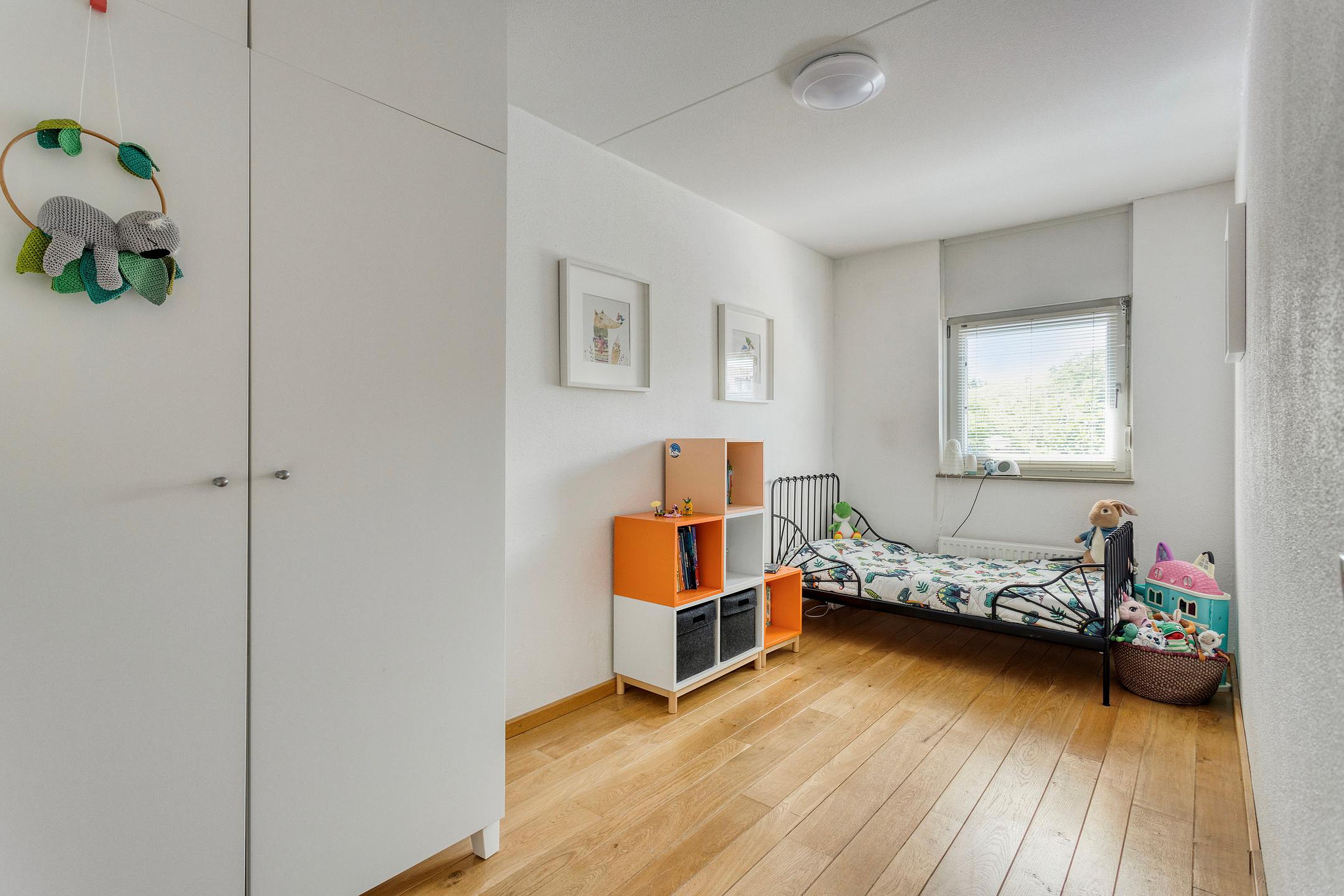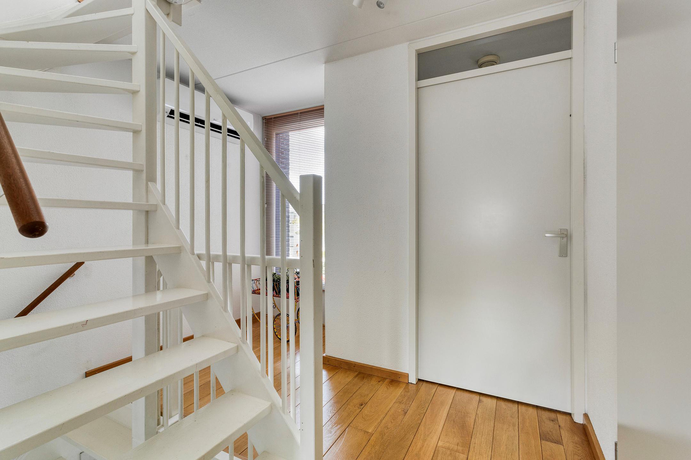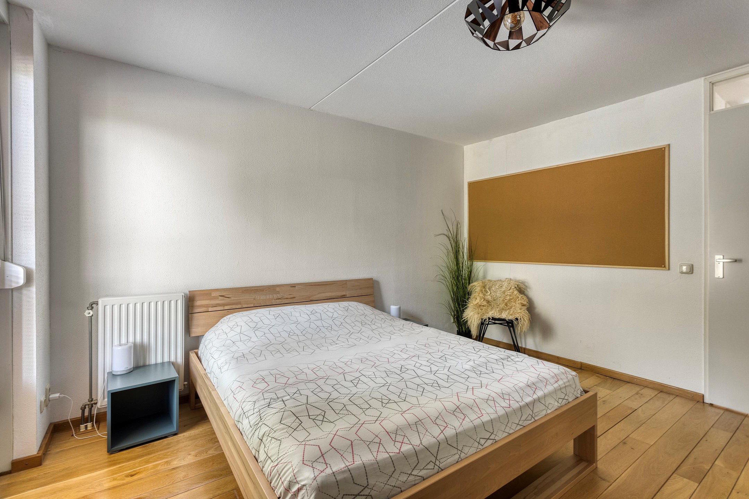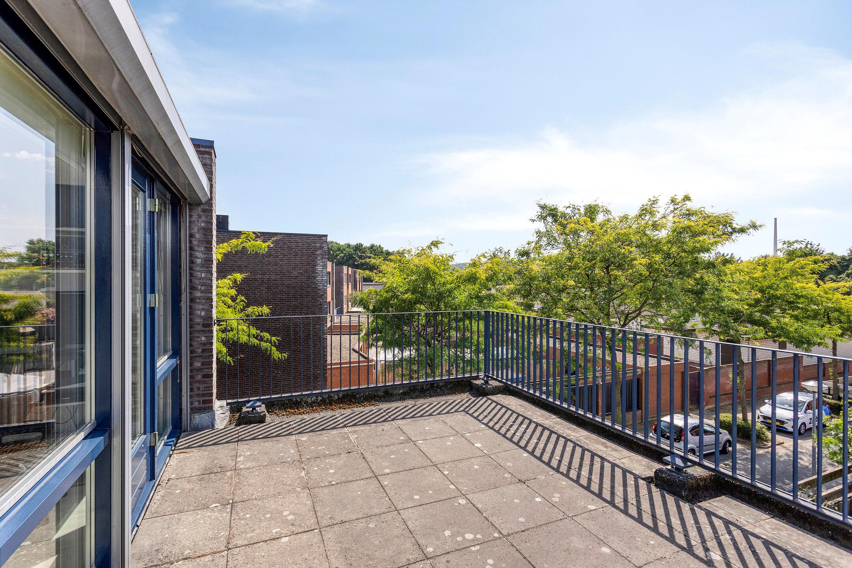 De tweede verdieping bestaat uit een royale overloop (6m2)met veel daglicht dankzij de grote raampartijen en een vierde (slaap)kamer (14m2) met airco en akoestische panelen aan het plafond. Deze kamer is momenteel in gebruik is als thuiswerkplek/kantoorruimte. Vanuit deze kamer is toegang tot een ruim dakterras van circa 20m2, een ideale plek om in de zomer te ontspannen in alle rust en privacy. Tevens bevindt zich op deze verdieping een aparte berging (3m2) met de WTW installatie, de c.v. ketel en de aansluitingen voor wasmachine en droger.