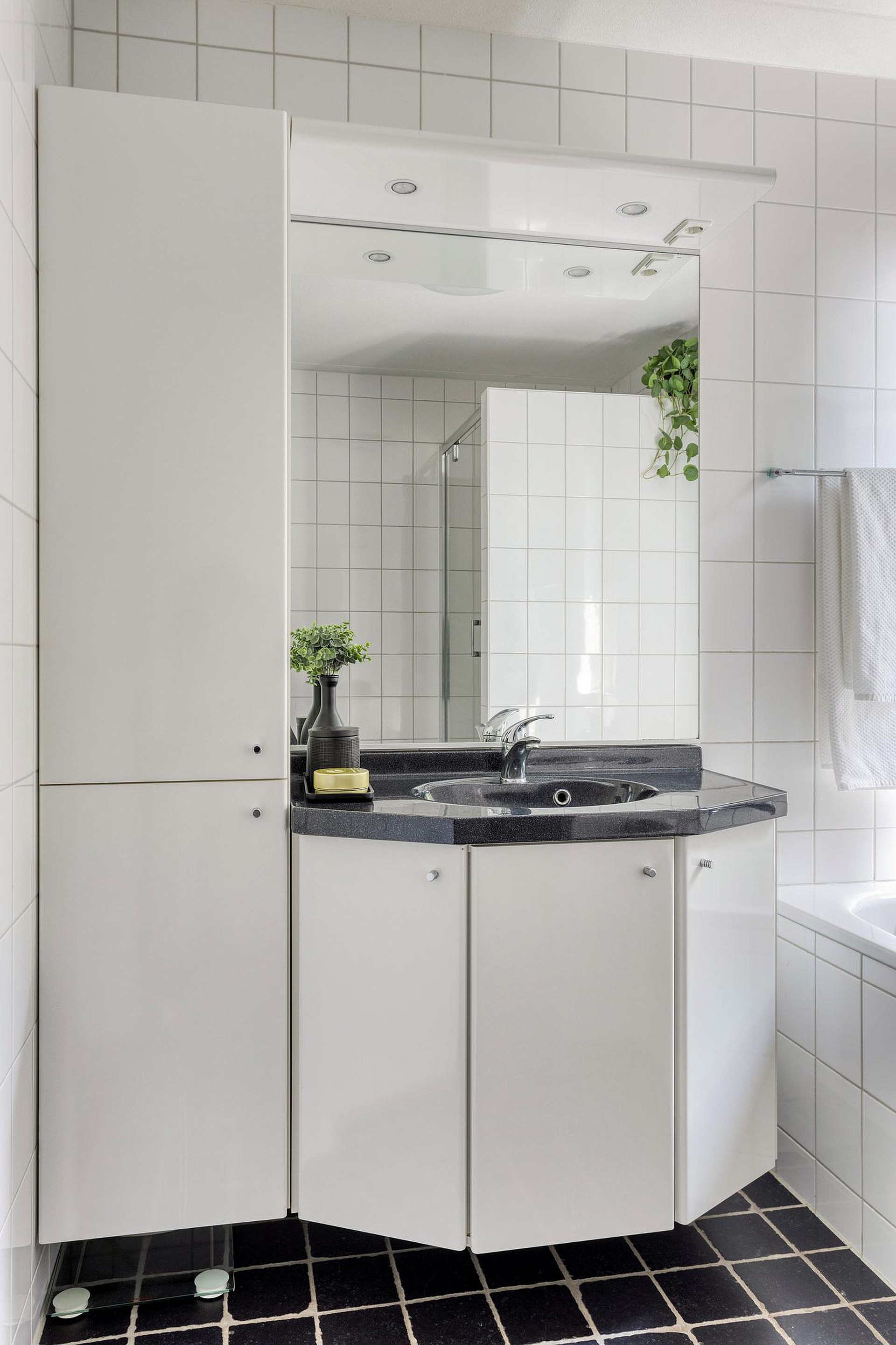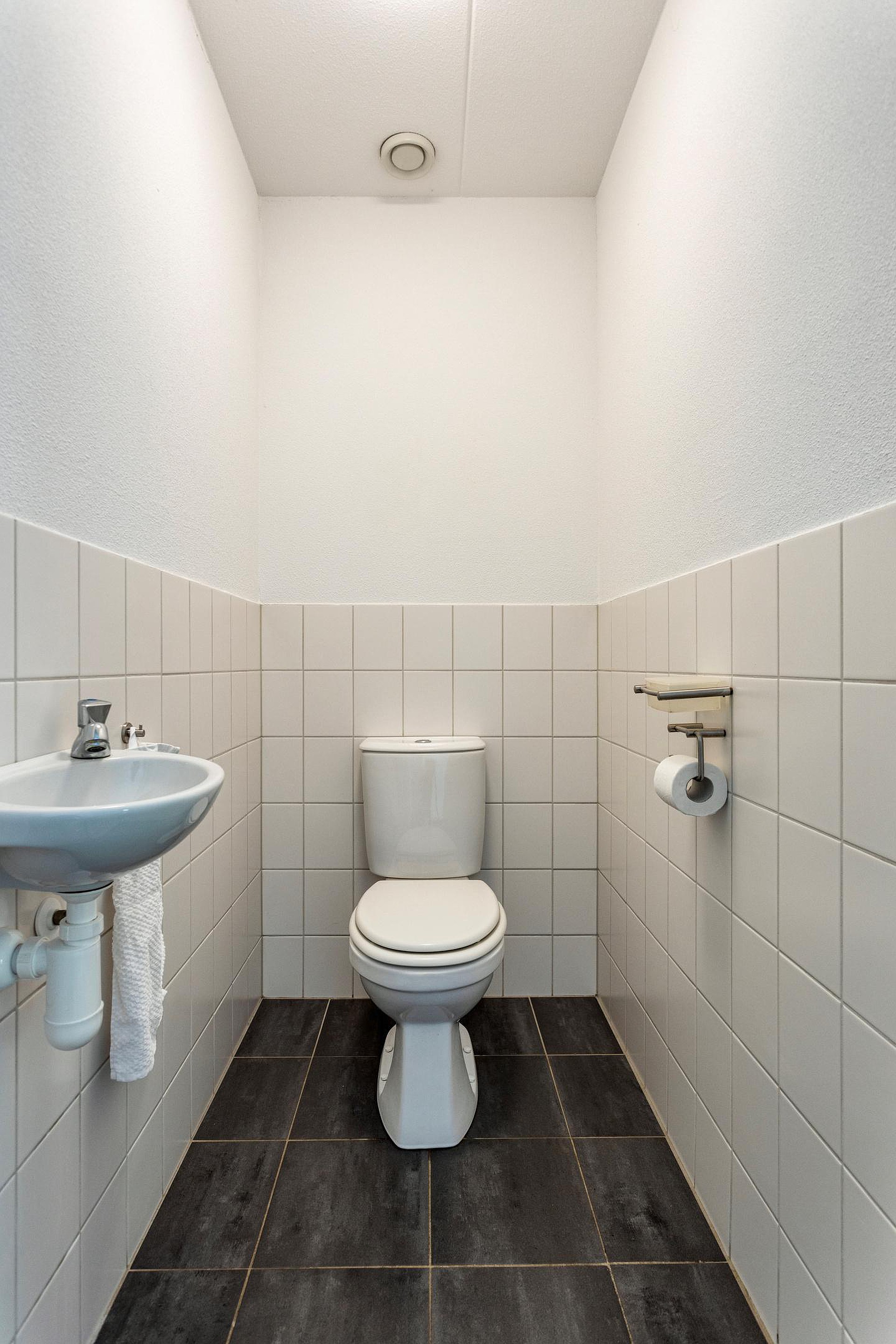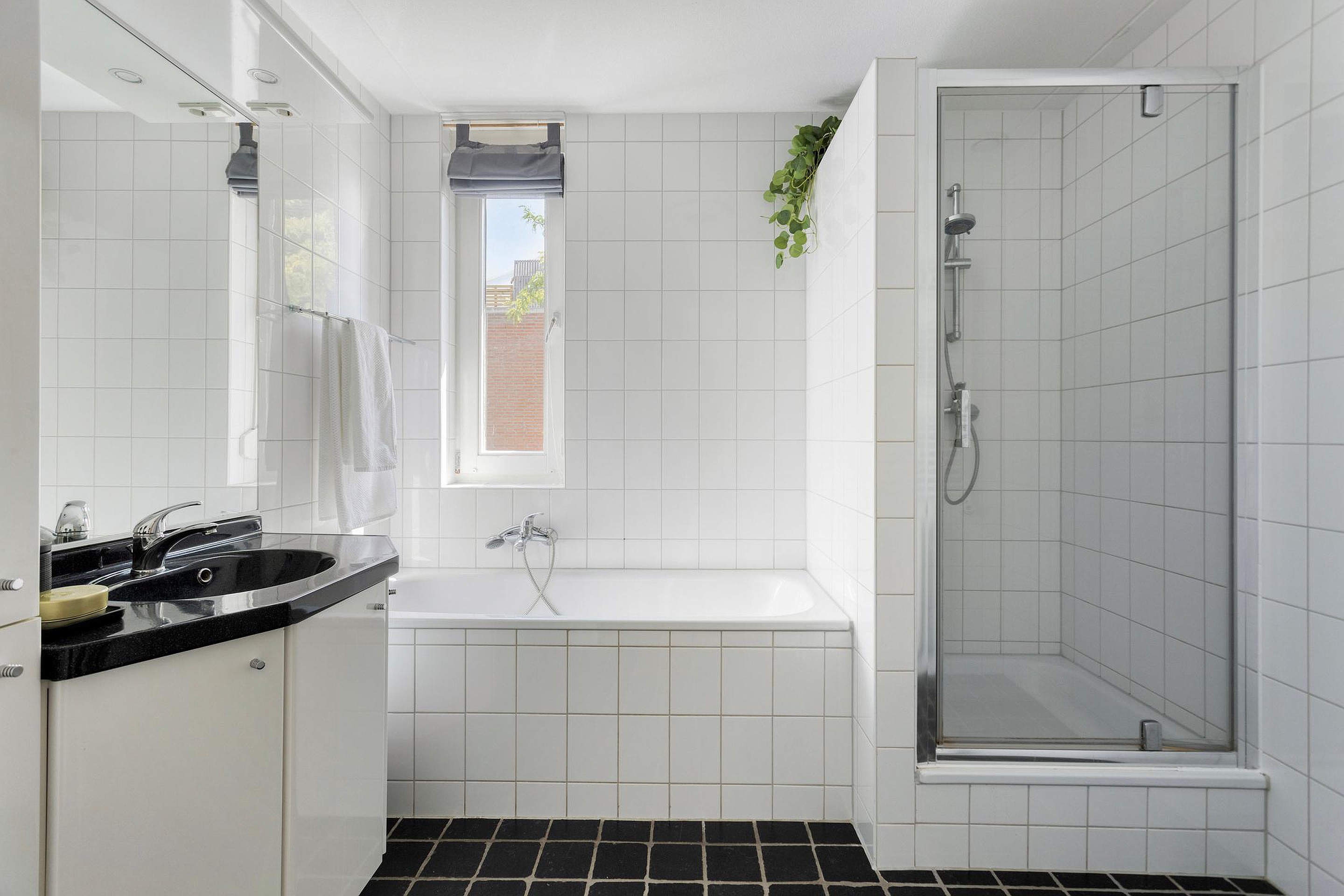 De badkamer (6m2) met daglichttoetreding is geheel betegeld, functioneel ingericht en beschikt over een een ligbad, een aparte douchecabine en een vaste wastafel in ombouwmeubel. Aansluitend toiletruimte met staand closet en fonteintje.