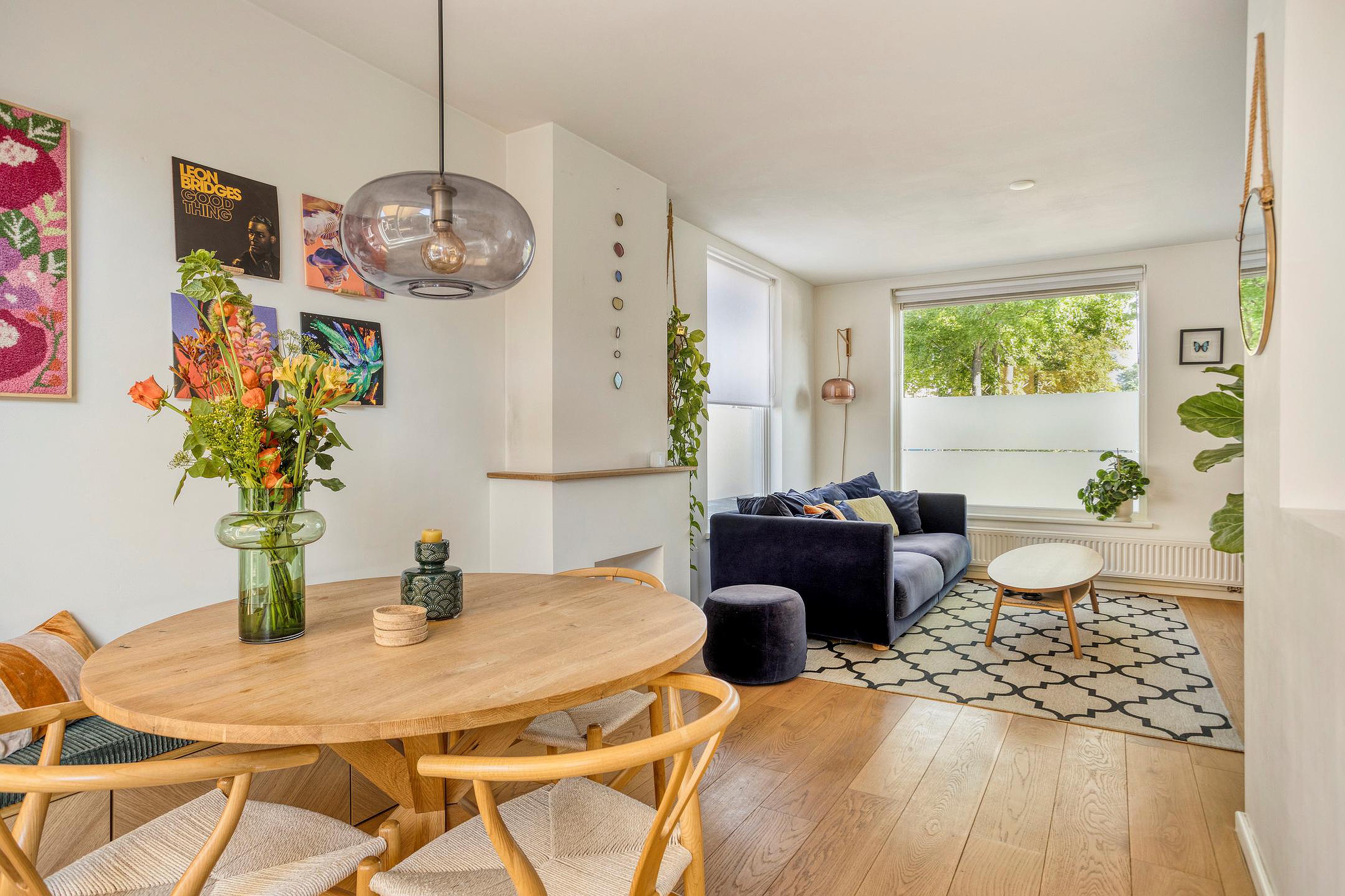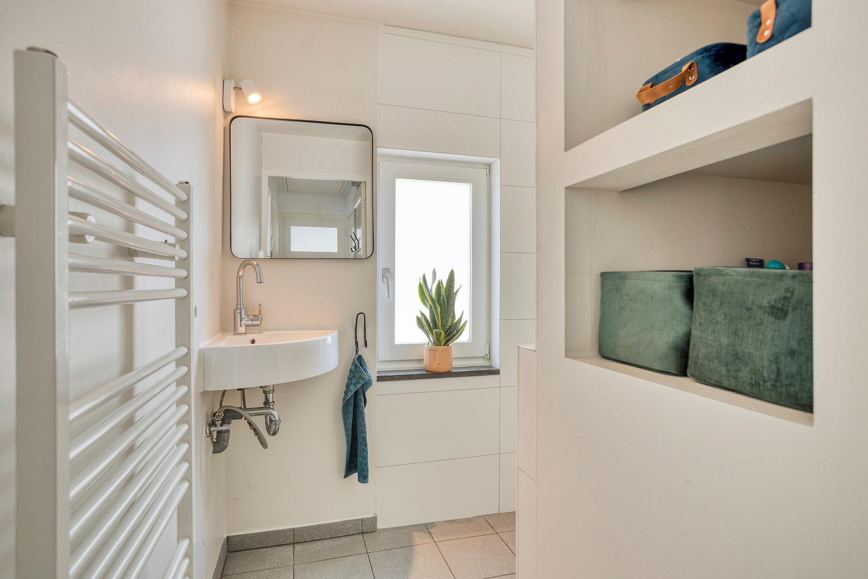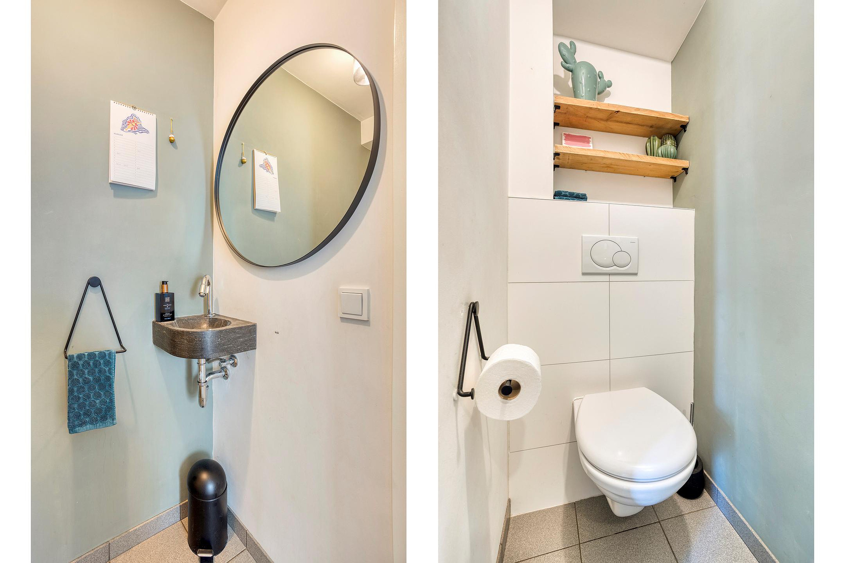 Entree met hal, meterkast en modern toilet voorzien van wandcloset en fonteintje. De woonkamer (23m2) kenmerkt zich door een prettige lichtinval dankzij de hoekligging en is afgewerkt met een houten vloer, wat zorgt voor een warme en verzorgde uitstraling.