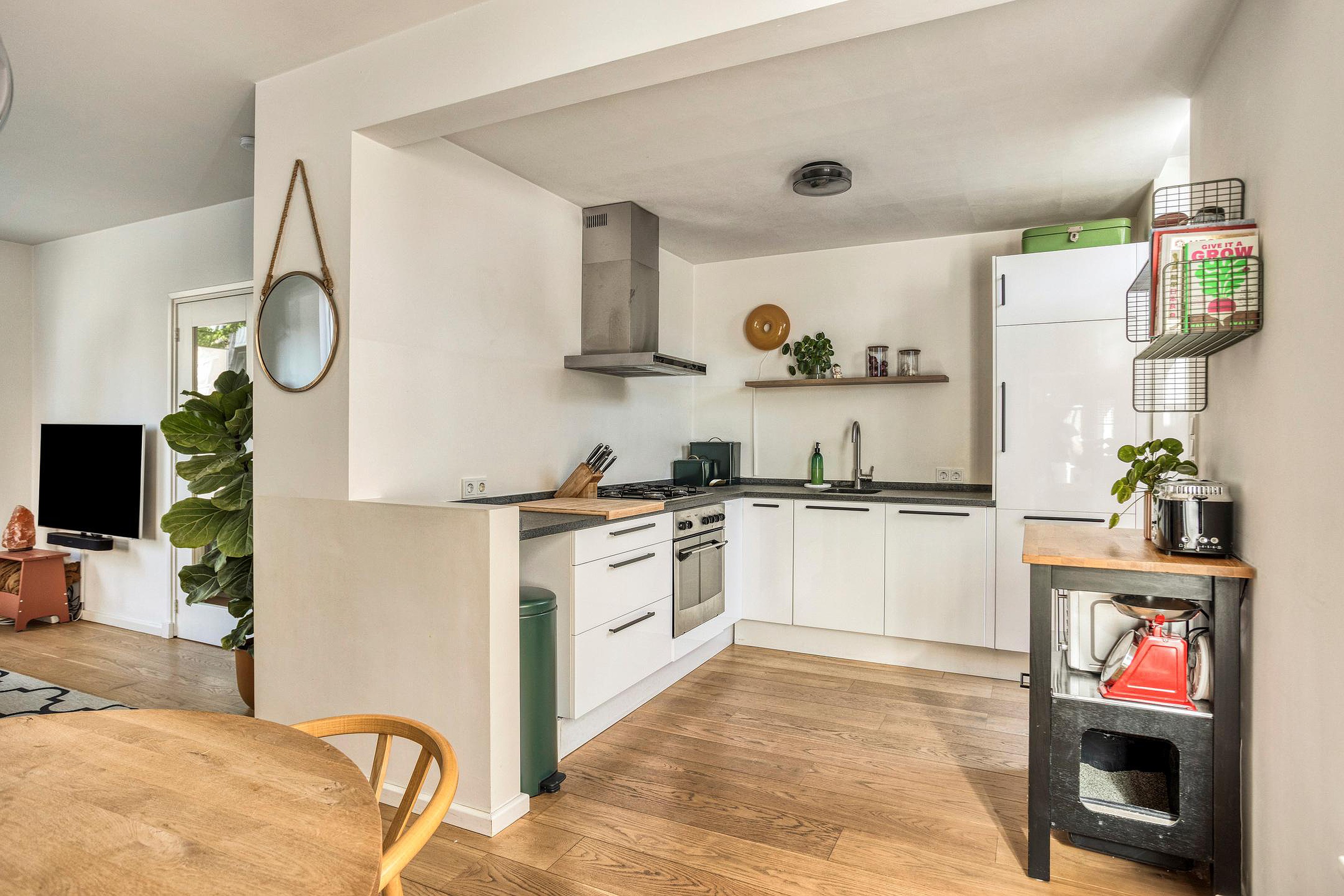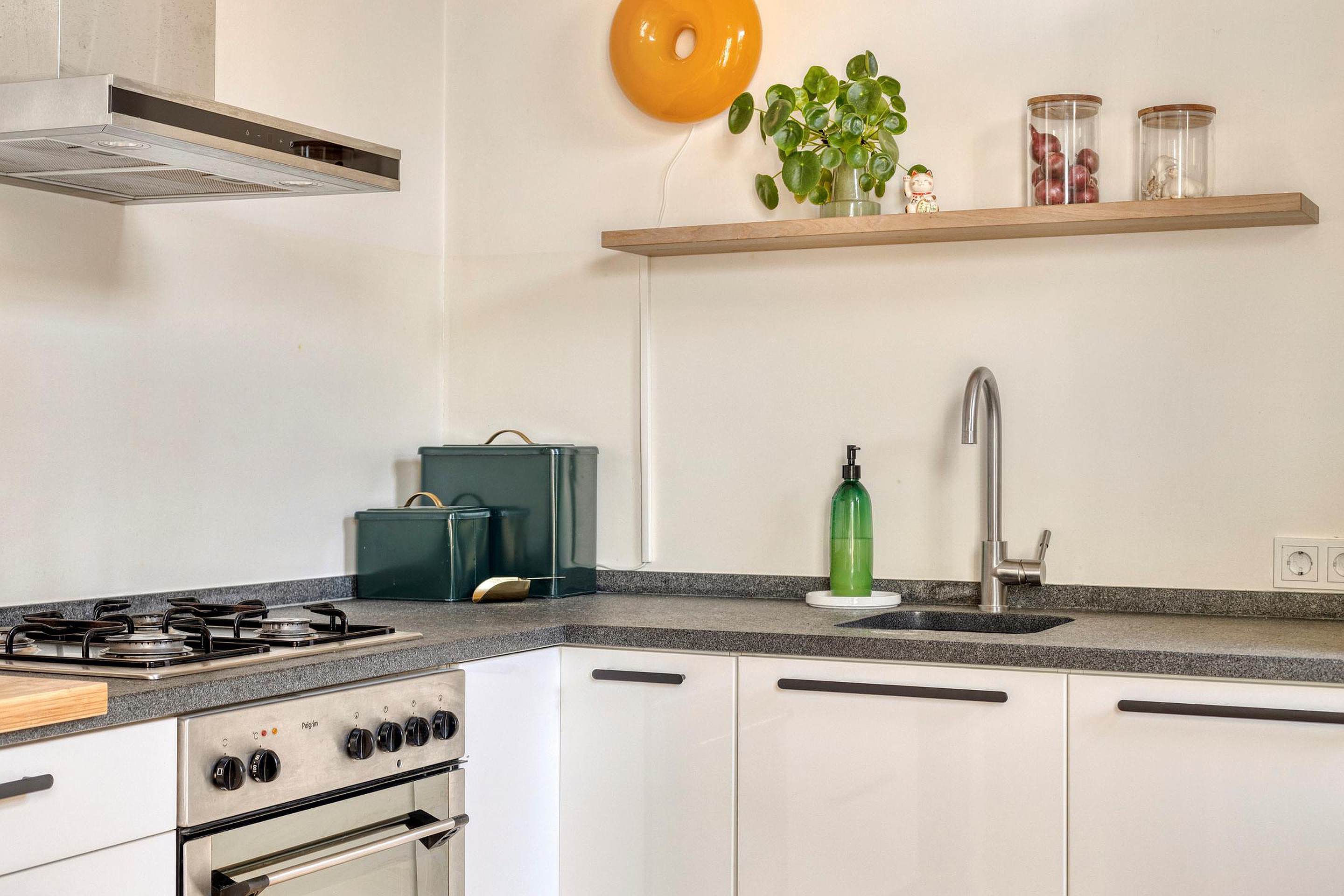 De moderne open keuken (7m2) is uitgevoerd in een hoekopstelling en voorzien van diverse inbouwapparatuur, waaronder een afzuigkap, 4-pits gasfornuis, oven, vaatwasser en koelkast. De keuken sluit naadloos aan op de woonkamer, wat bijdraagt aan een open en ruimtelijk gevoel.