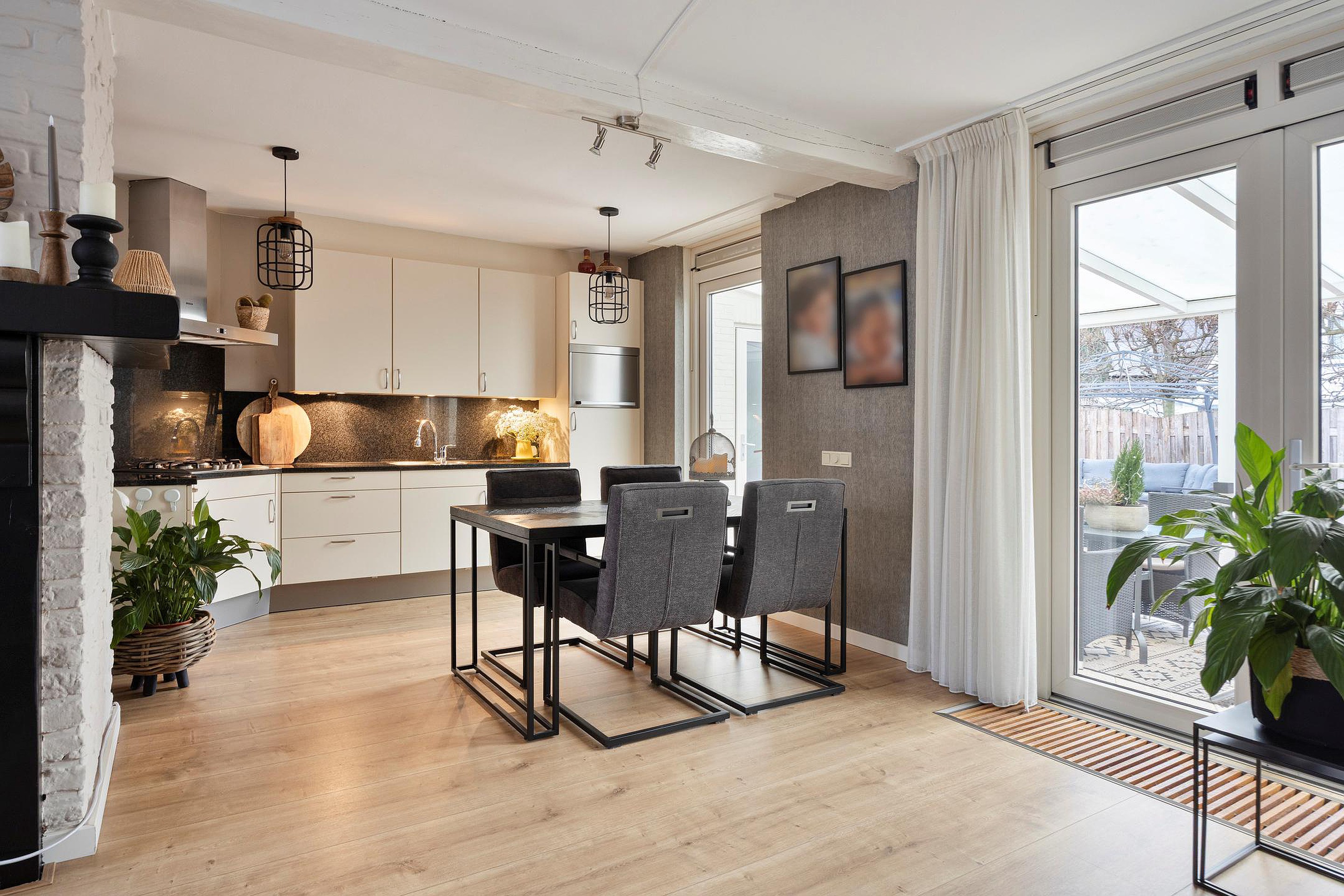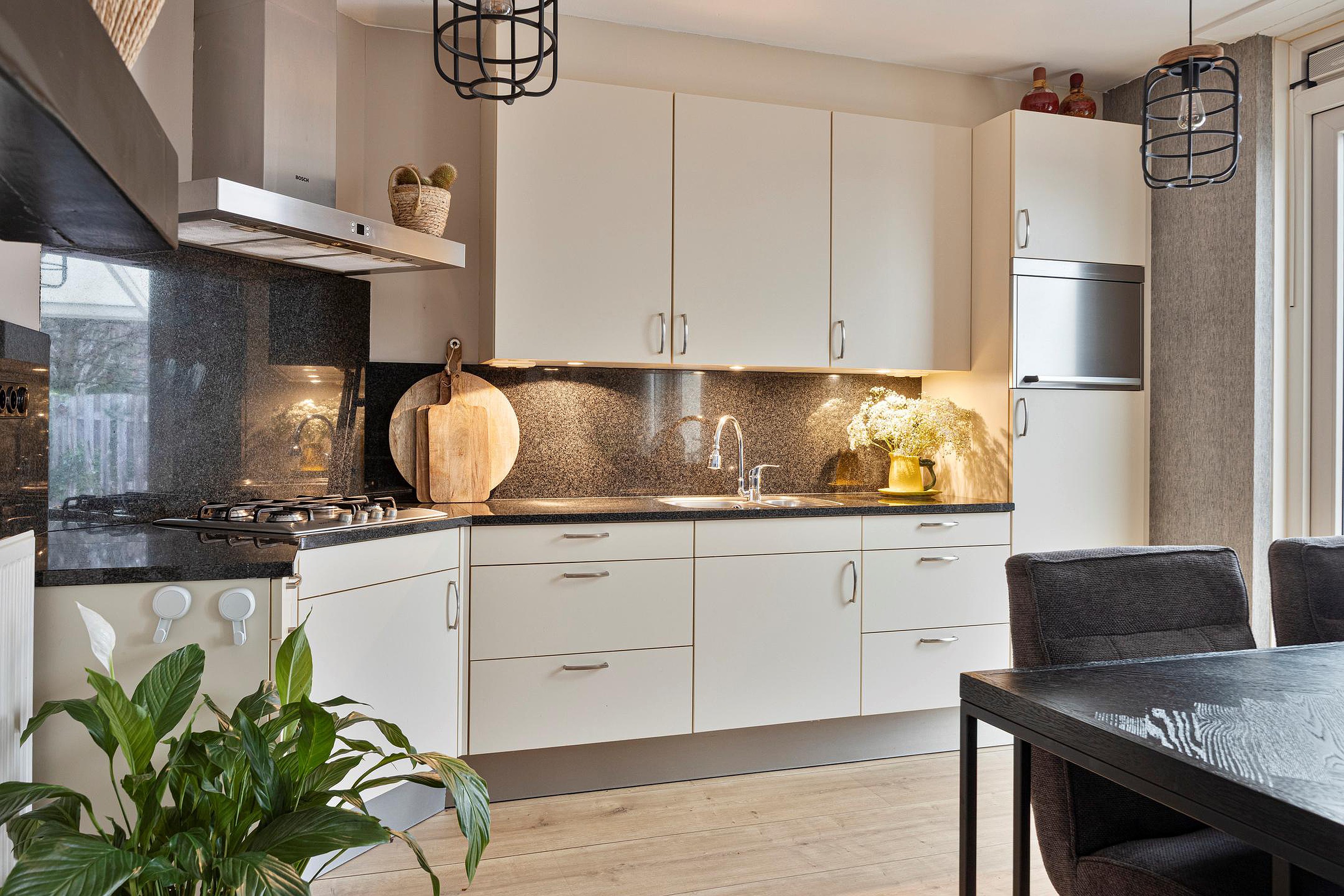 De open keuken van ca. 8 m2, opgesteld in een praktische hoekopstelling, is uitgerust met een granieten werkblad, dubbele spoelbak, 4-pits gasfornuis met afzuigkap en een koelkast. Zowel vanuit de keuken als de woonkamer geven openslaande deuren toegang tot de gezellige en onderhoudsvriendelijke achtertuin met overkapping. De tuin is gunstig gelegen op het oosten en biedt een heerlijke plek om te genieten van de ochtend- en middagzon.