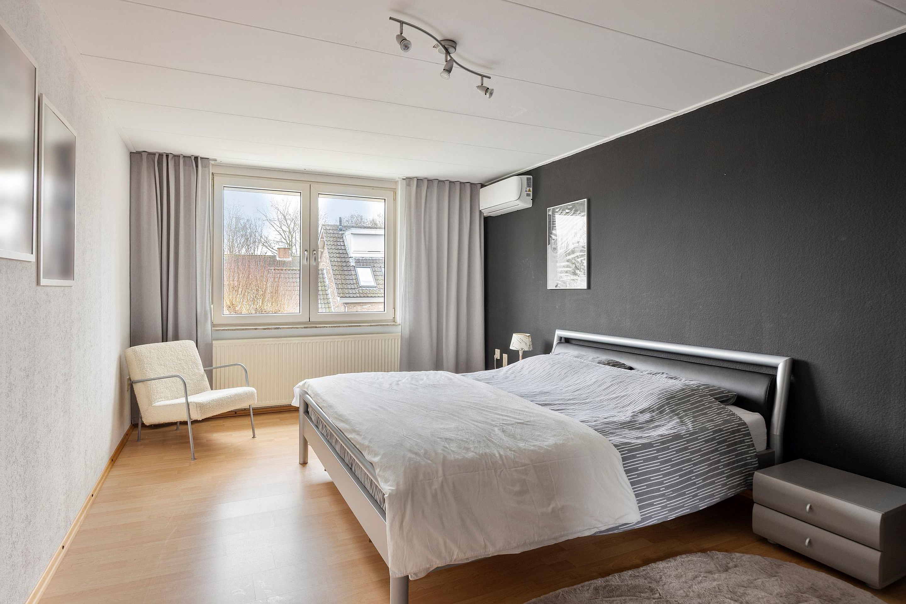 De royale master bedroom van ca. 18 m2, gelegen aan de achterzijde van de woning, is uitgerust met airconditioning voor extra comfort tijdens warme dagen. De overige twee slaapkamers (ca. 11 m2 en 9 m2) zijn afgewerkt met een onderhoudsvriendelijke kurkvloer. De slaapkamer aan de voorzijde beschikt over een dakkapel, wat zorgt voor extra ruimte en licht.