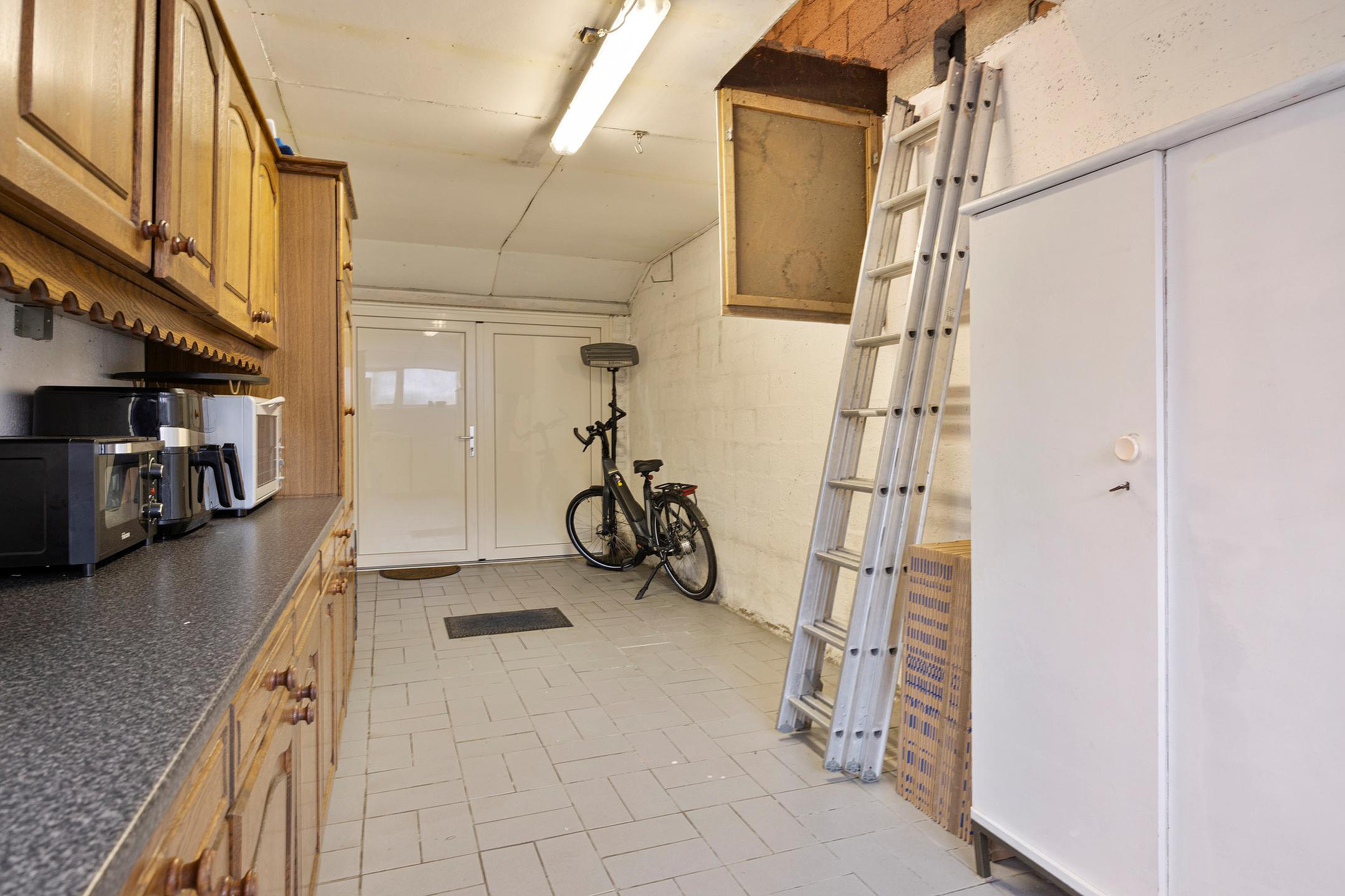De ruime garage van ca. 21 m2 is bereikbaar vanuit zowel de tuin als de oprit en beschikt over water, elektra, een wasmachineaansluiting en een eenvoudig keukenblok. Tevens is hier de vaatwasser geplaatst. Boven de garage bevindt zich een extra vliering, ideaal voor aanvullende bergruimte.