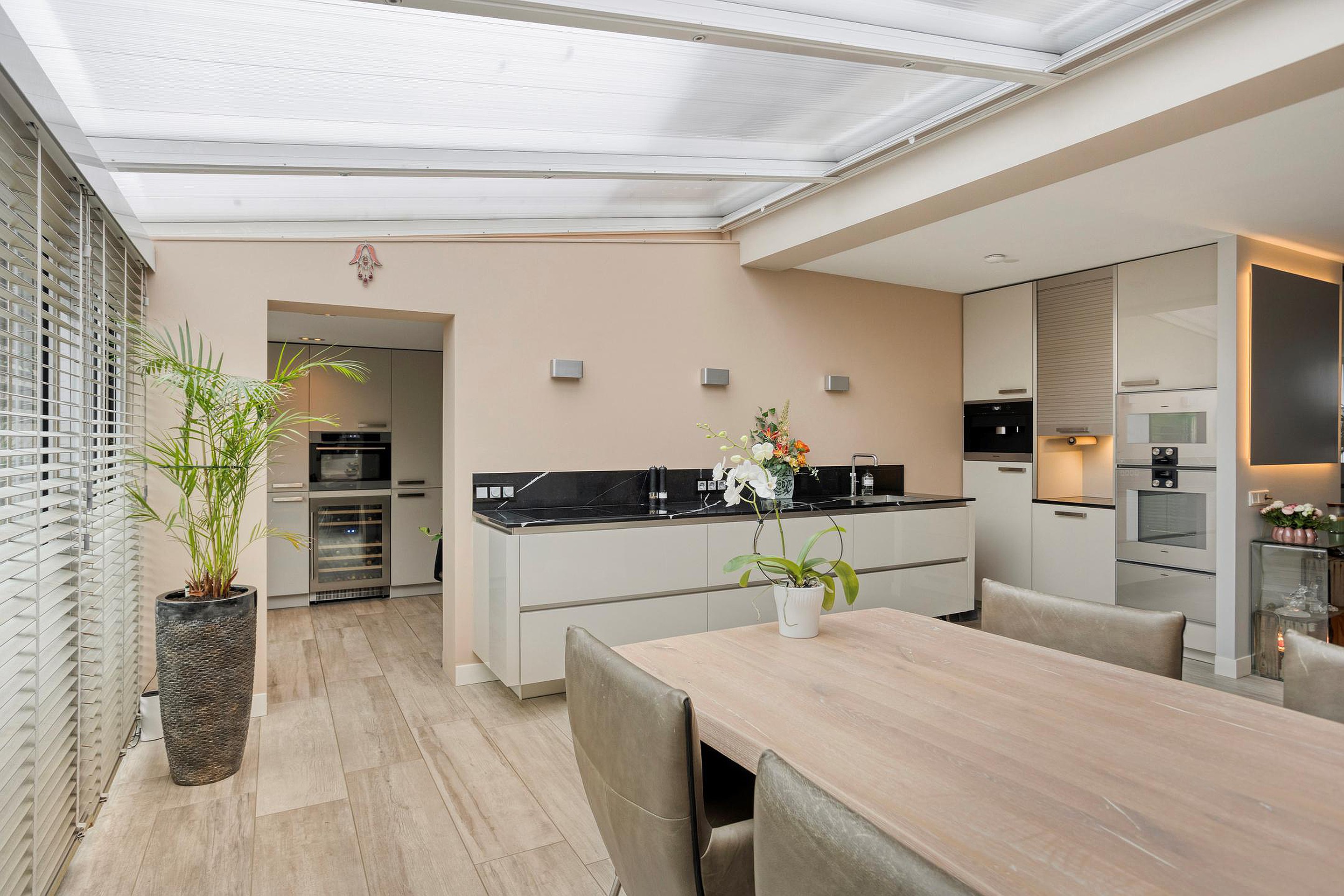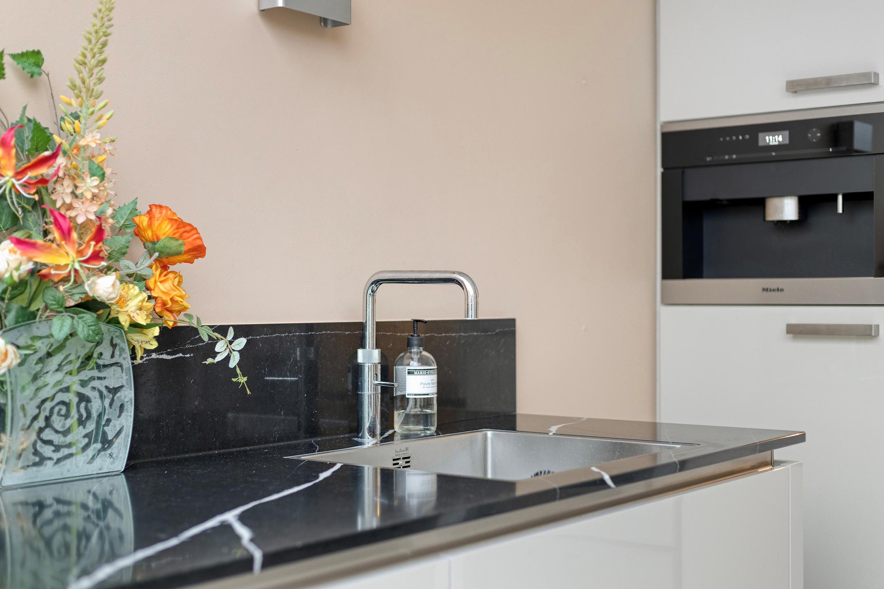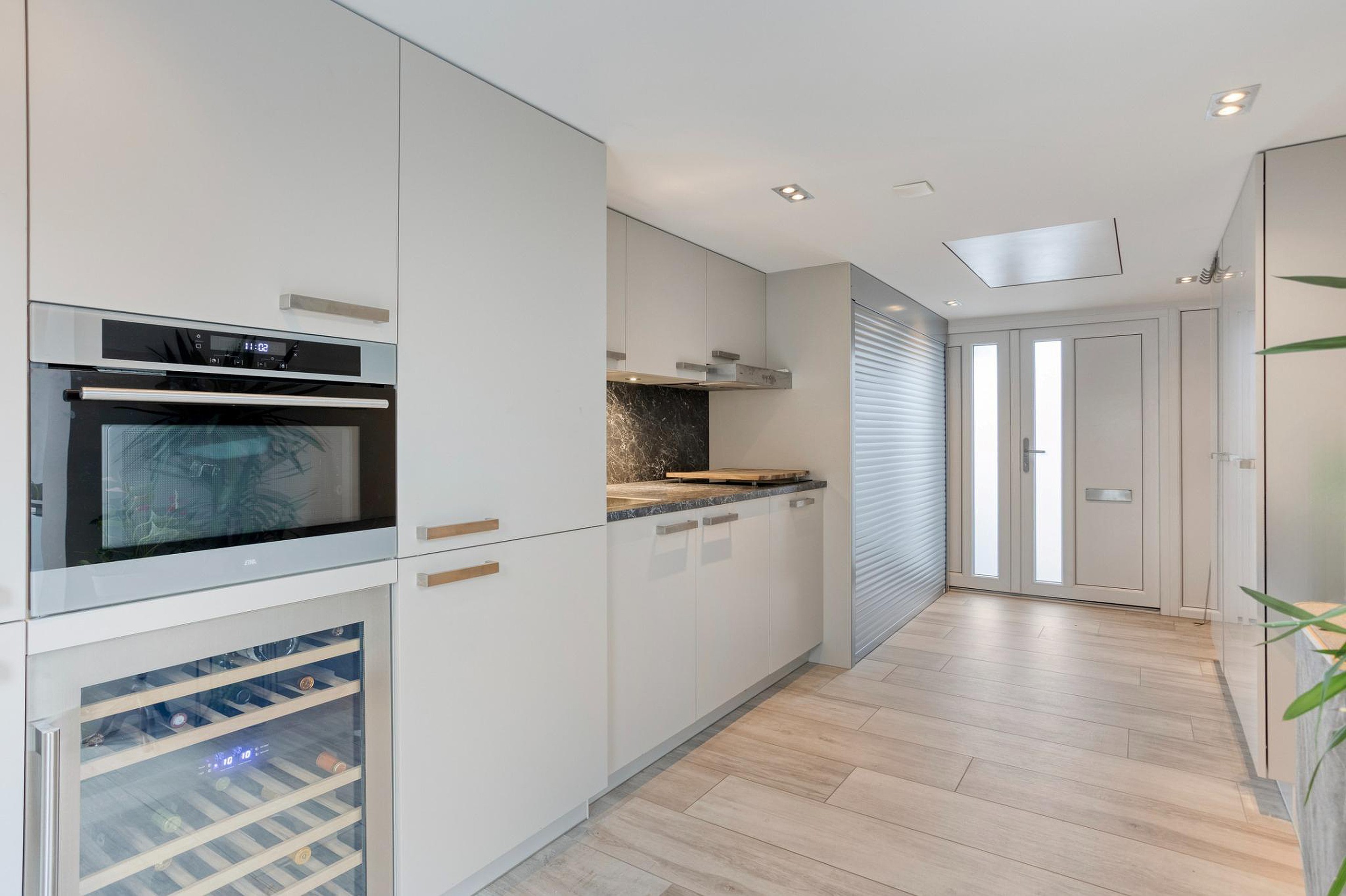De moderne open keuken (9m2) in hoekopstelling is van alle gemakken voorzien, waaronder een composiet aanrechtblad, spoelbak, Quooker, 4-pits inductiekookplaat met geïntegreerde afzuigkap (filter), stoomoven, oven, warmhoudlade, vaatwasser, ingebouwd koffieapparaat en koelkast. Vanuit de uitbouw biedt een schuifpui directe toegang tot de tuin.