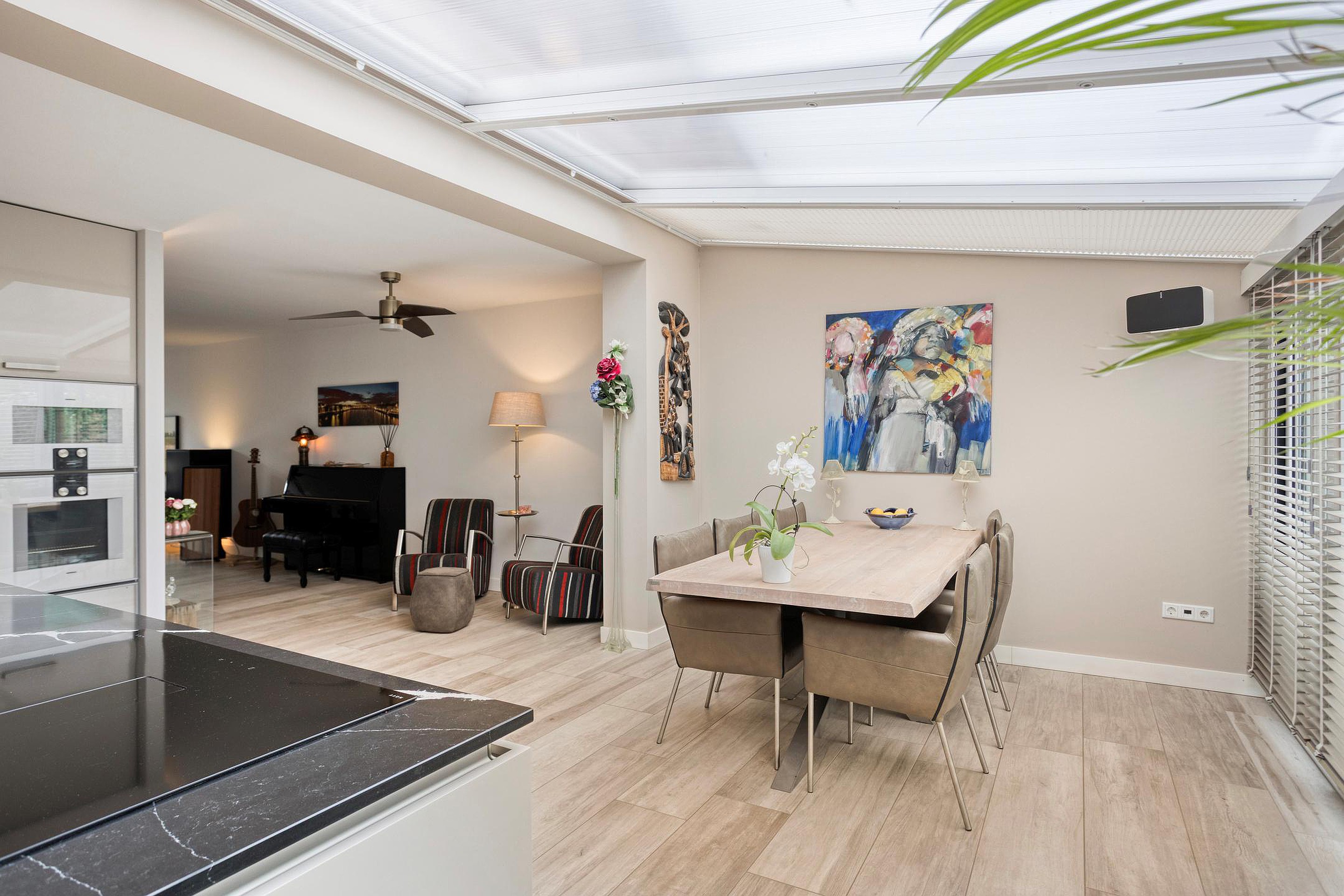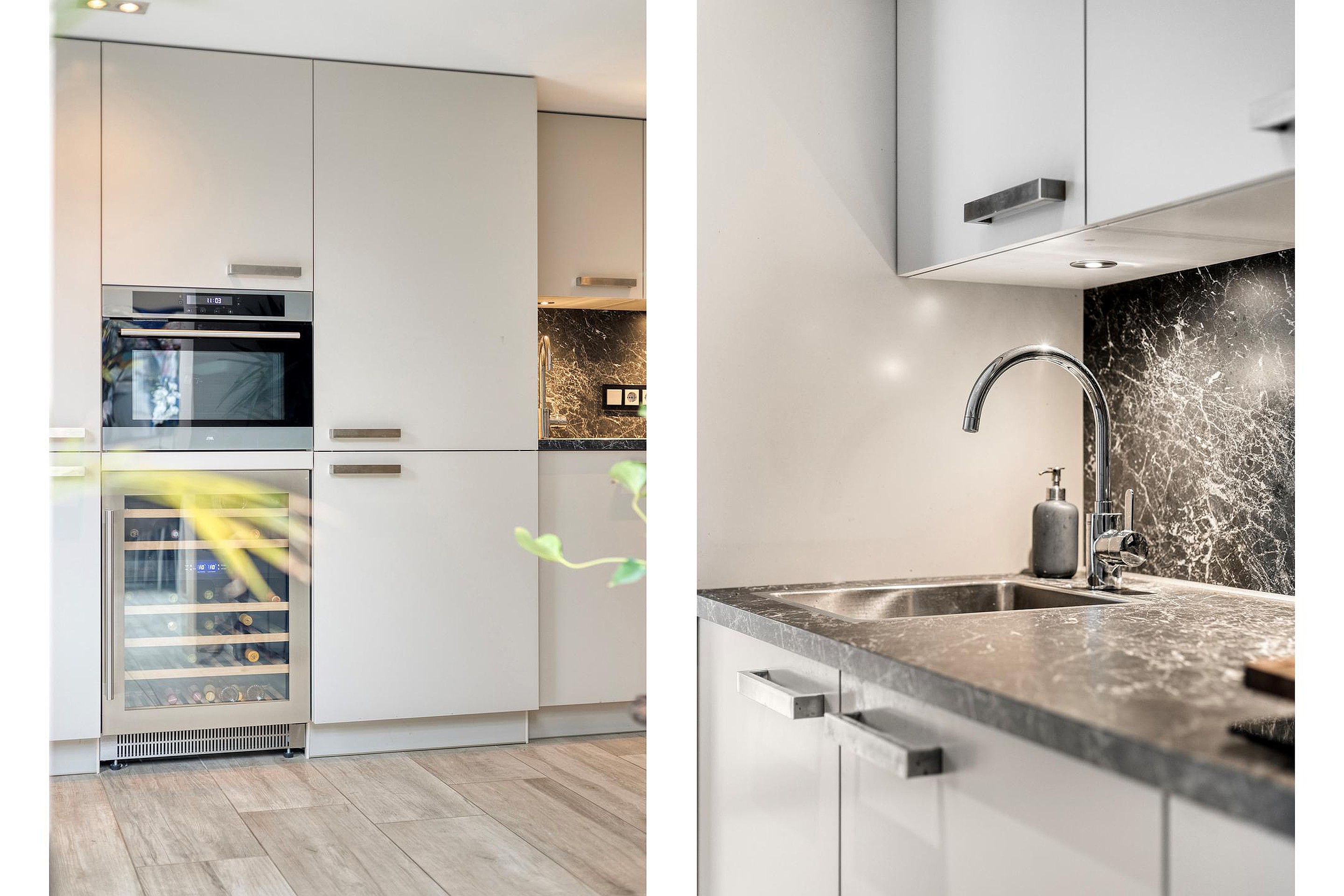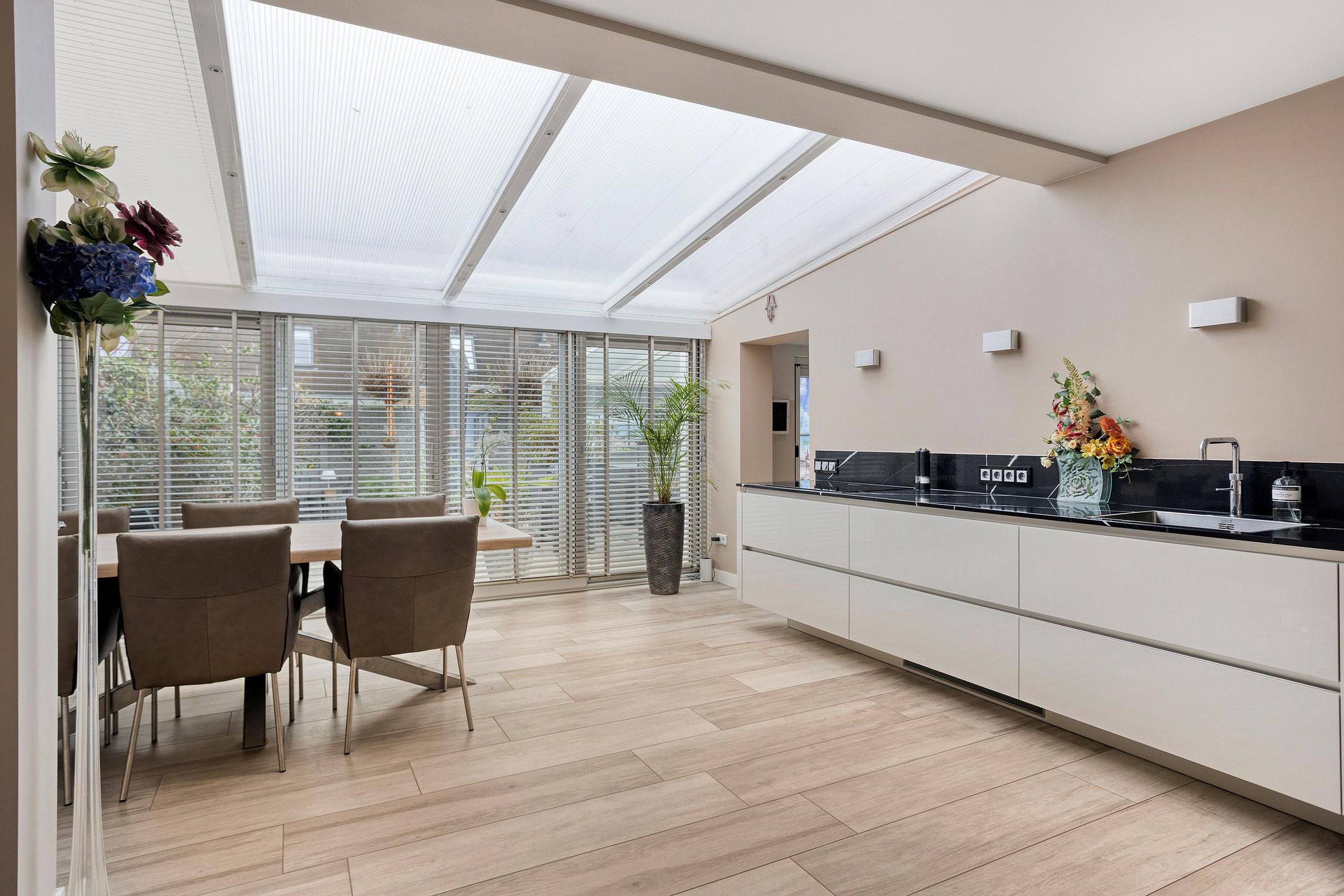 De moderne open keuken (9m2) in hoekopstelling is van alle gemakken voorzien, waaronder een composiet aanrechtblad, spoelbak, Quooker, 4-pits inductiekookplaat met geïntegreerde afzuigkap (filter), stoomoven, oven, warmhoudlade, vaatwasser, ingebouwd koffieapparaat en koelkast. Vanuit de uitbouw biedt een schuifpui directe toegang tot de tuin.