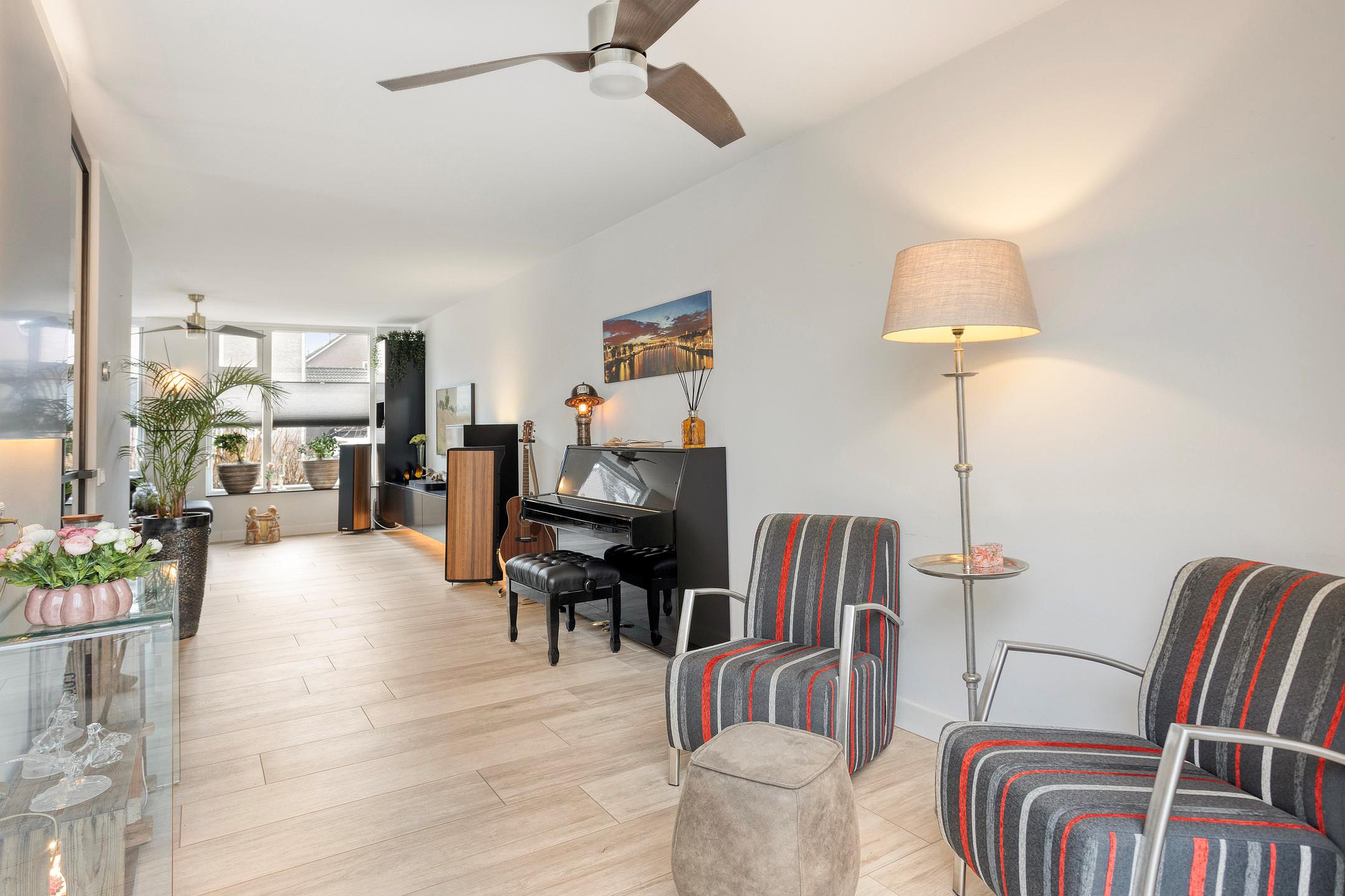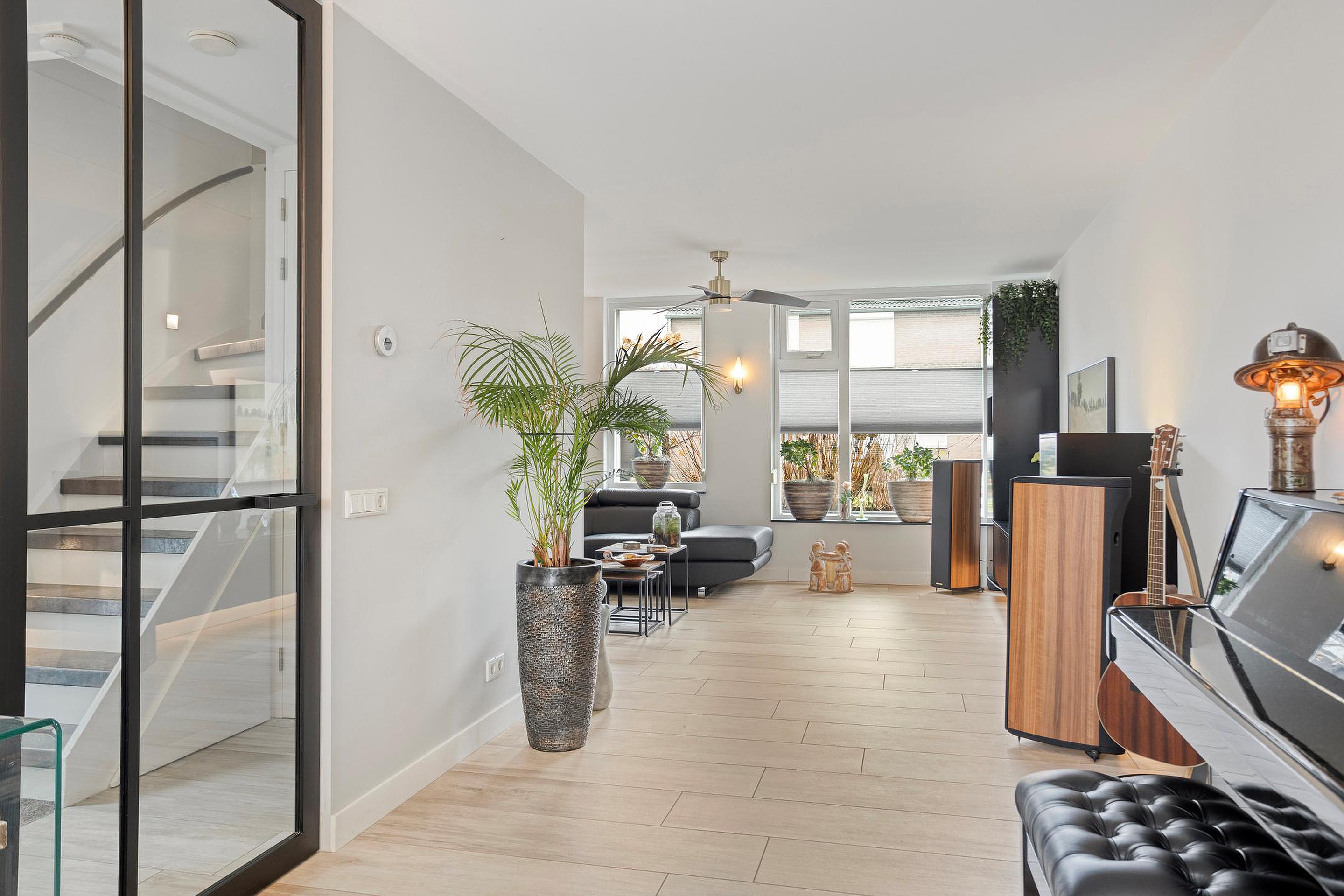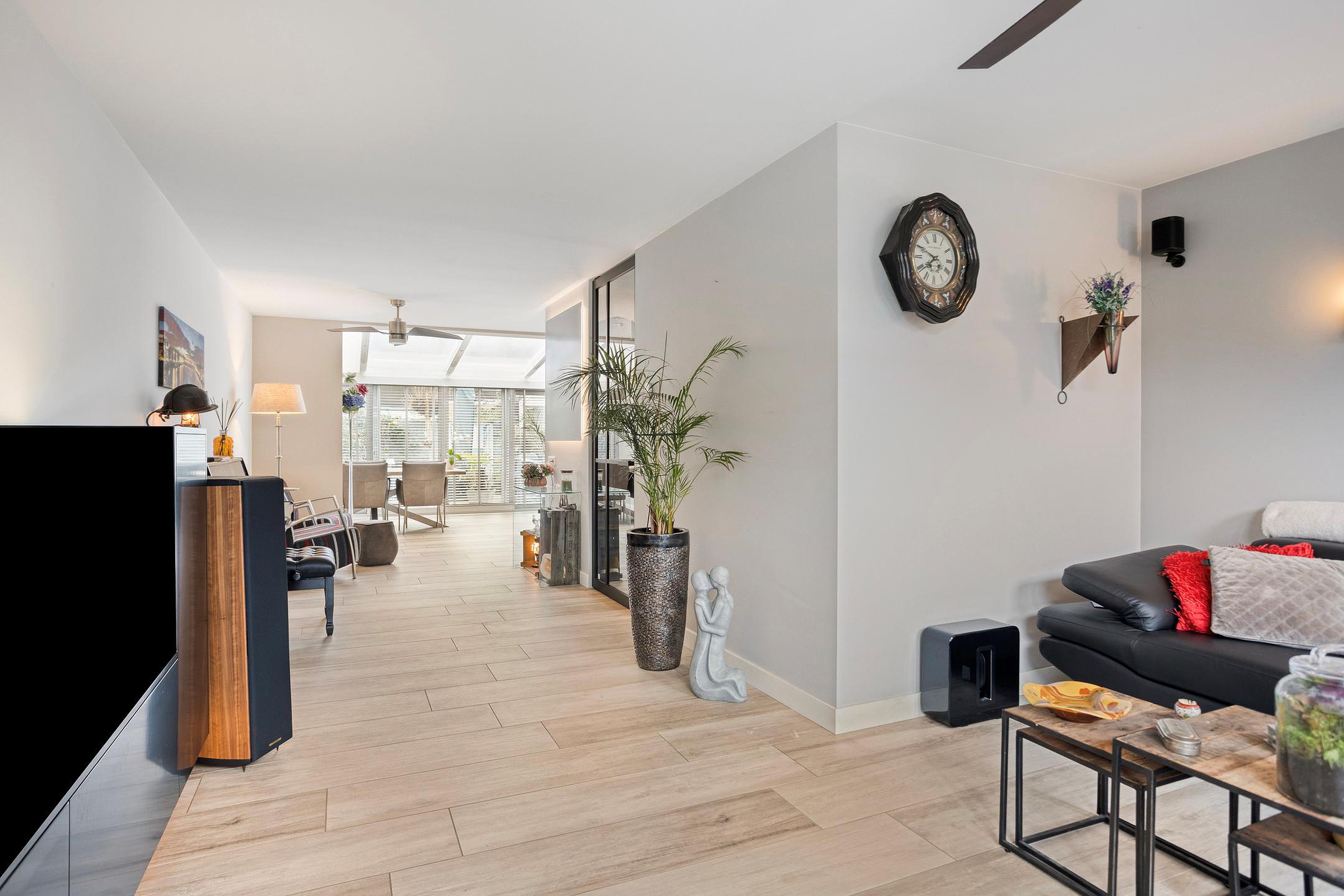 De L-vormige woonkamer (42m2) is gelegen aan de voorzijde van de woning en is afgewerkt met een tegelvloer en vloerverwarming (over de gehele begane grond). De woonkamer loopt door naar de royale uitbouw aan de achterzijde, waar zich de eetkamer en de open keuken bevinden.