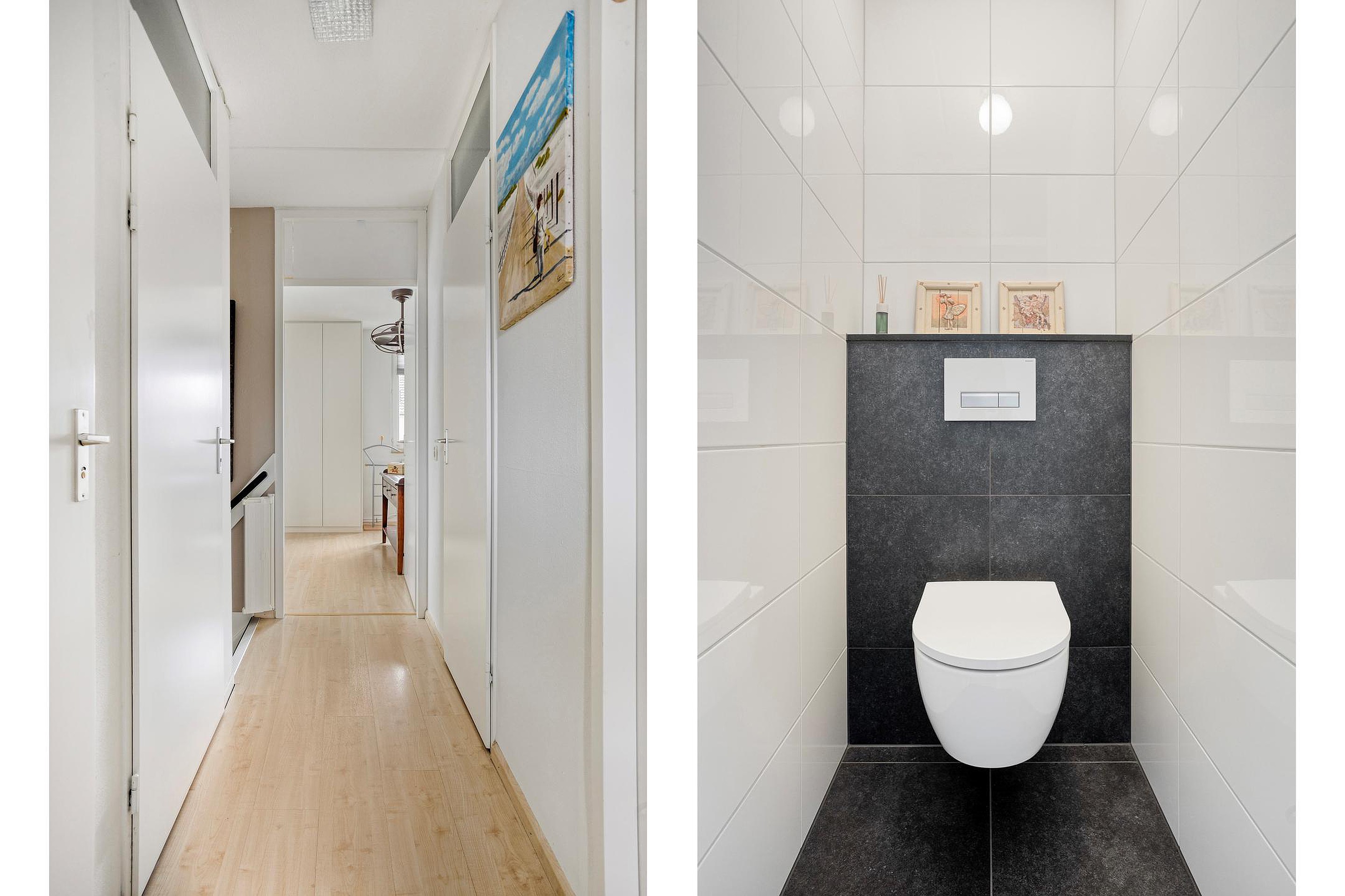 Via de trap vanuit de hal bereikt men de overloop, welke toegang biedt tot drie slaapkamers, de badkamer en een separate toiletruimte. De toiletruimte is uitgevoerd met een wandcloset en draagt bij aan het comfort op deze verdieping.
