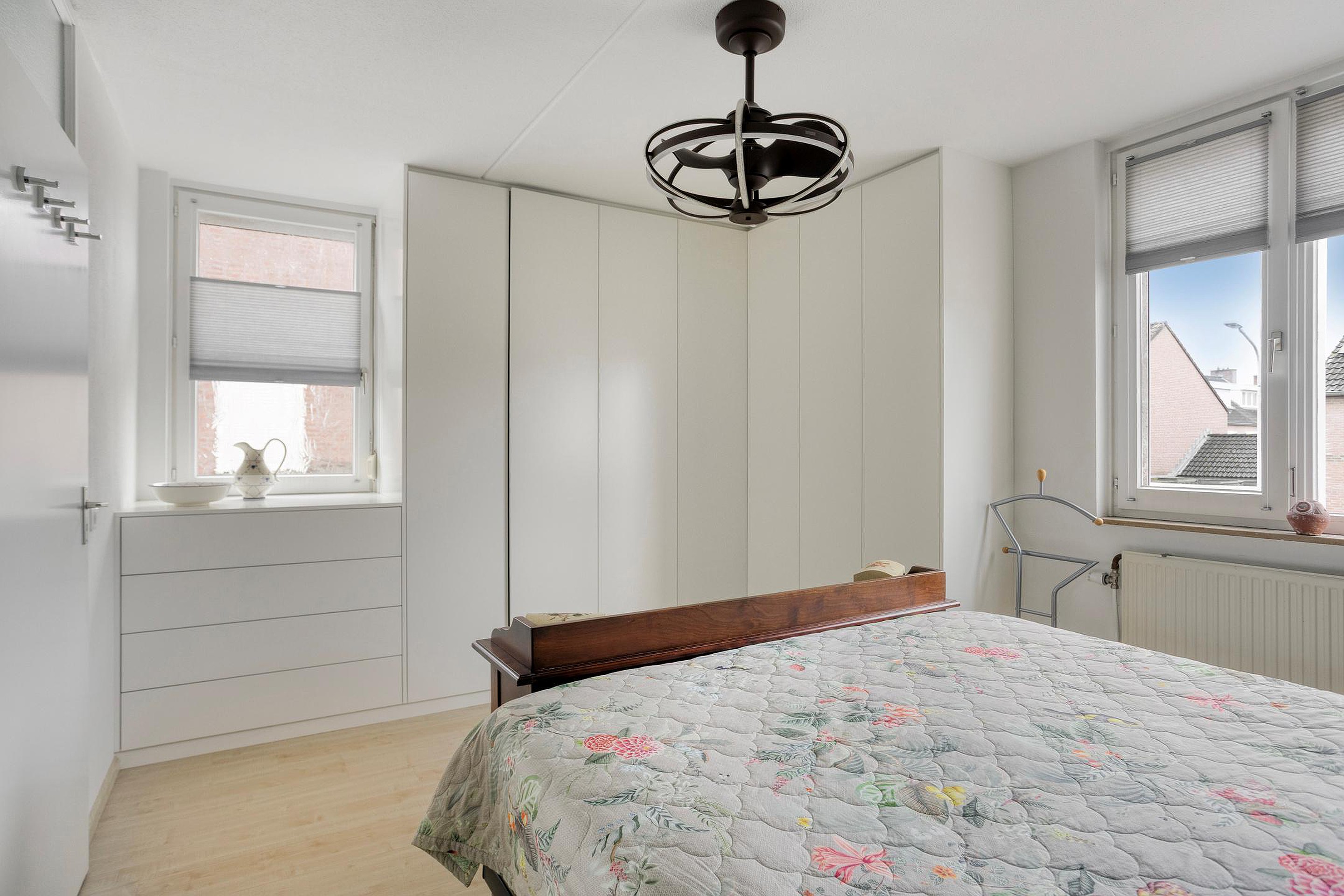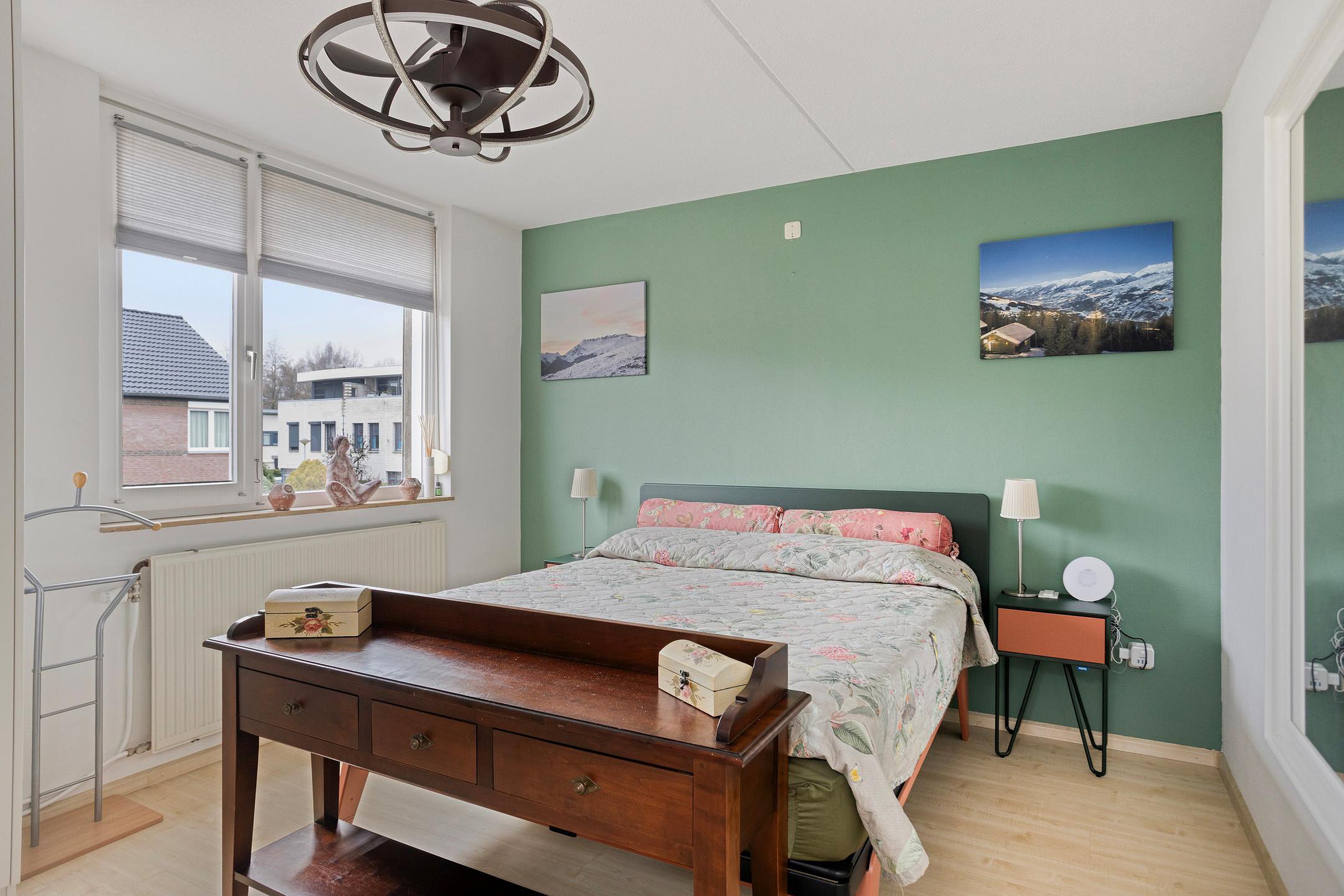 De hoofdslaapkamer (13m2), gelegen aan de voorzijde van de woning, is royaal van opzet en beschikt over een vaste kastenwand, wat zorgt voor veel praktische bergruimte. De kamer is afgewerkt met een laminaatvloer en voorzien van houten kozijnen met enkele beglazing en rolluiken.
