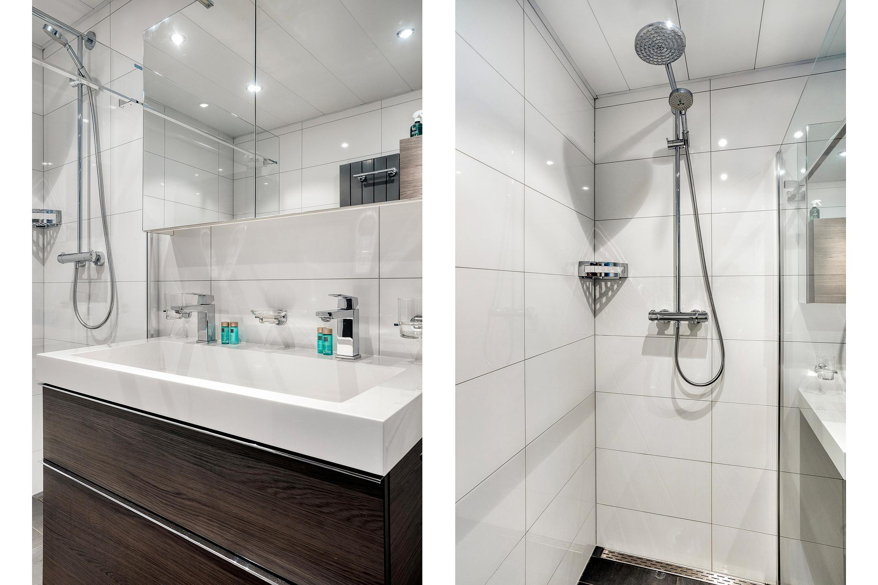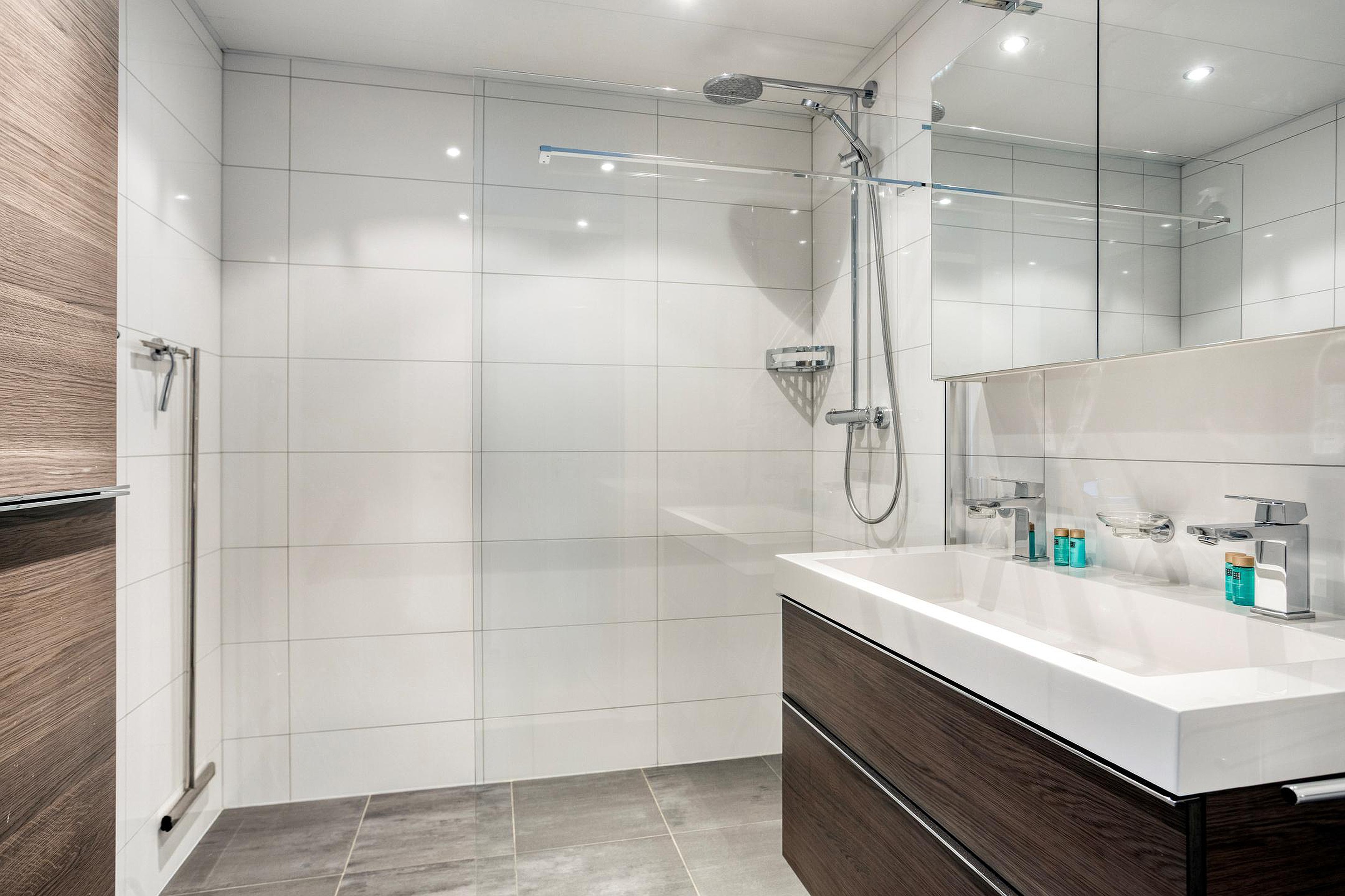 De moderne badkamer (4m2) is functioneel en verzorgd ingericht en voorzien van een ruime inloopdouche met regenfunctie en een dubbele wastafel met meubel.