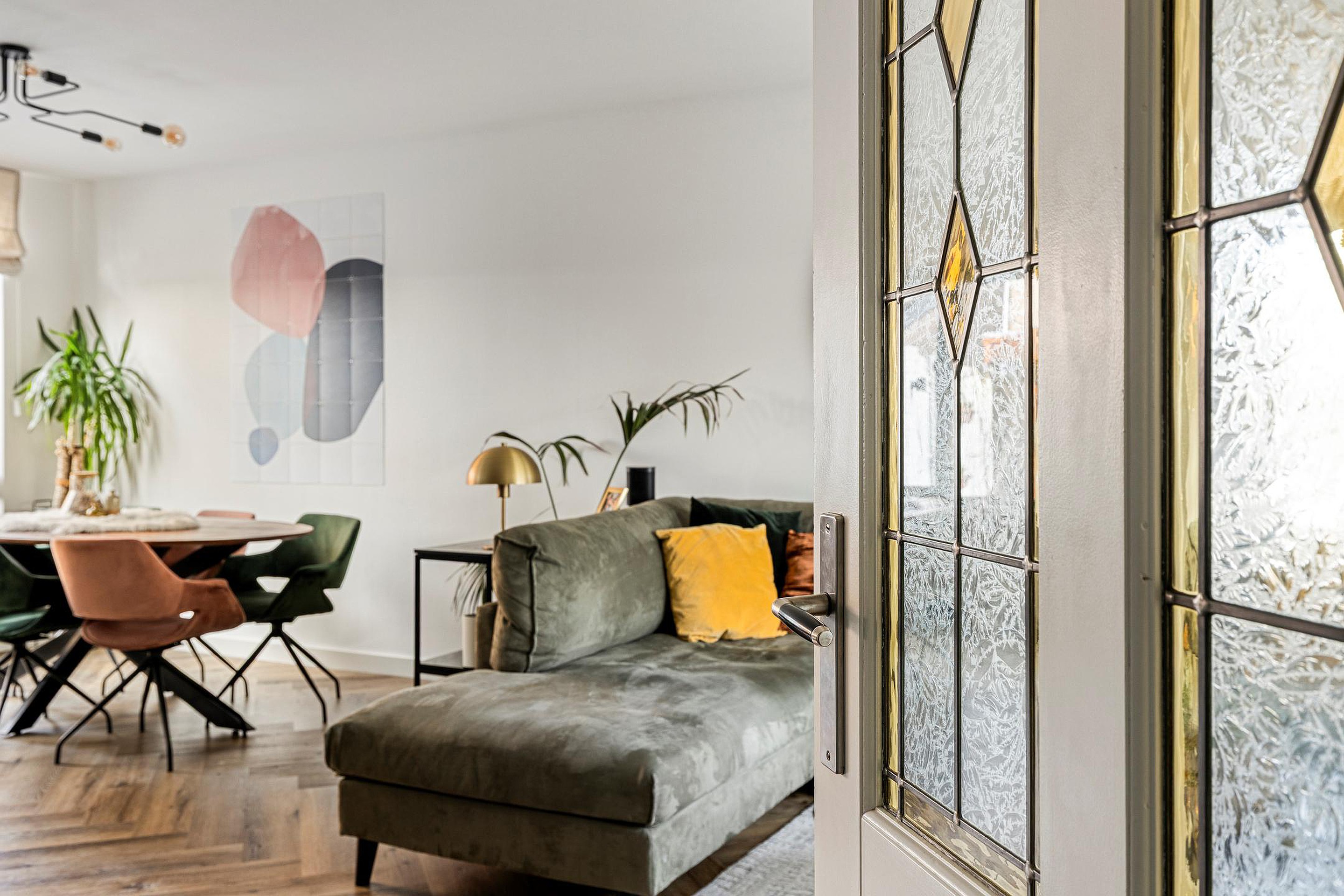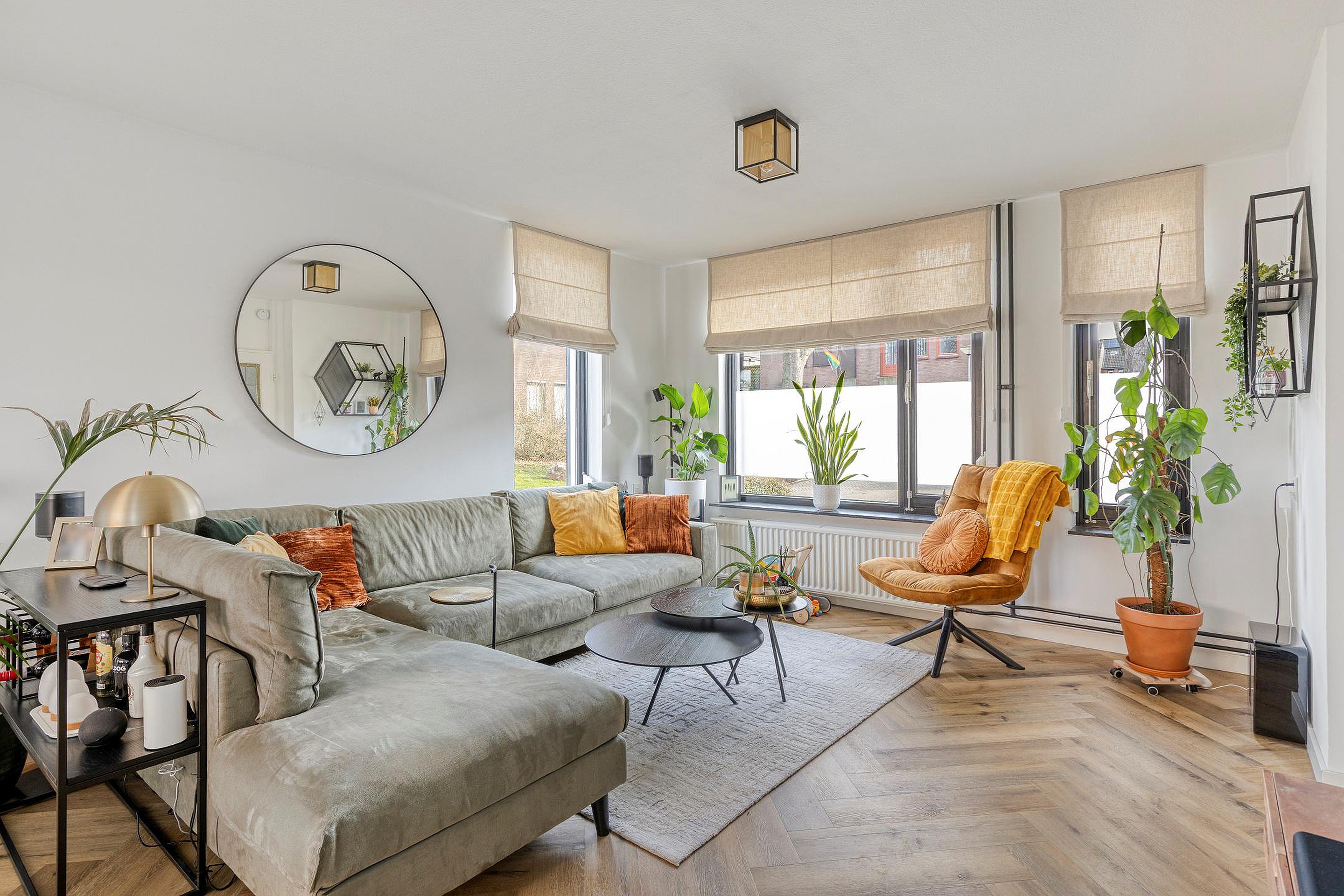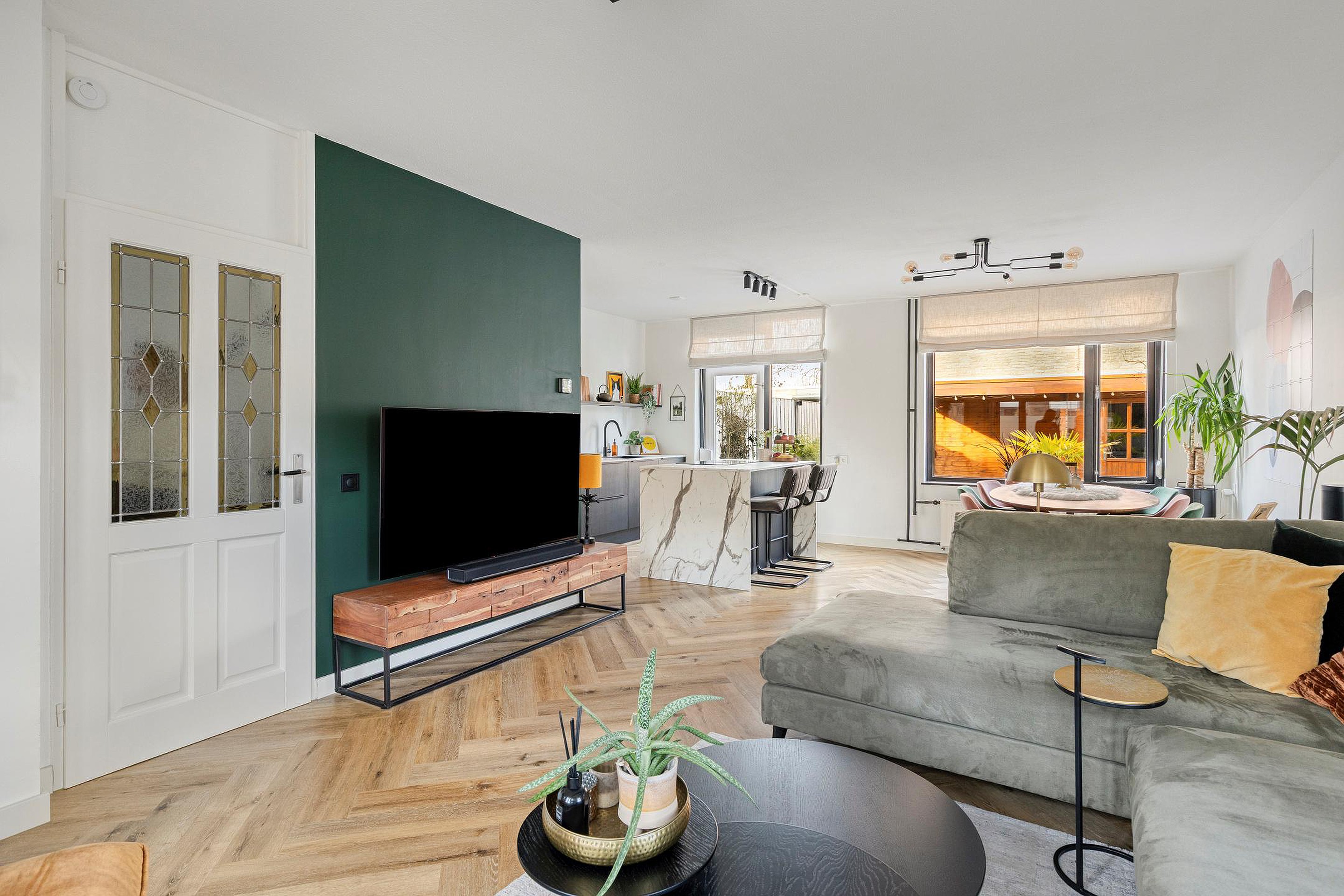 De woonkamer staat in open verbinding met de keuken en heeft samen een oppervlakte van circa 36 m2. De woonkamer is voorzien van een fraaie visgraat pvc vloer, stucwerk wanden en spuitwerk plafonds, wat een warme en stijlvolle uitstraling geeft.