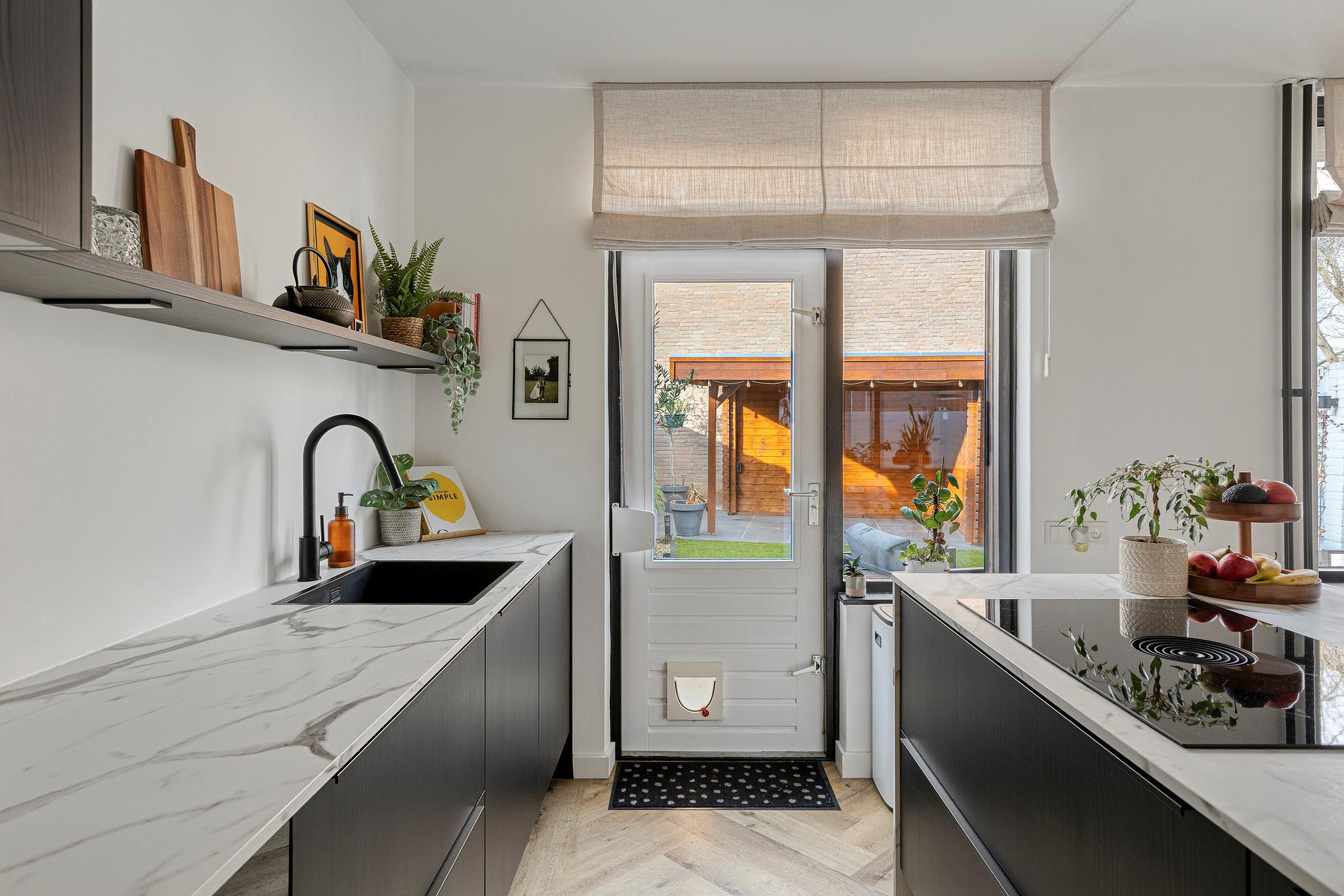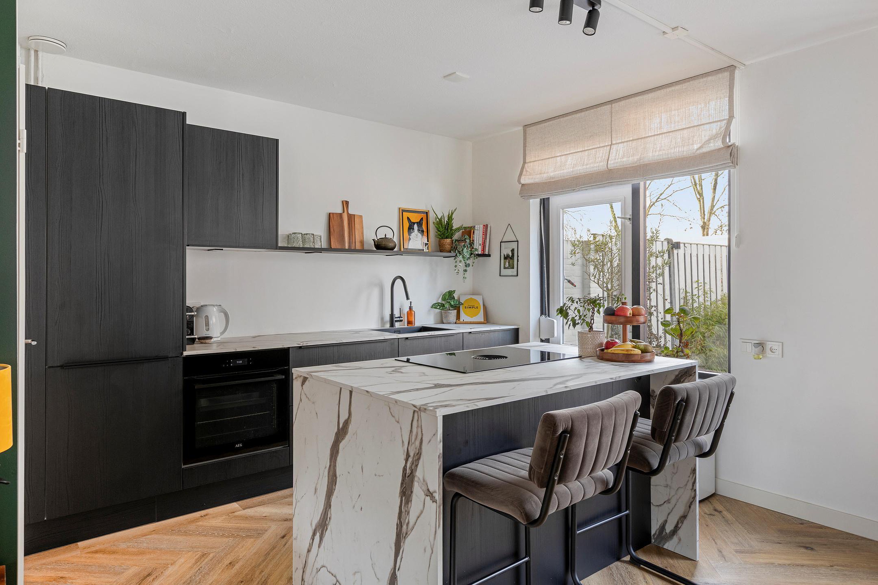 De keuken is recent vernieuwd en is uitgevoerd met een modern kookeiland. De keuken beschikt over de volgende hoogwaardige (inbouw)apparatuur, te weten: een 4-pits inductiekookplaat met geïntegreerde afzuigkap van Bora, oven, vaatwasser, spoelbak en een koelkast. Vanuit de keuken is er directe toegang tot de zonnige achtertuin. Onder de trap bevindt zich een praktische bergkast.