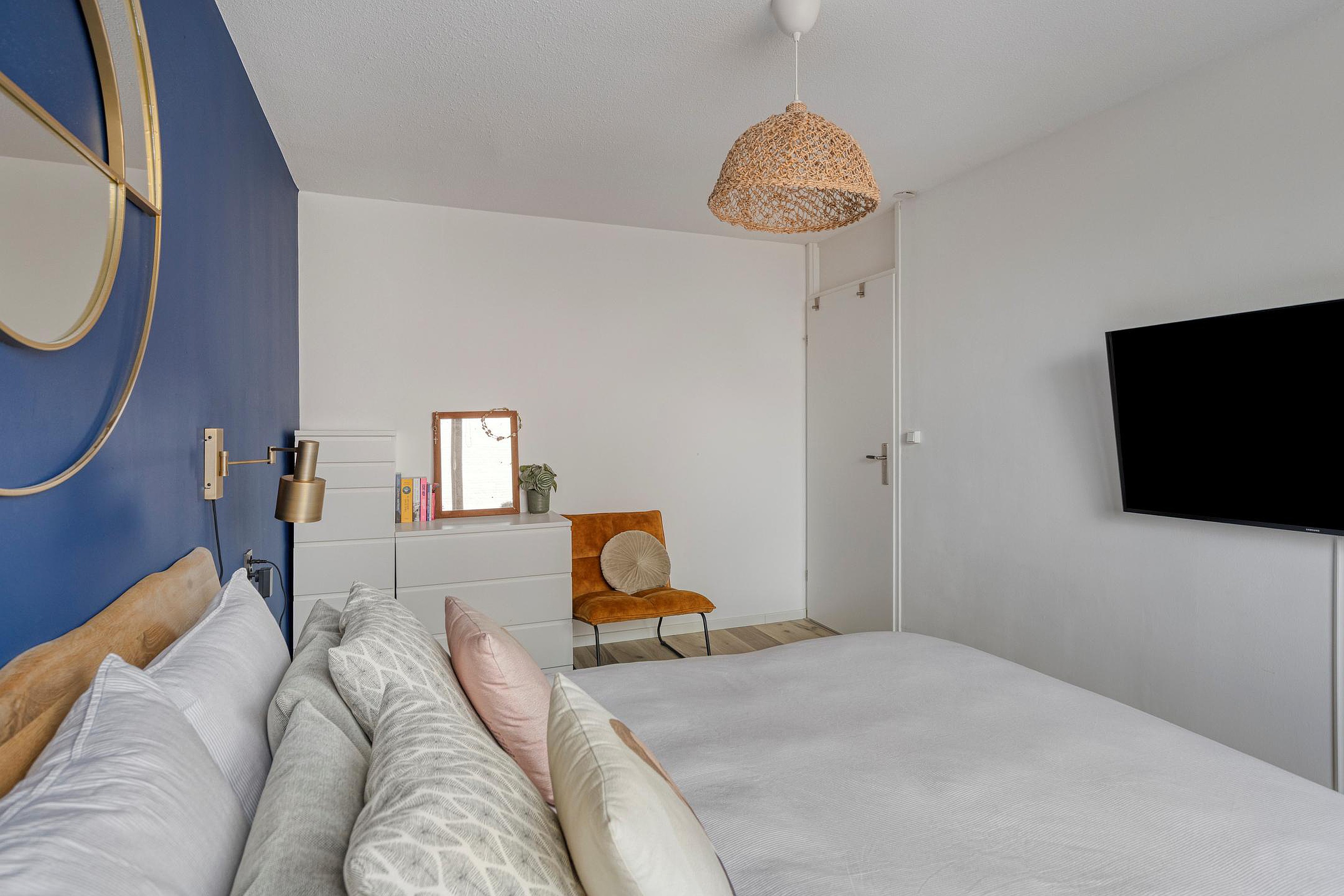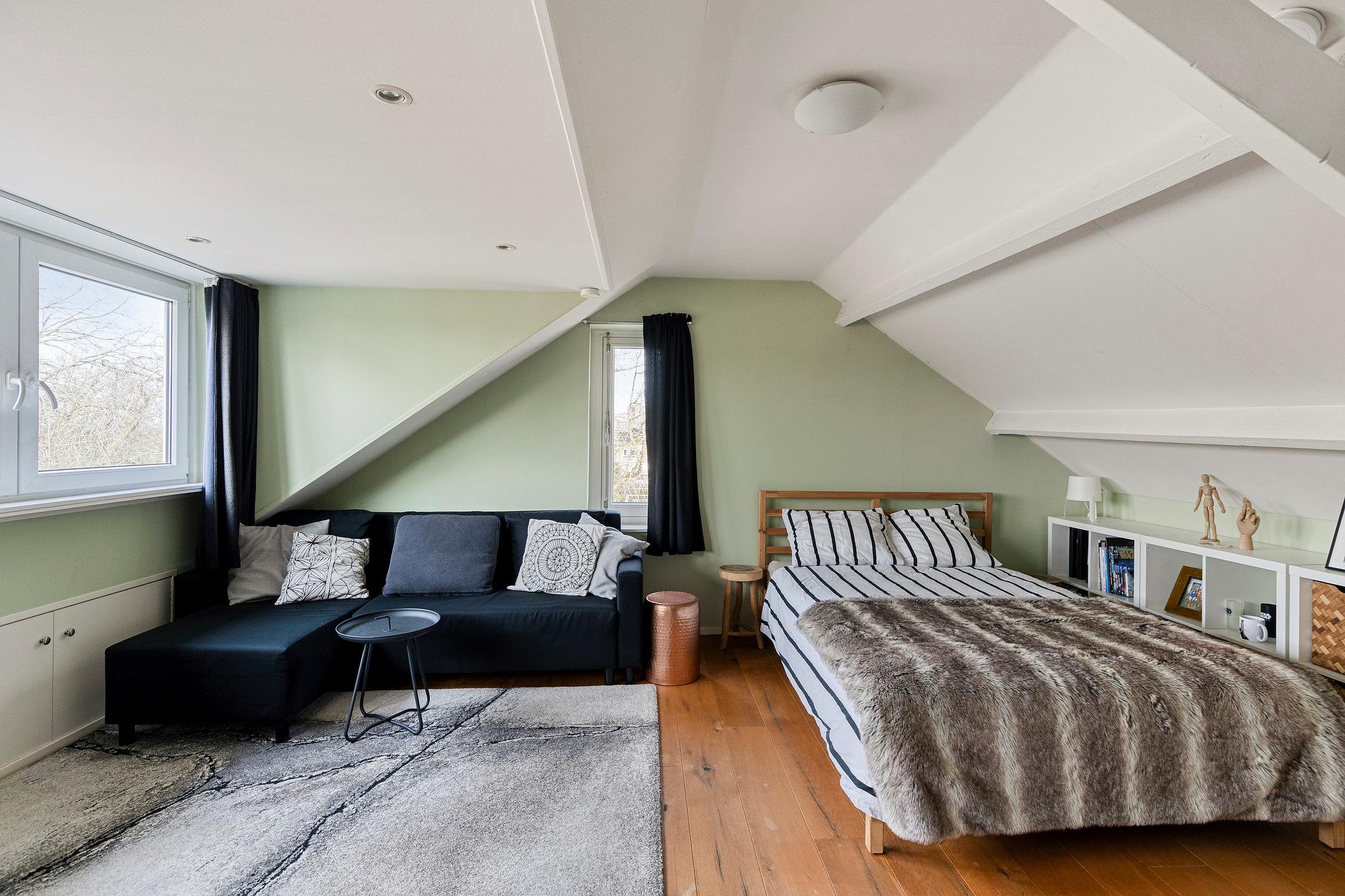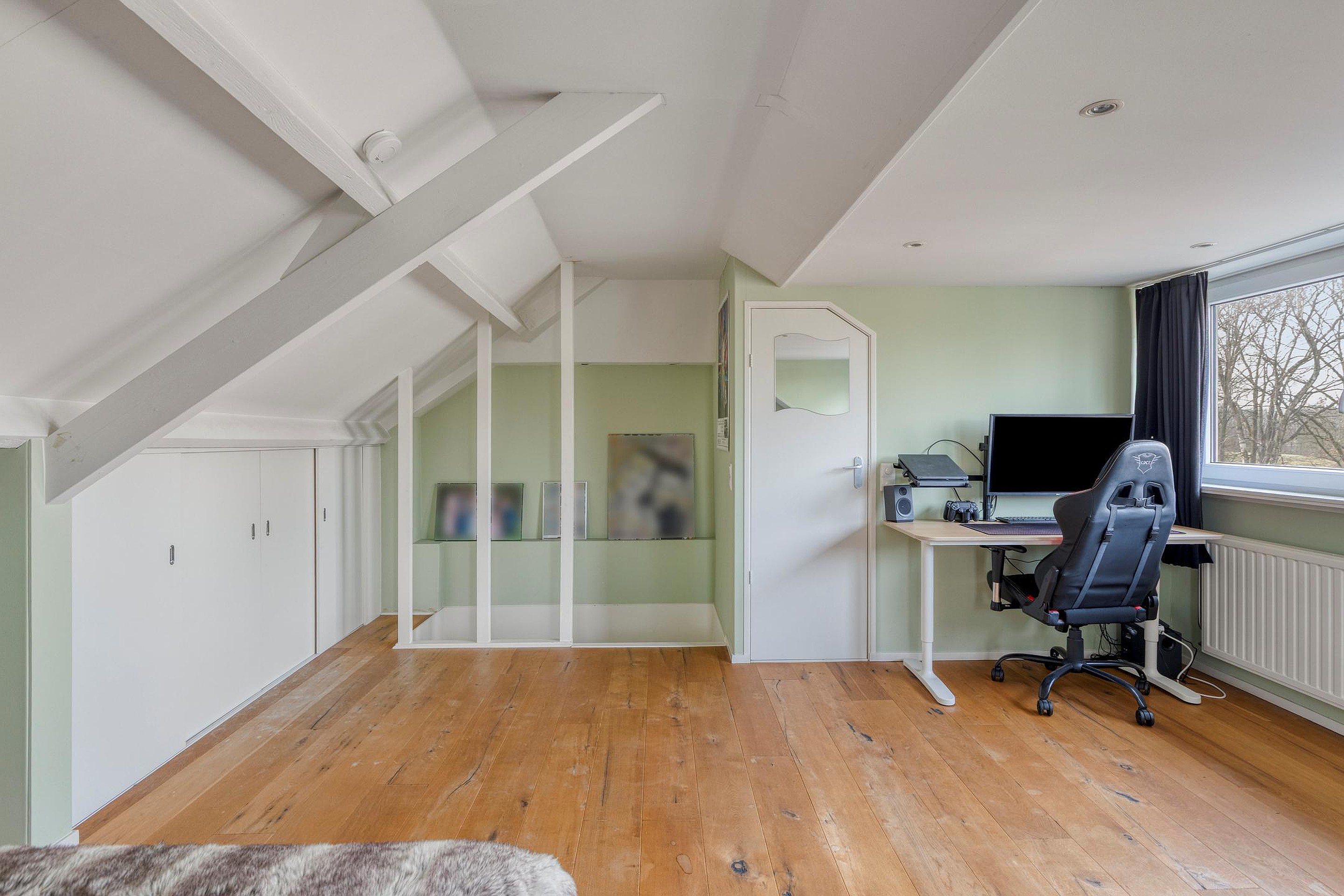 Via een vaste trap bereikt u de zolderverdieping met de vierde slaapkamer van circa 22 m2. Deze kamer is voorzien van een brede dakkapel aan de achterzijde voor veel lichtinval. De verdieping biedt diverse bergkasten, waaronder een c.v.-bergkast en een aparte kast voor de witgoedvoorzieningen. De wanden en plafonds zijn hier volledig gestuct.
