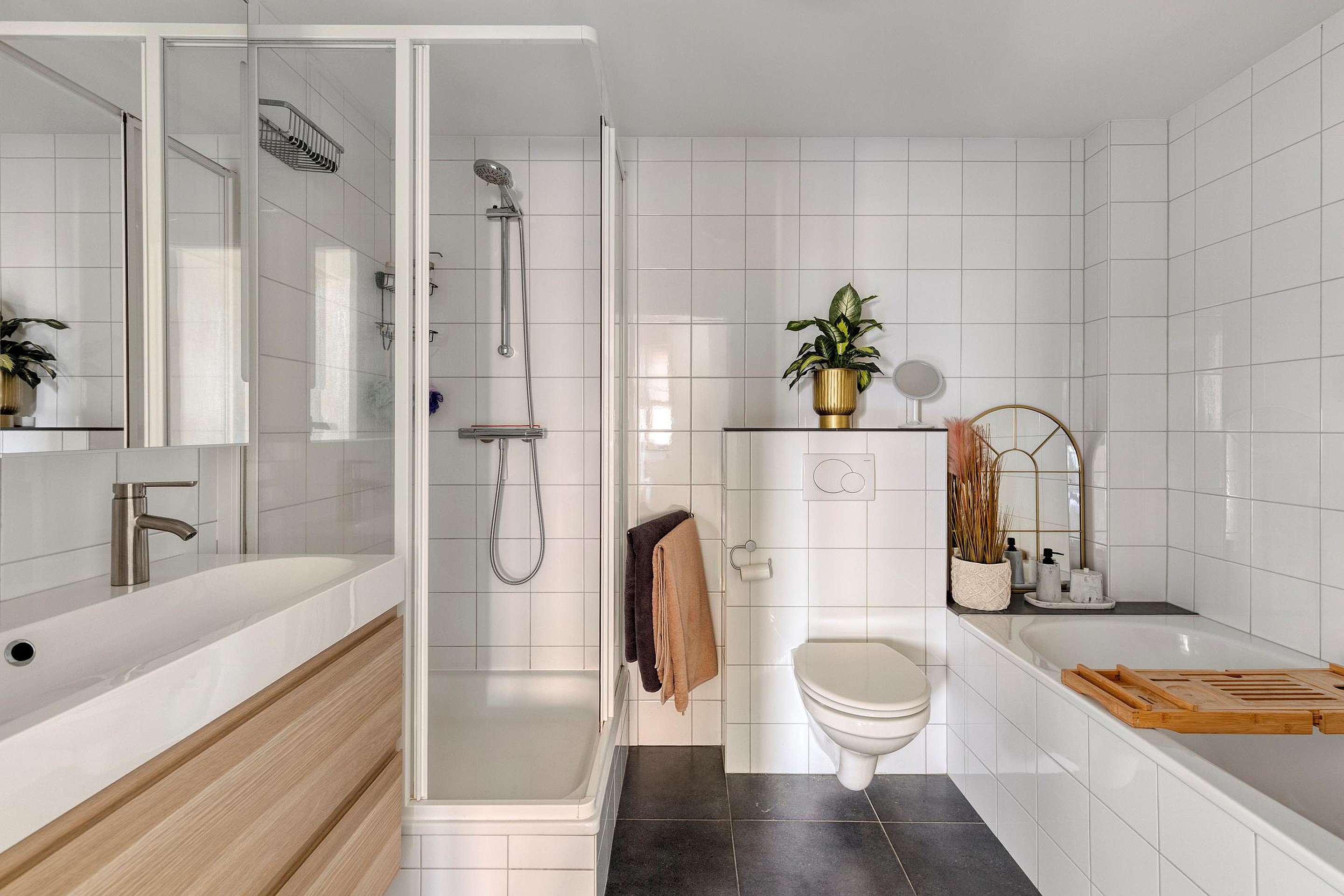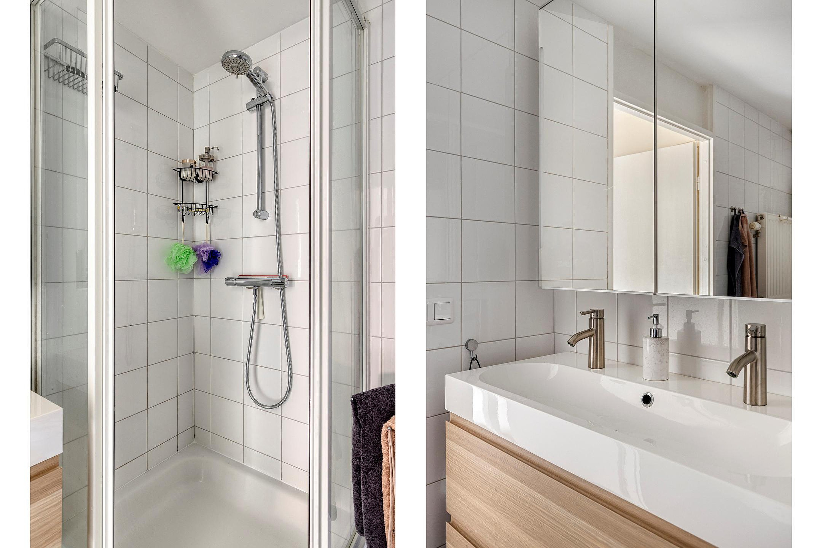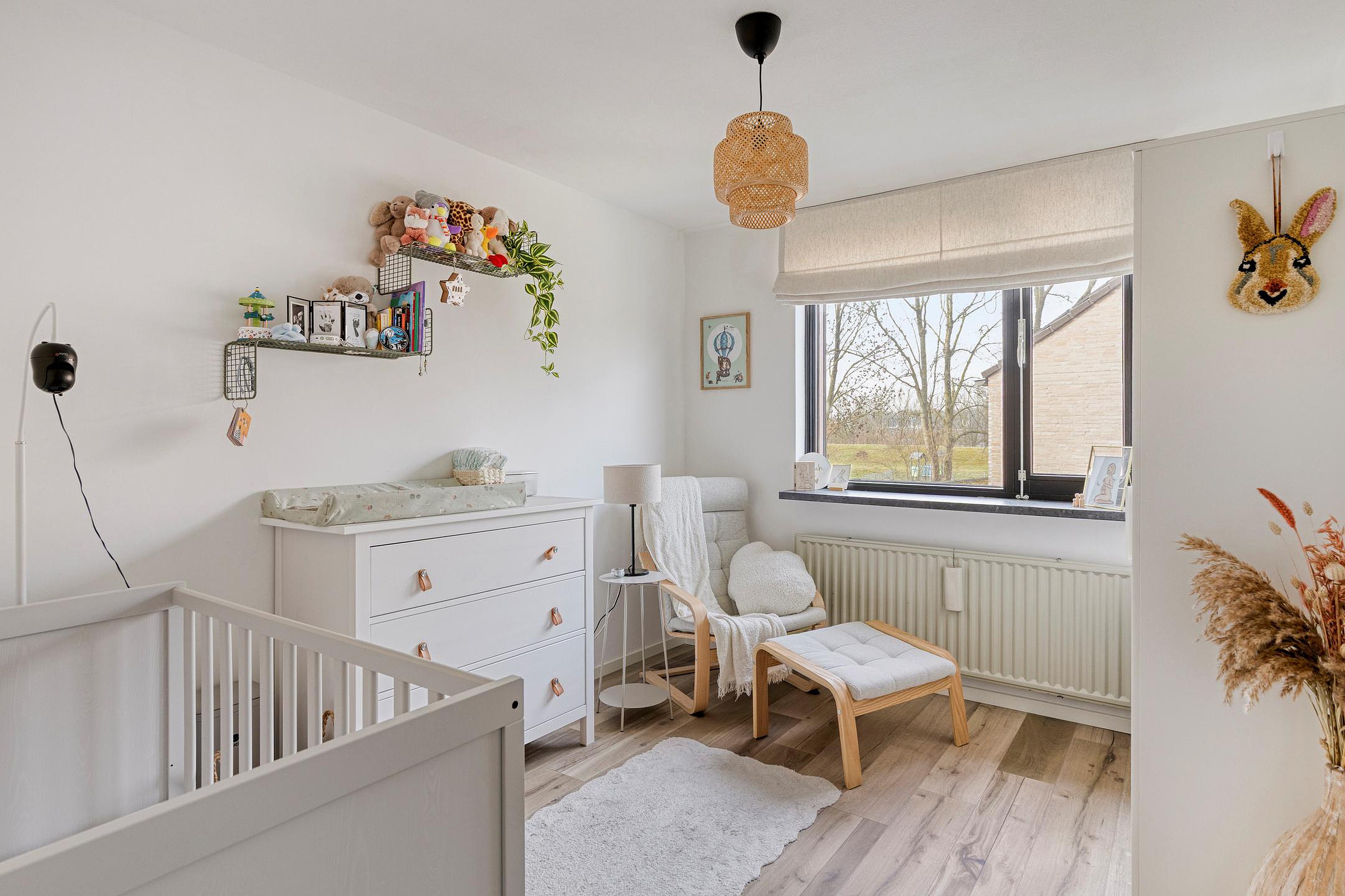 De overloop geeft toegang tot drie slaapkamers (ca. 13 m2, 9 m2 en 9 m2) en de volledig betegelde badkamer van circa 6 m2, voorzien van ligbad, aparte douche, dubbele wastafel met meubel en tweede wandcloset. Alle slaapkamer beschikken over een fraaie pvc vloer. Ook deze verdieping is grotendeels afgewerkt met stucwerk wanden en spuitwerk plafonds, met uitzondering van de badkamer.