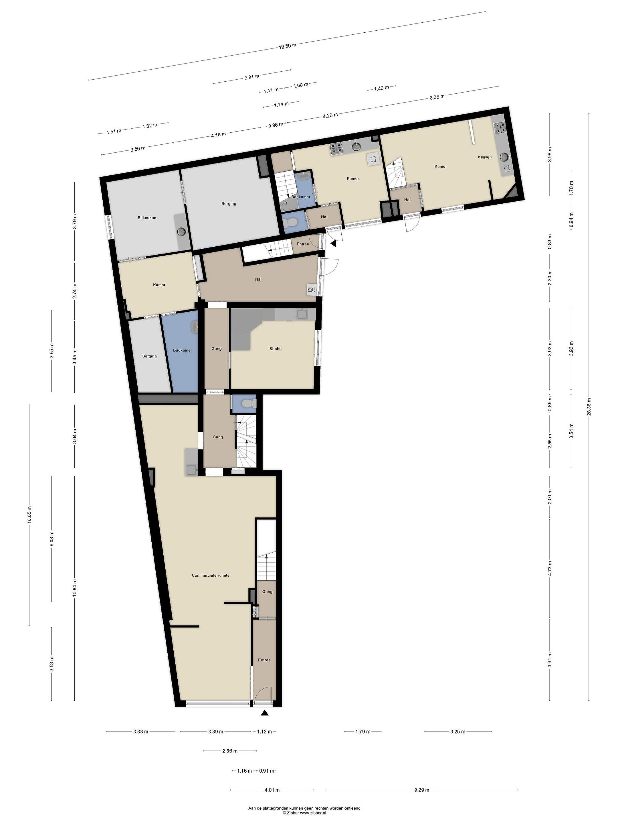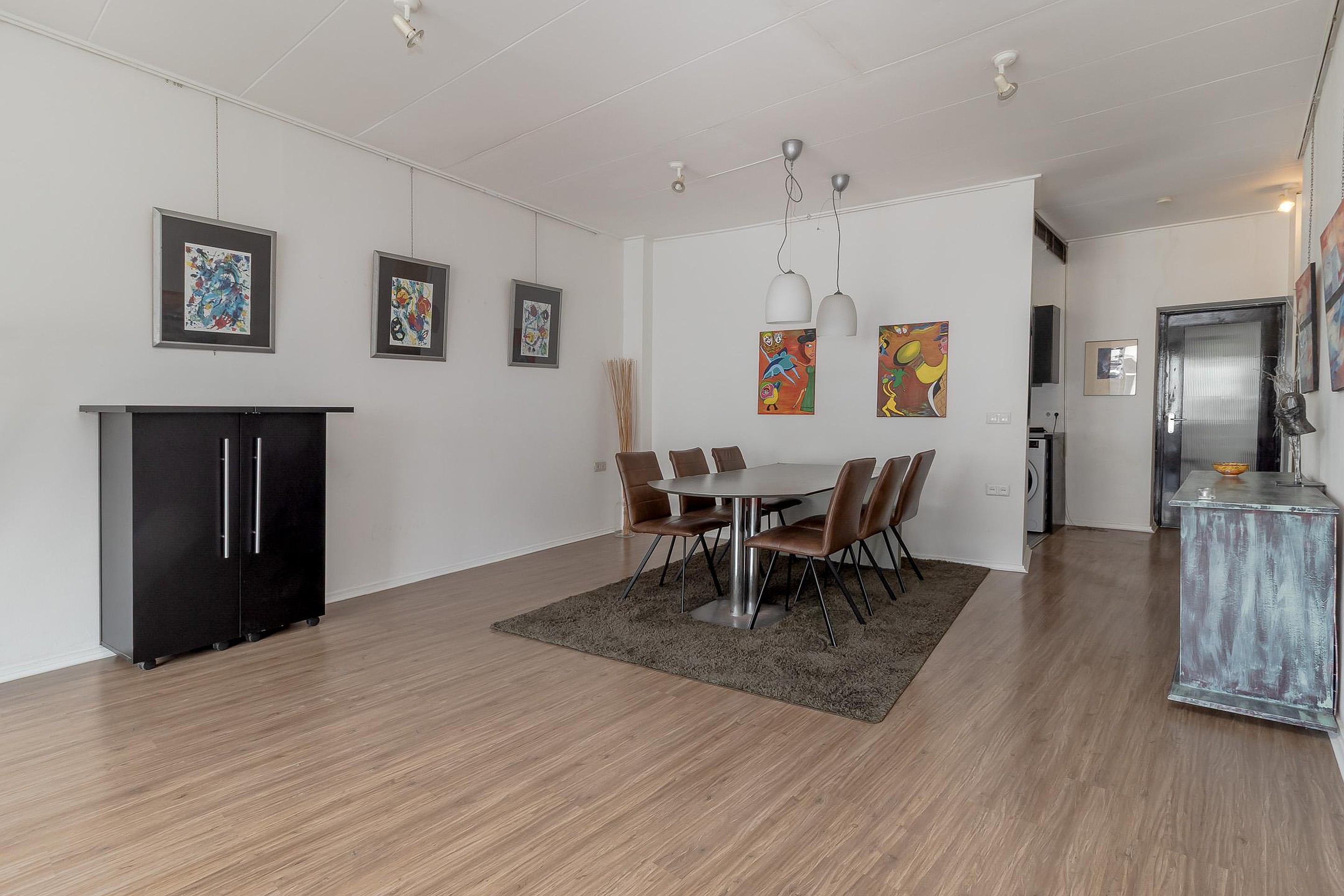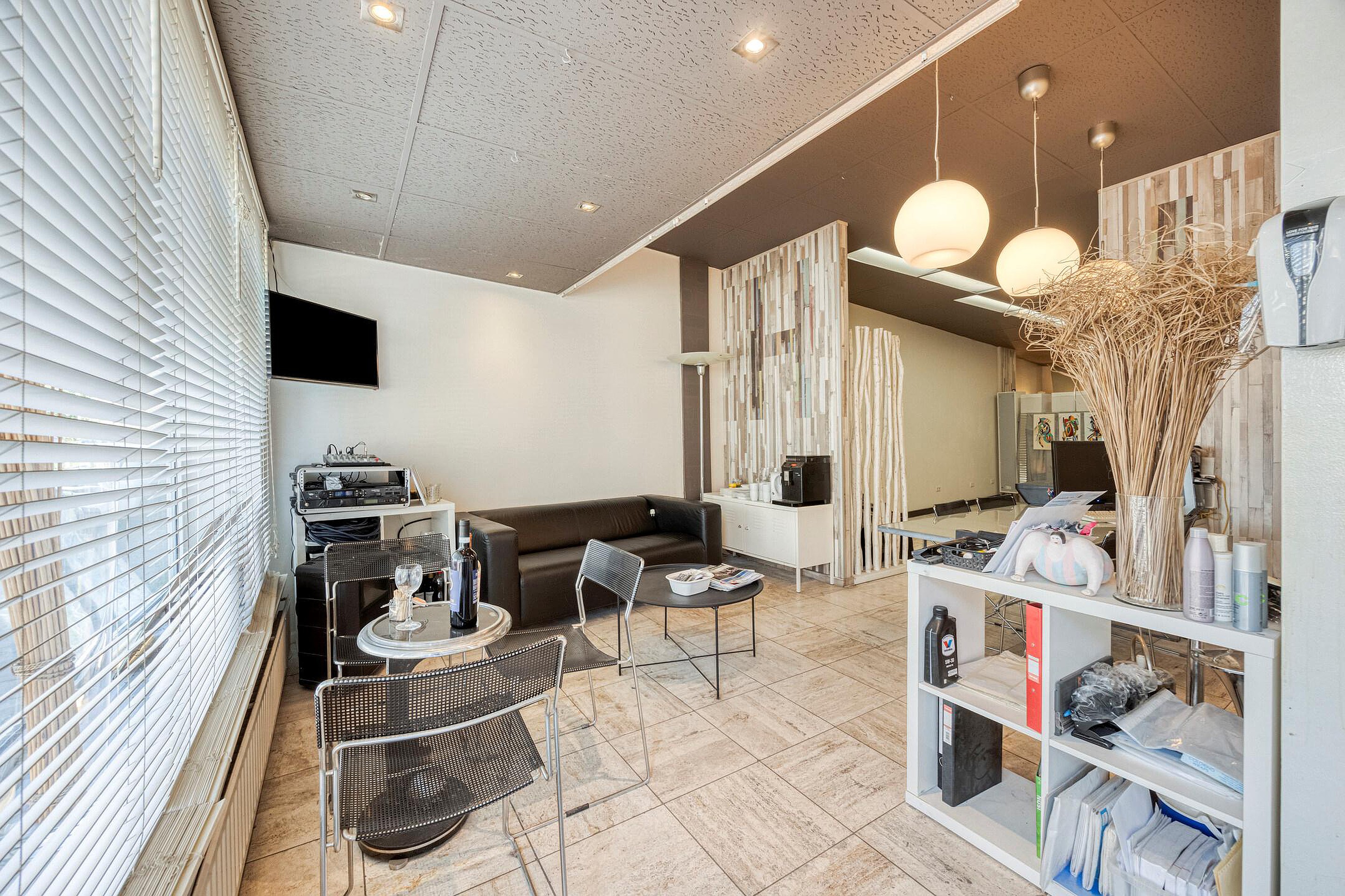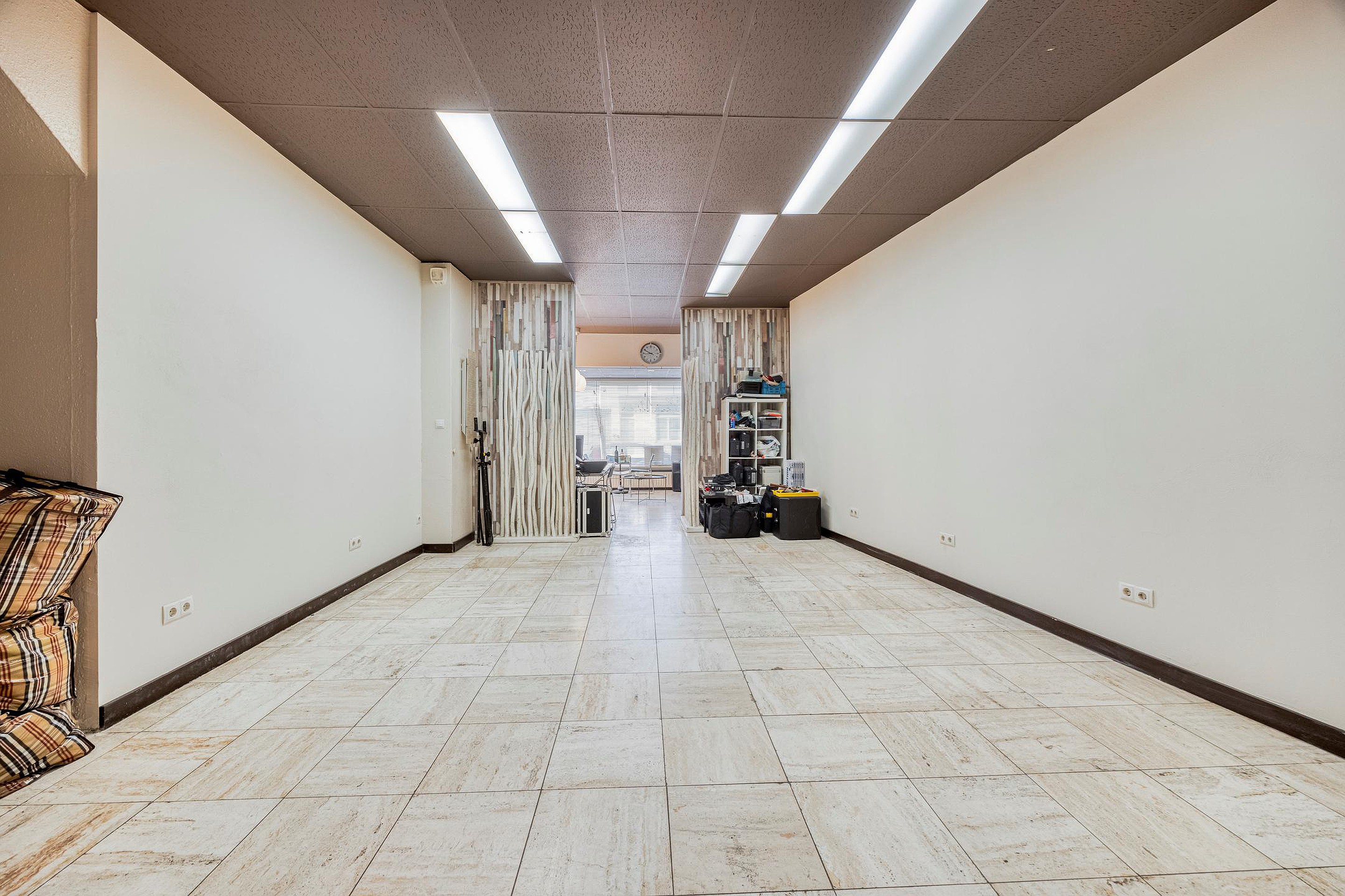 De commerciële ruimte beschikt over een ontvangst-/wachtruimte en loopt vervolgens diep door naar achteren. De ruimte is momenteel opgedeeld in meerdere compartimenten, die echter eenvoudig kunnen worden verwijderd om één grote open ruimte te creëren. Dankzij deze flexibele indeling is de commerciële ruimte geschikt voor diverse dienstverlenende functies zoals praktijkruimtes, kantoor of salon. Kenmerken voor de ruimte zijn onder andere de beschikking over een aparte kantoorruimte, biedt het object toegang tot een ruime kelder die uitstekend dienst kan doen als opslagruimte, en is de commerciële ruimte tevens bereikbaar via een achterom met een eigen ingang aan de achterzijde van het perceel.