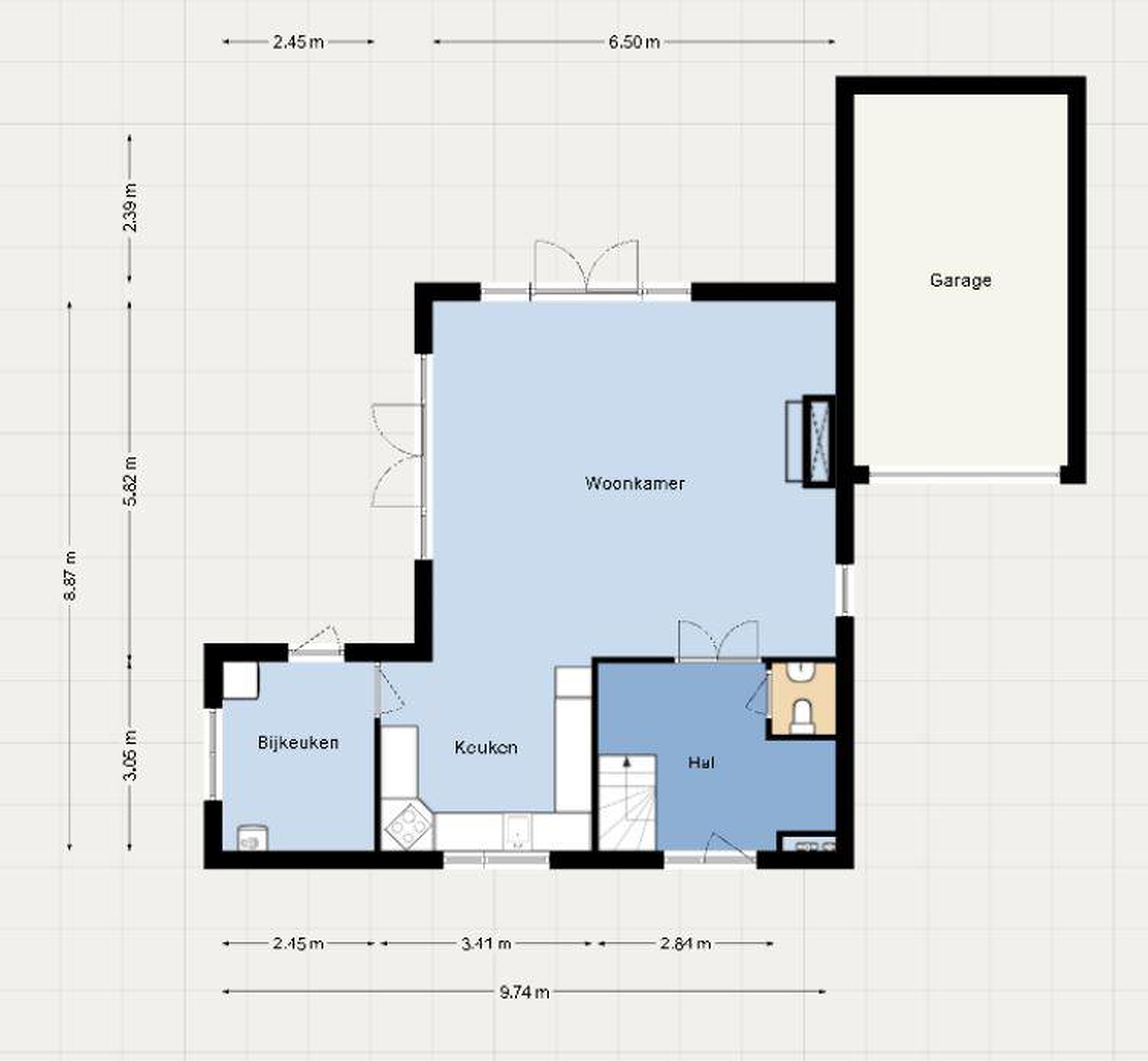 Aan de rechterzijde van de woning bevindt zich de aangebouwde garage (ca. 5.20 x 2.45 m) met stalen kanteldeur, bereikbaar van buitenaf.