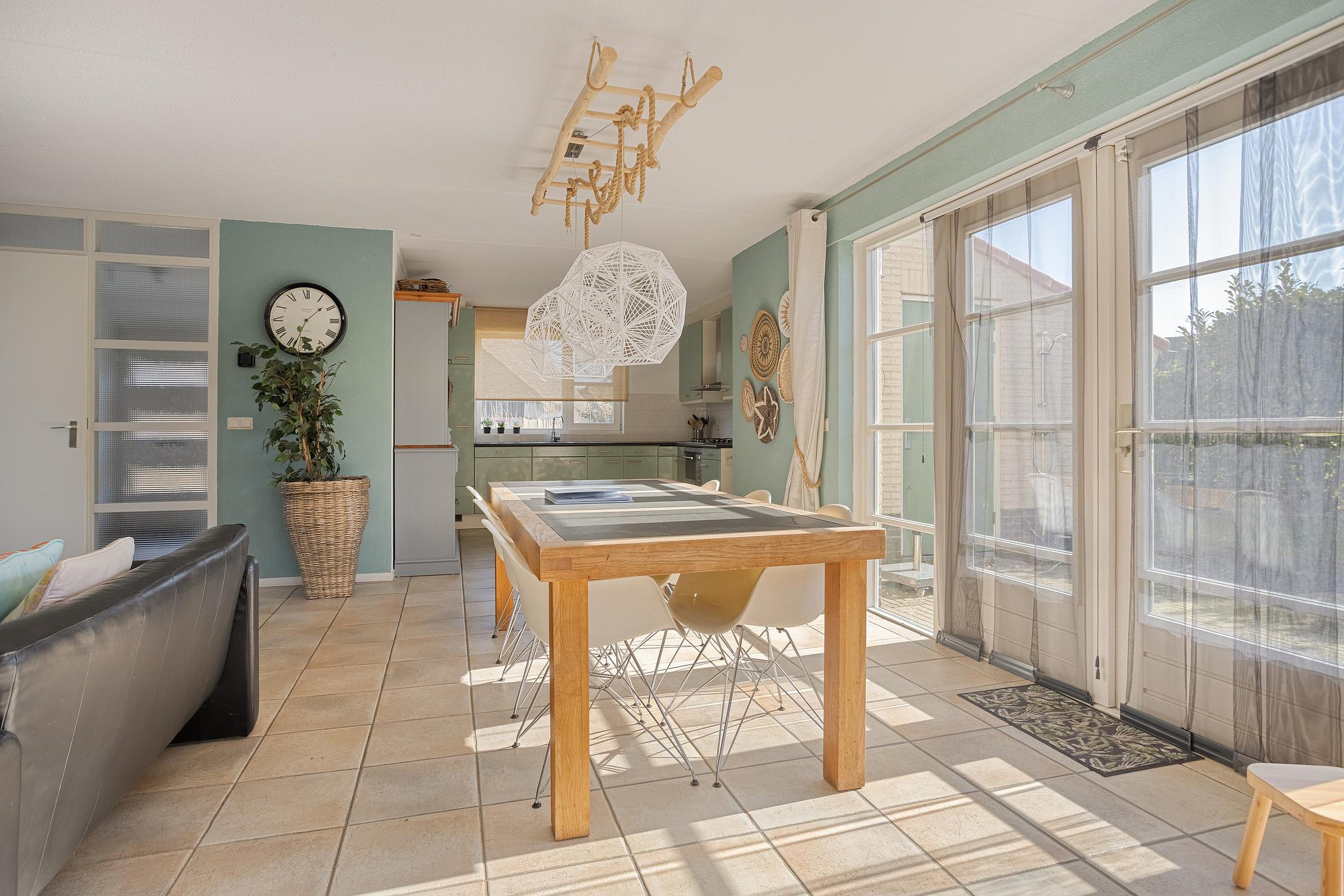 De lichte woonkamer (ca. 5.35 x 4.85 m) is voorzien van een sfeervolle gashaard en openslaande deuren naar het vergrote zonneterras met ligging op het zuid-westen. Hierdoor is er een mooie verbinding tussen binnen en buiten en geniet u optimaal van de middag- en avondzon.