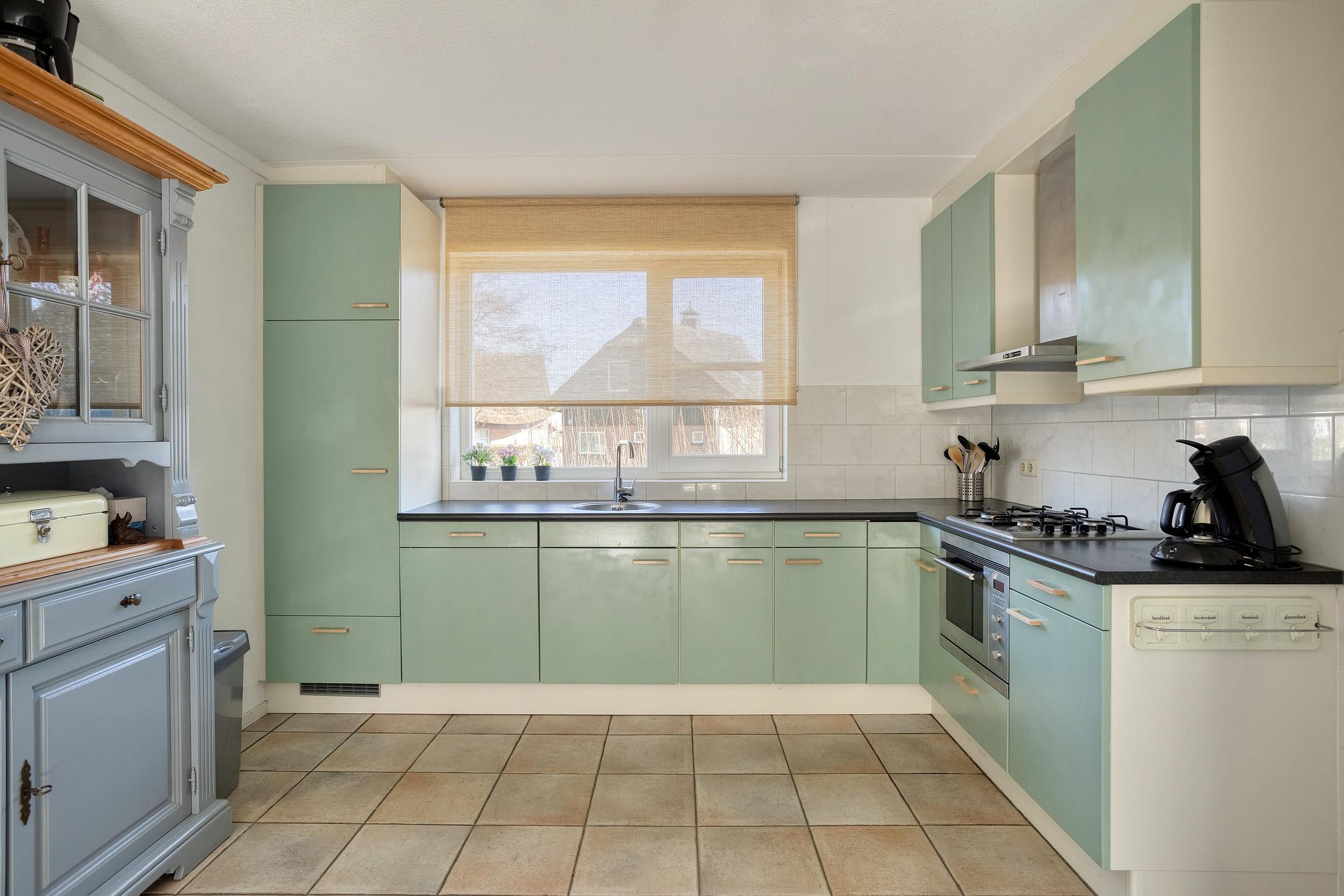 De open keuken (ca. 2.90 x 2.55 m) is praktisch ingericht en voorzien van onder andere een combi-magnetron, koelkast, vaatwasser, gaskookplaat en afzuigkap.