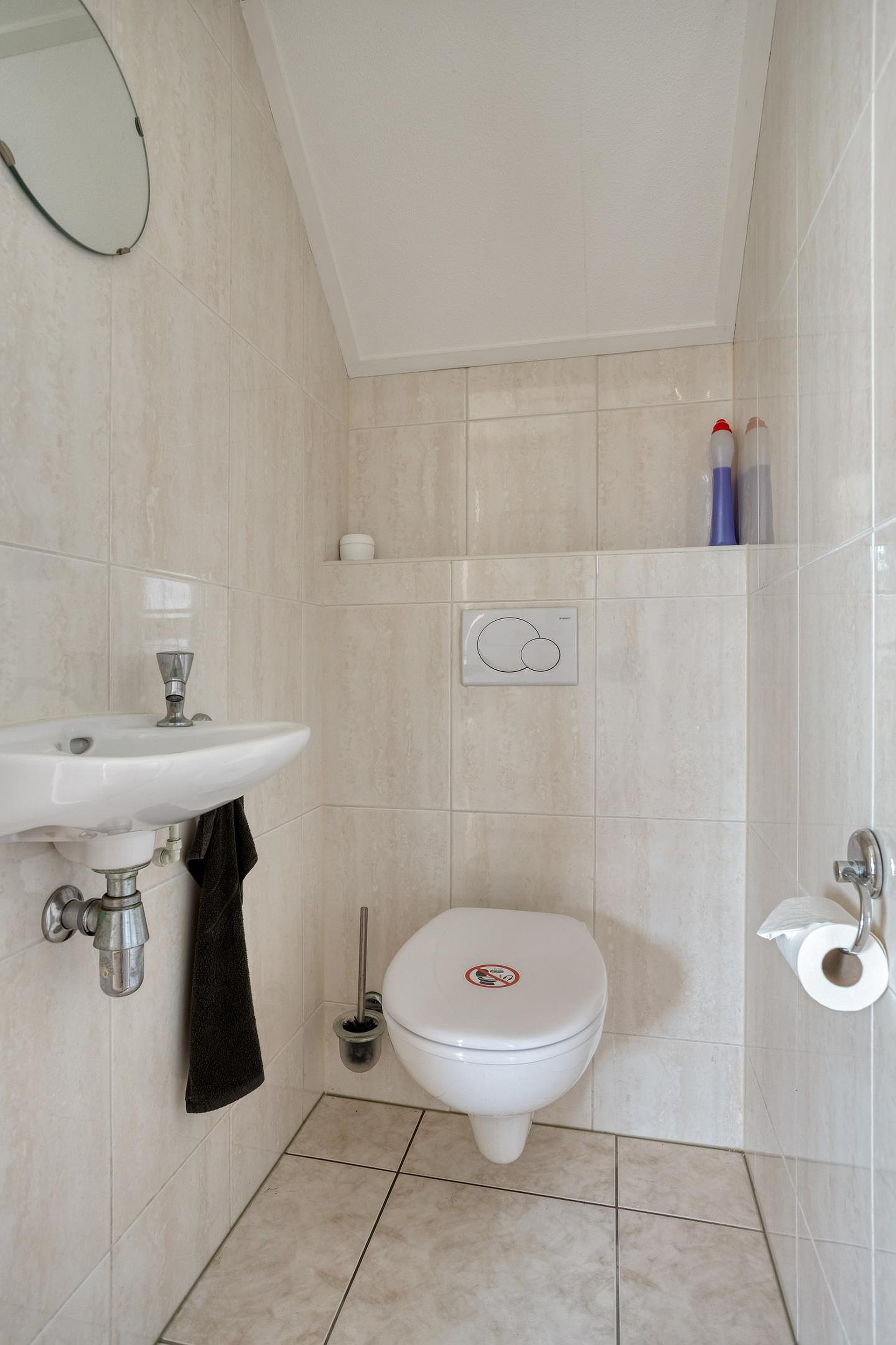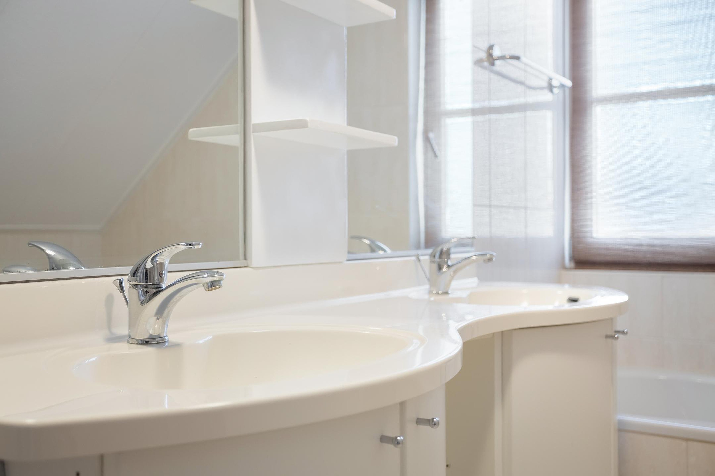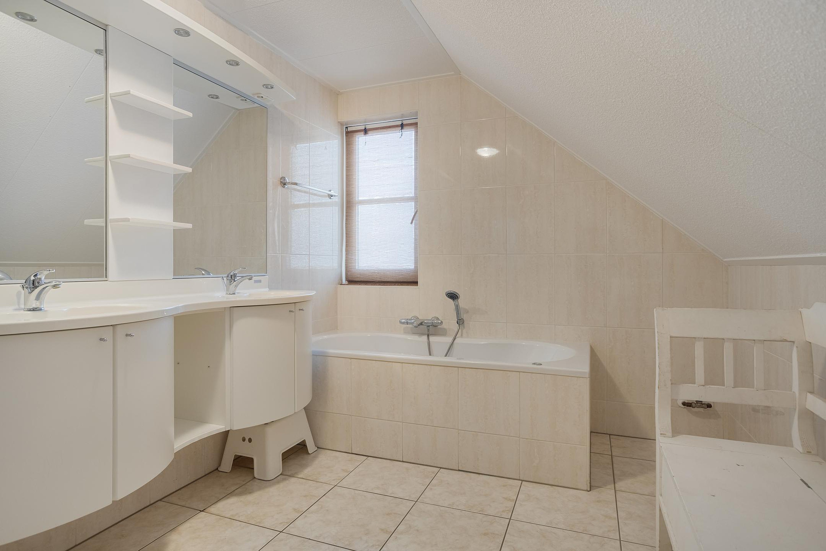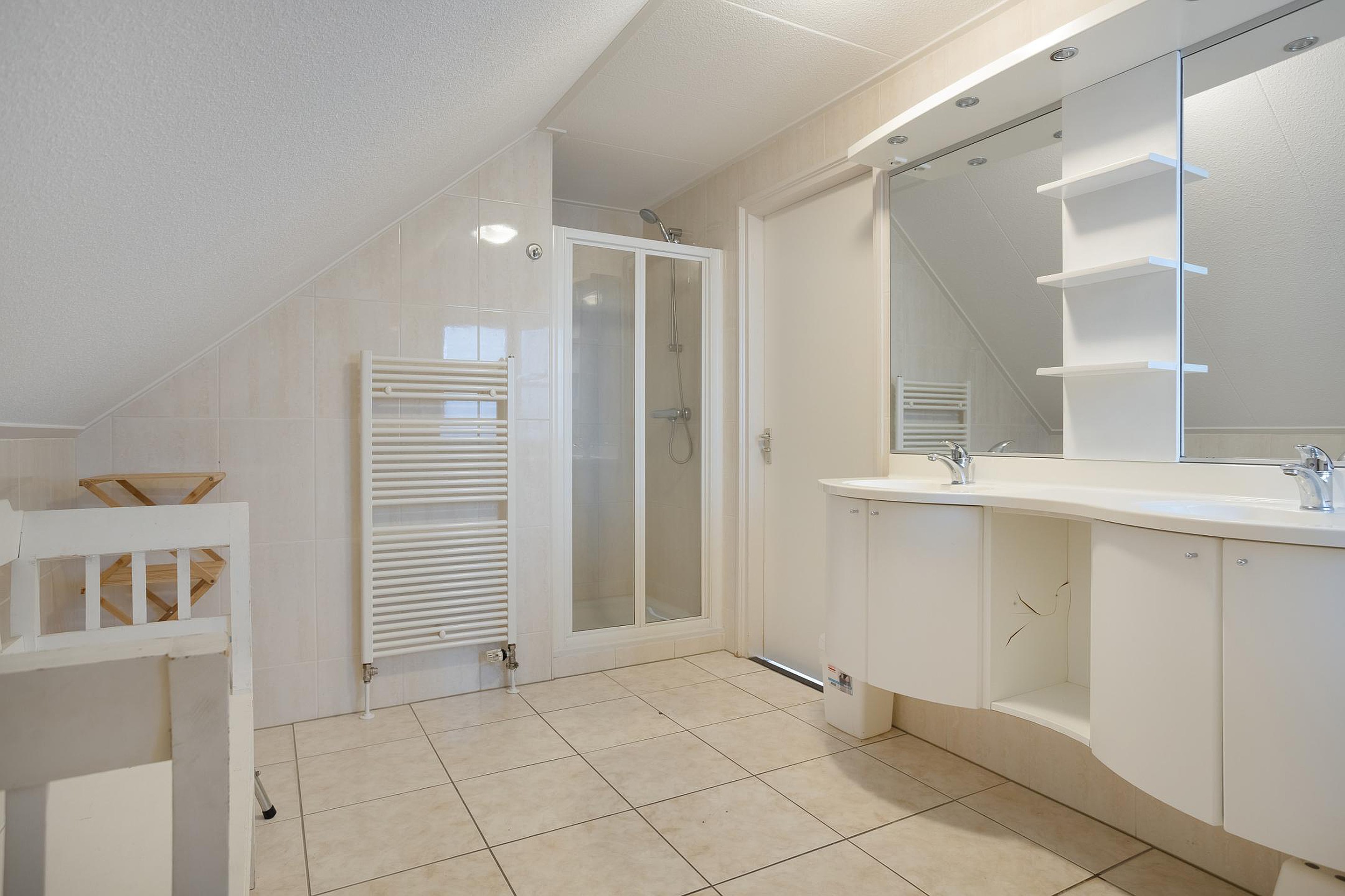 De badkamer (ca. 4.45 x 2.55 m) is ruim opgezet en voorzien van een dubbele wastafel, ligbad, separate douche en vloerverwarming. Daarnaast is er een separaat toilet op de verdieping.