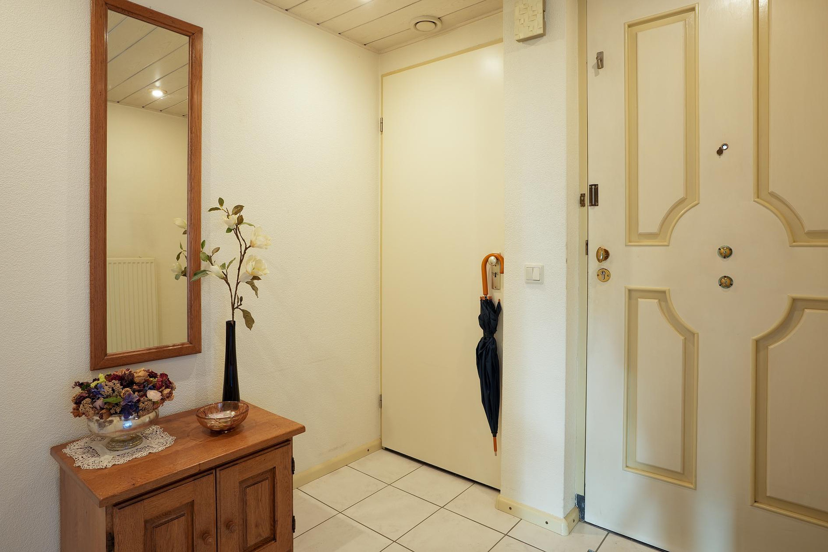 Rechts van de oprit is een pad naar de overdekte entree, met een stijlvolle voordeur en inbouwverlichting in het plafond. Achter deze deur is de hal met de meterkast en de toiletruimte, uitgevoerd met een fonteintje en tegelwerk in merendeels wit.