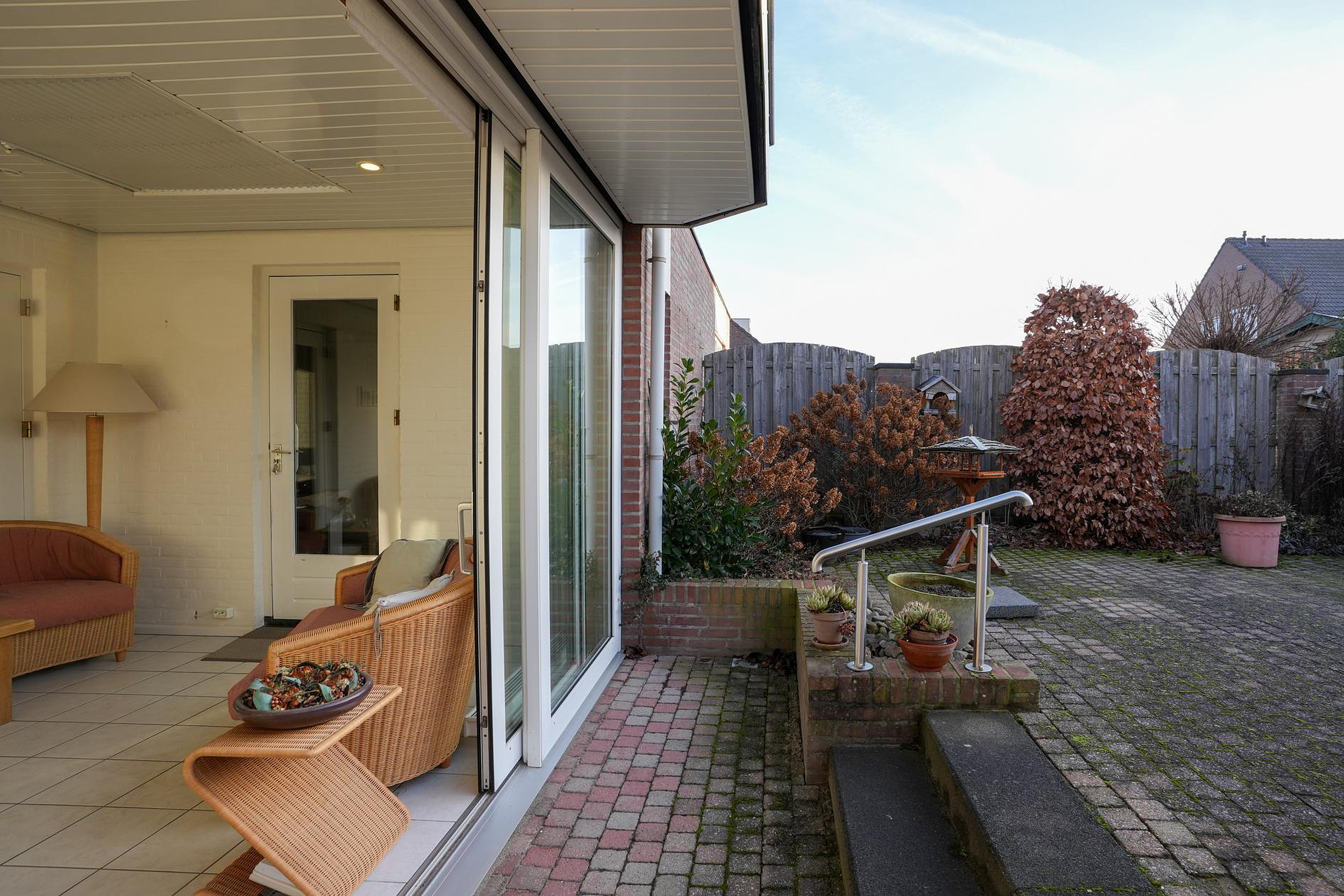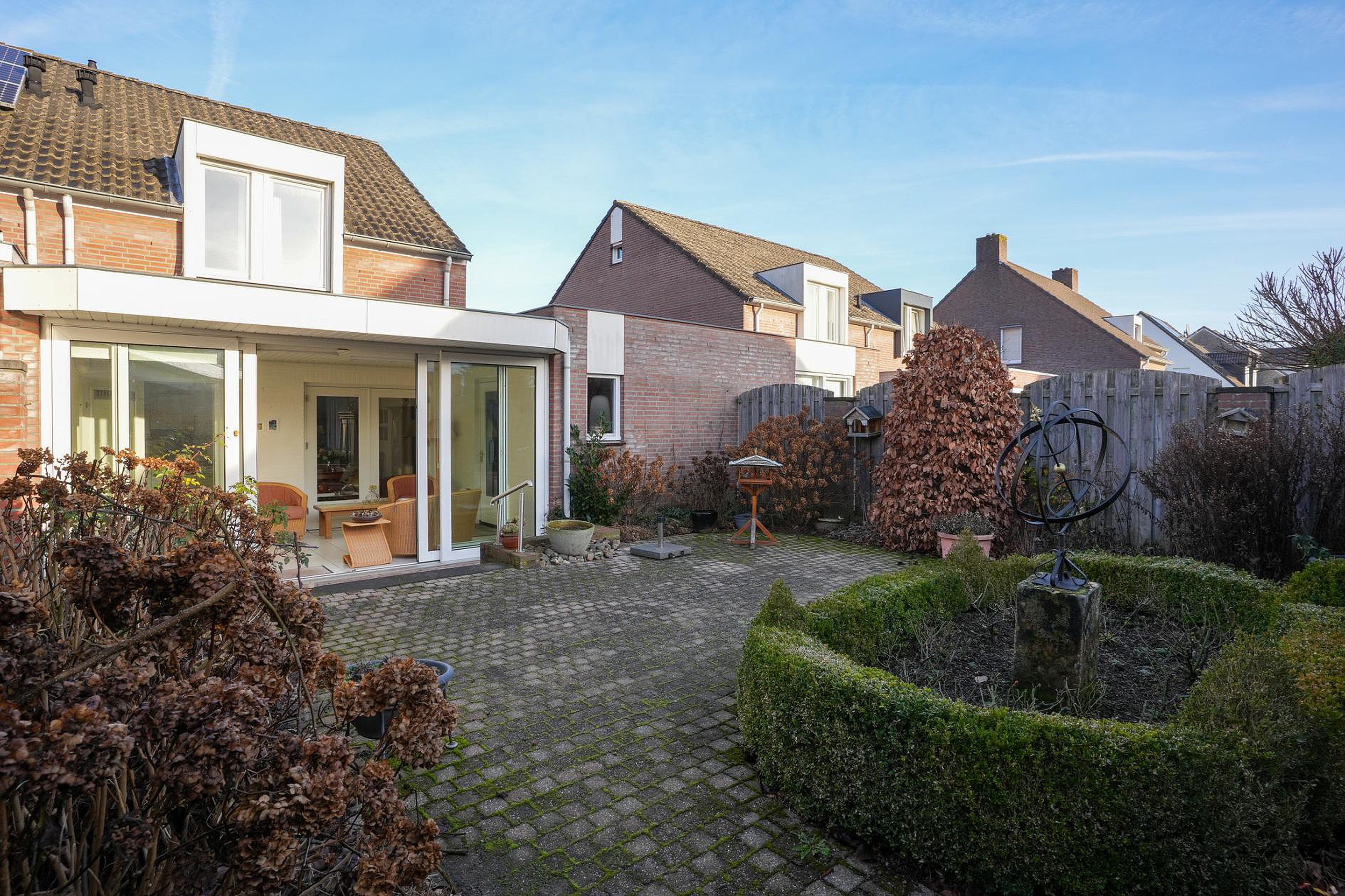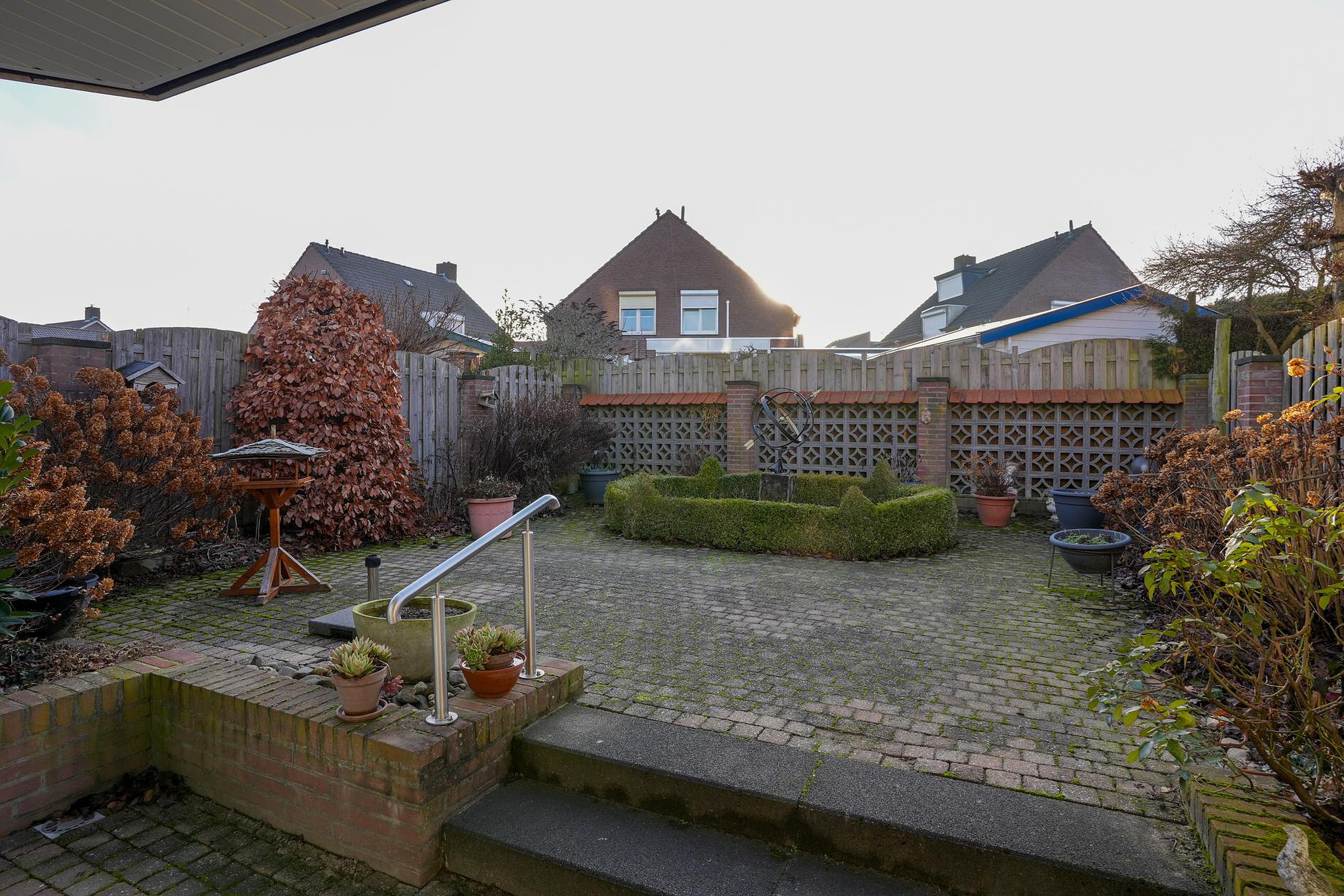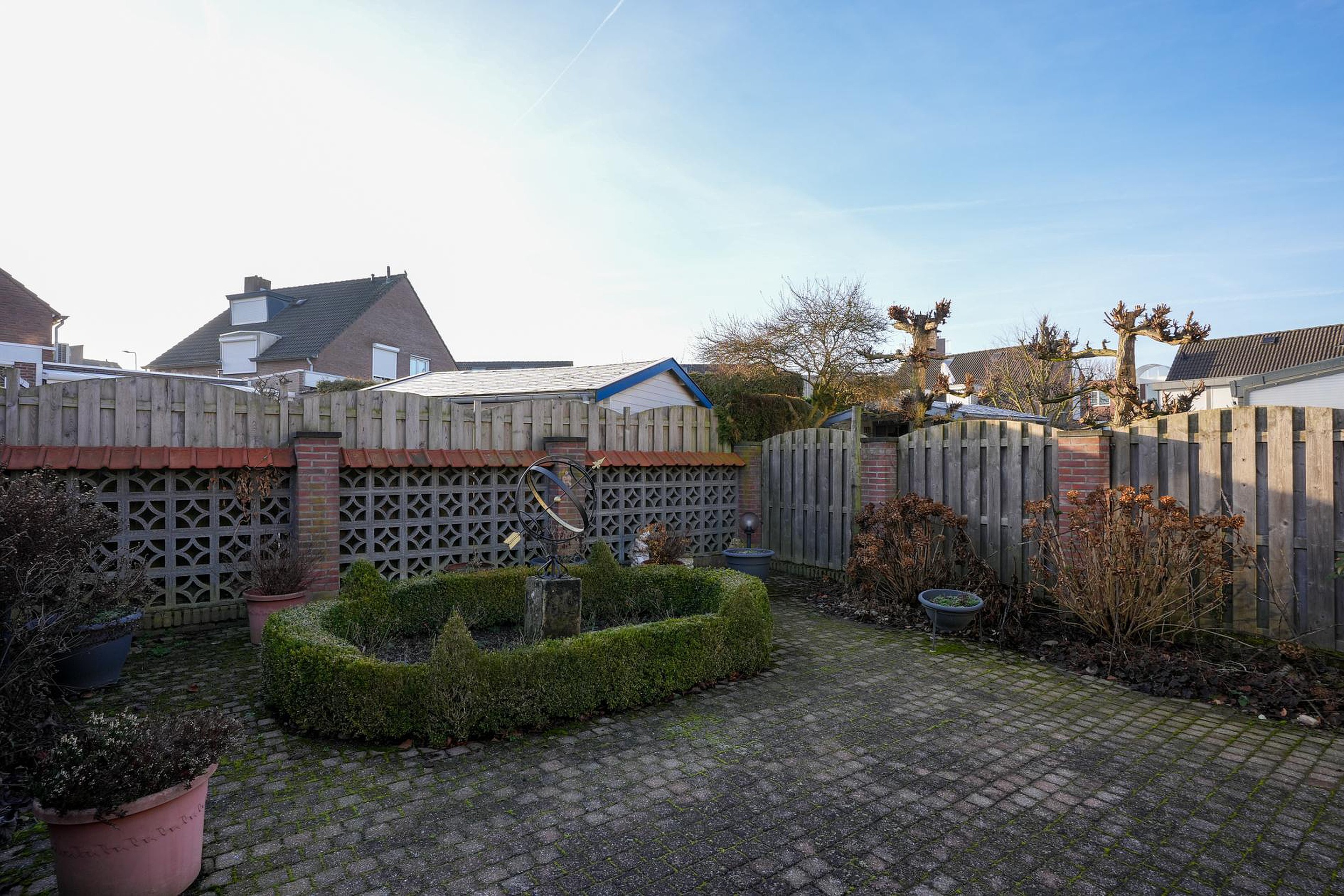 Open de schuifdeuren in de serre en loop de achtertuin in, gesitueerd op het zuiden. Een groot deel van de tuin is bestraat, maar er is ook ruimte voor beplanting. Dit is een fijne tuin, waar genoeg plek is om in de zon te zitten. De voortuin met lage, merendeels groenblijvende beplanting heeft weinig onderhoud nodig.