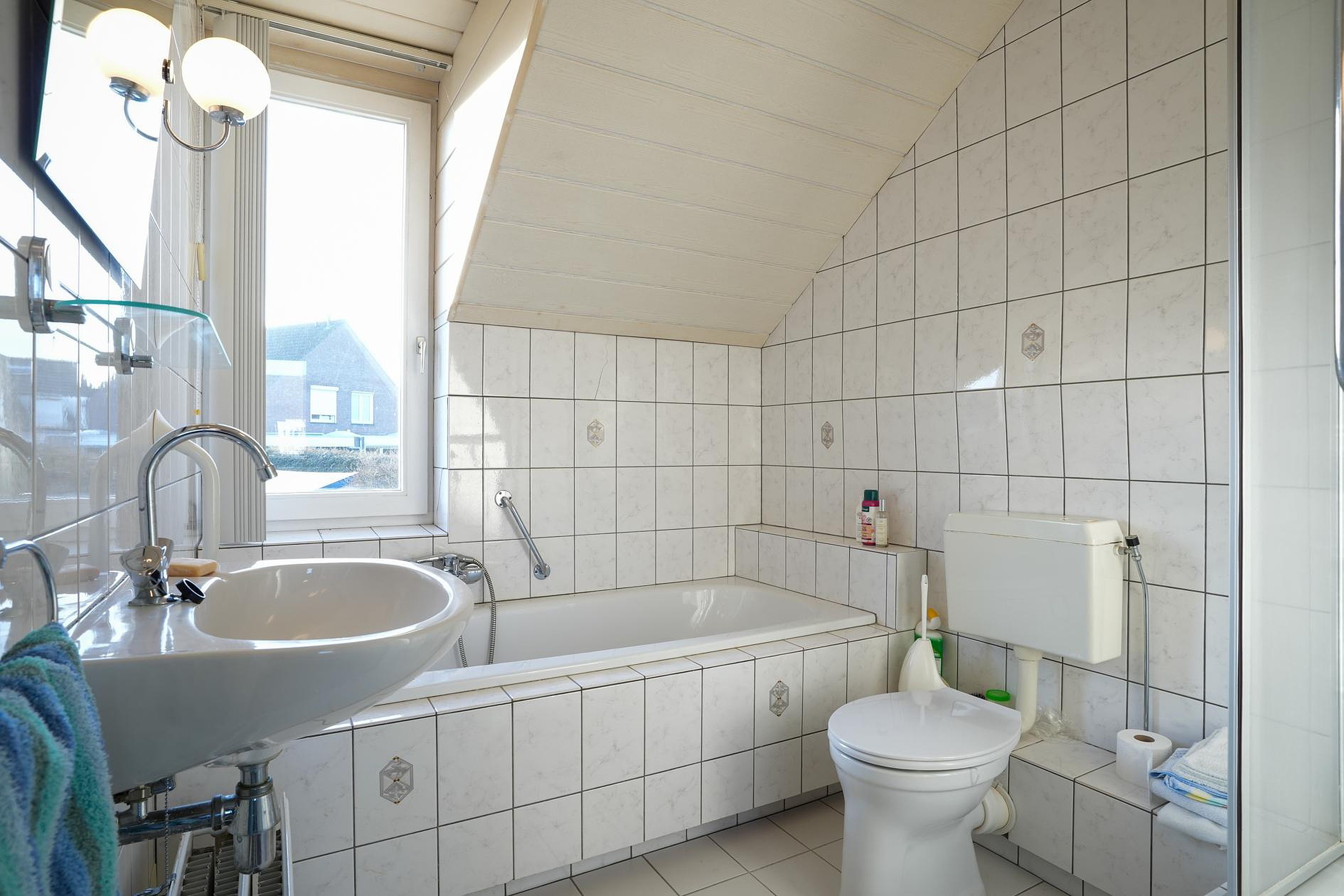 Naast deze slaapkamer is de badkamer, origineel van het bouwjaar van het huis. Bij de dakkapel is het ligbad, er is een aparte douche en een tweede toilet ontbreekt niet. Bij de wastafel hangen een plateau, een spiegel en verlichting. Deze badkamer vormt, zeker qua indeling, een goede basis om naar eigen smaak te vernieuwen.