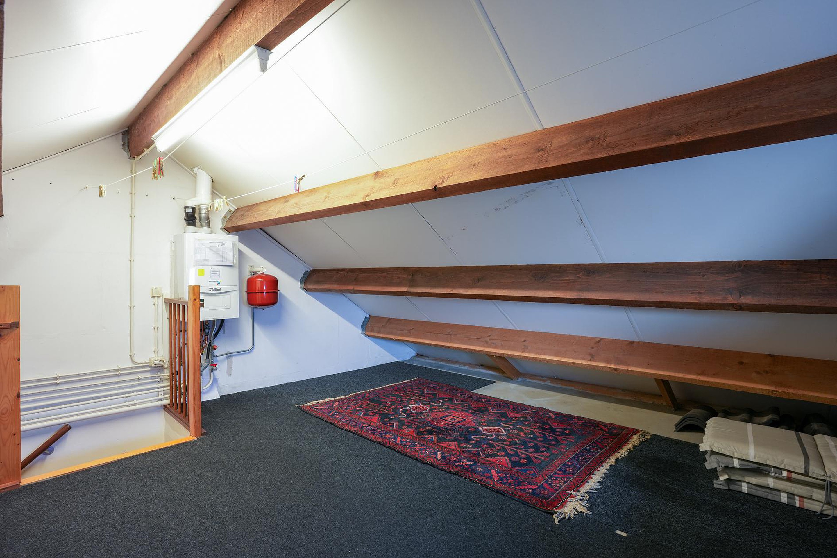 Een vaste trap geeft toegang tot een zolderruimte (circa 12,7 m2), met de opstelling van de VHR-ketel. Aan een kant is een diepe kast met schuifdeuren gemaakt en de rest van de zolder is geschikt als berging, hobbyruimte en/of speelplek van de kinderen. De buren hebben een dakkapel geplaatst, voor extra ruimte en lichtinval.