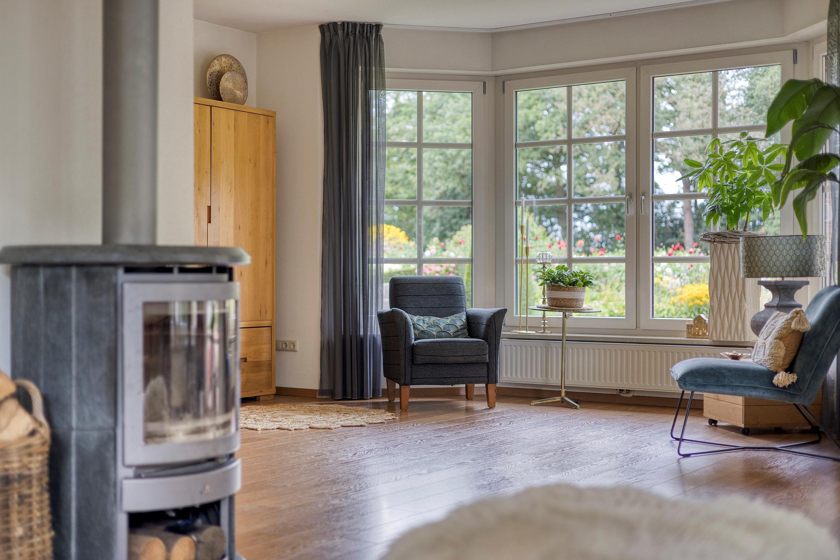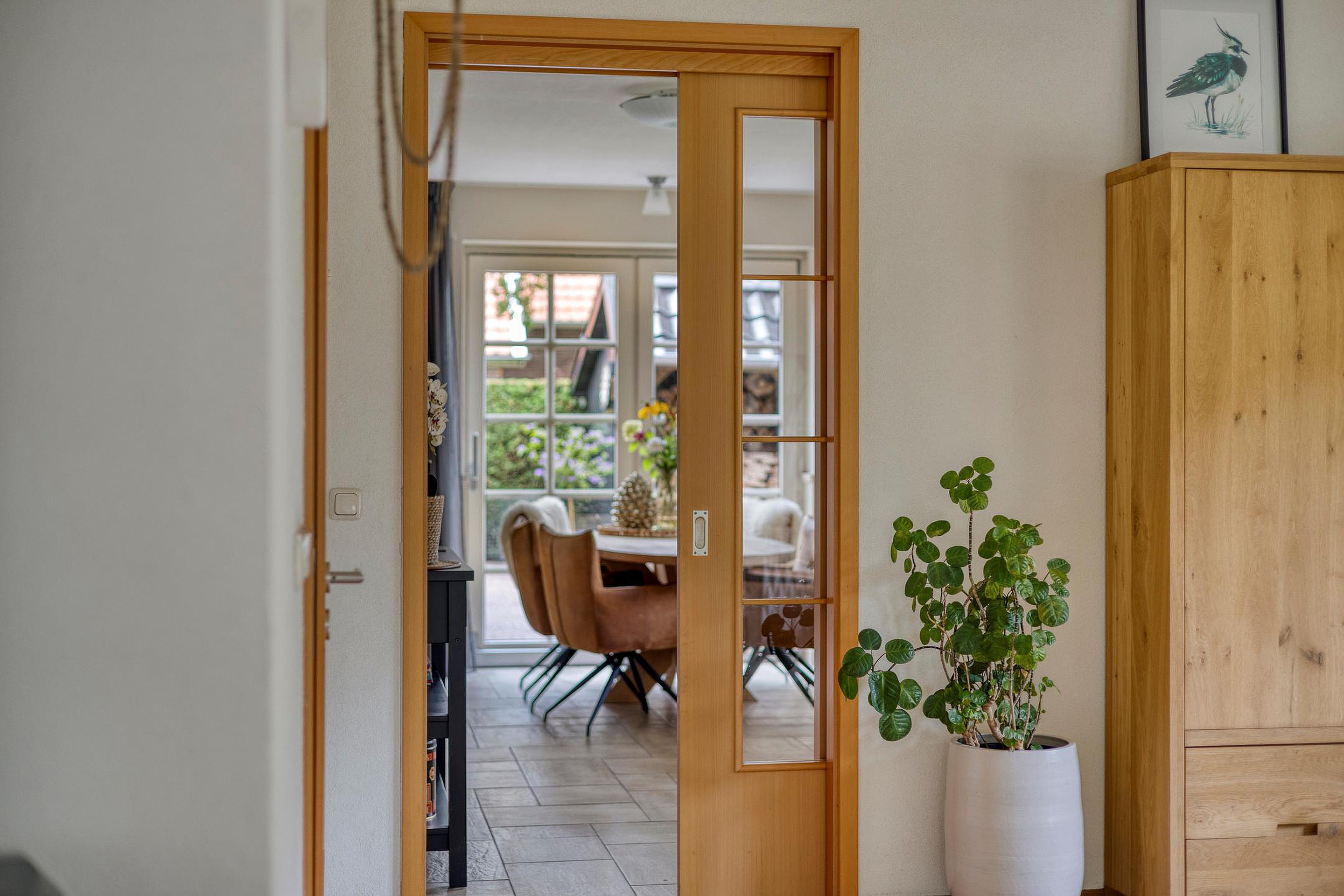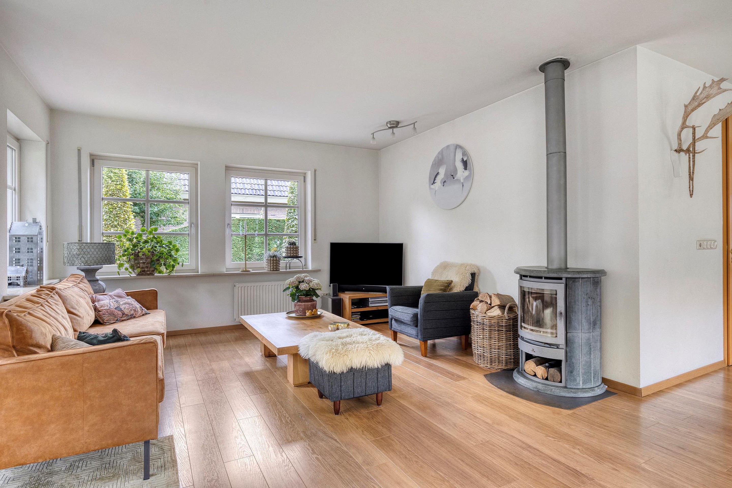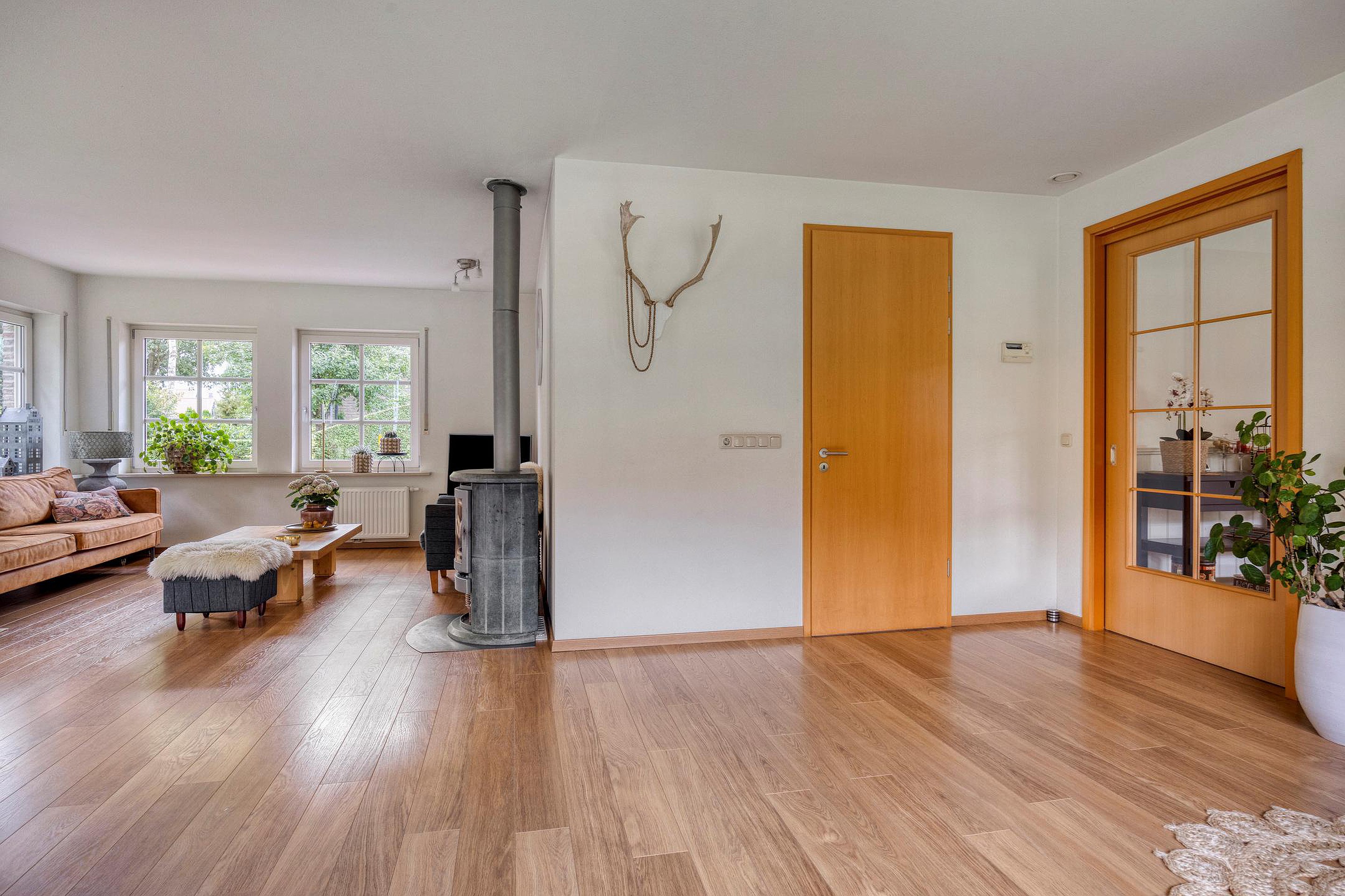Begane grond: Ruime entree met houten vloer, trapopgang, meterkast en hangtoilet met fontein. Vanuit de hal is er toegang tot de lichte woonkamer met grote raampartijen, een sfeervolle houtkachel en houten vloer. De woonkamer staat in verbinding met de nette keuken, welke is voorzien van diverse inbouwapparatuur. Aangrenzend bevindt zich een praktische werkkamer.