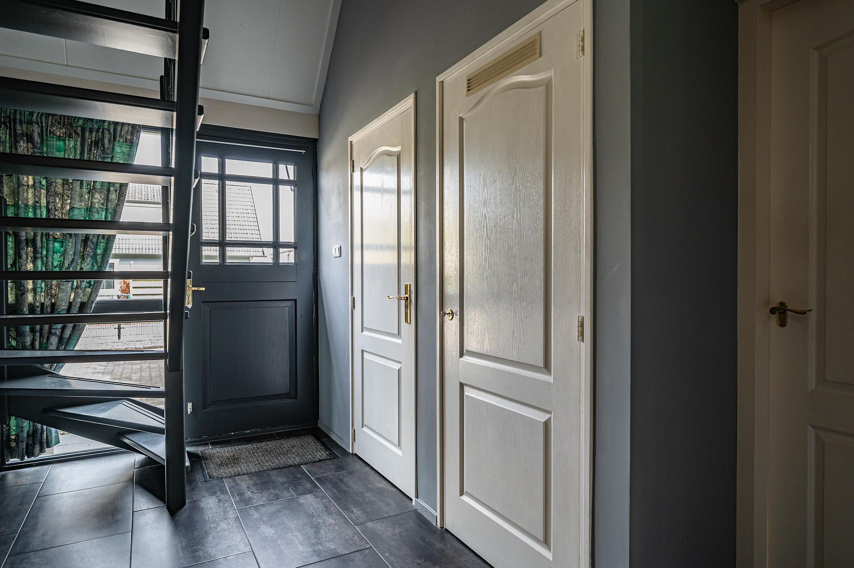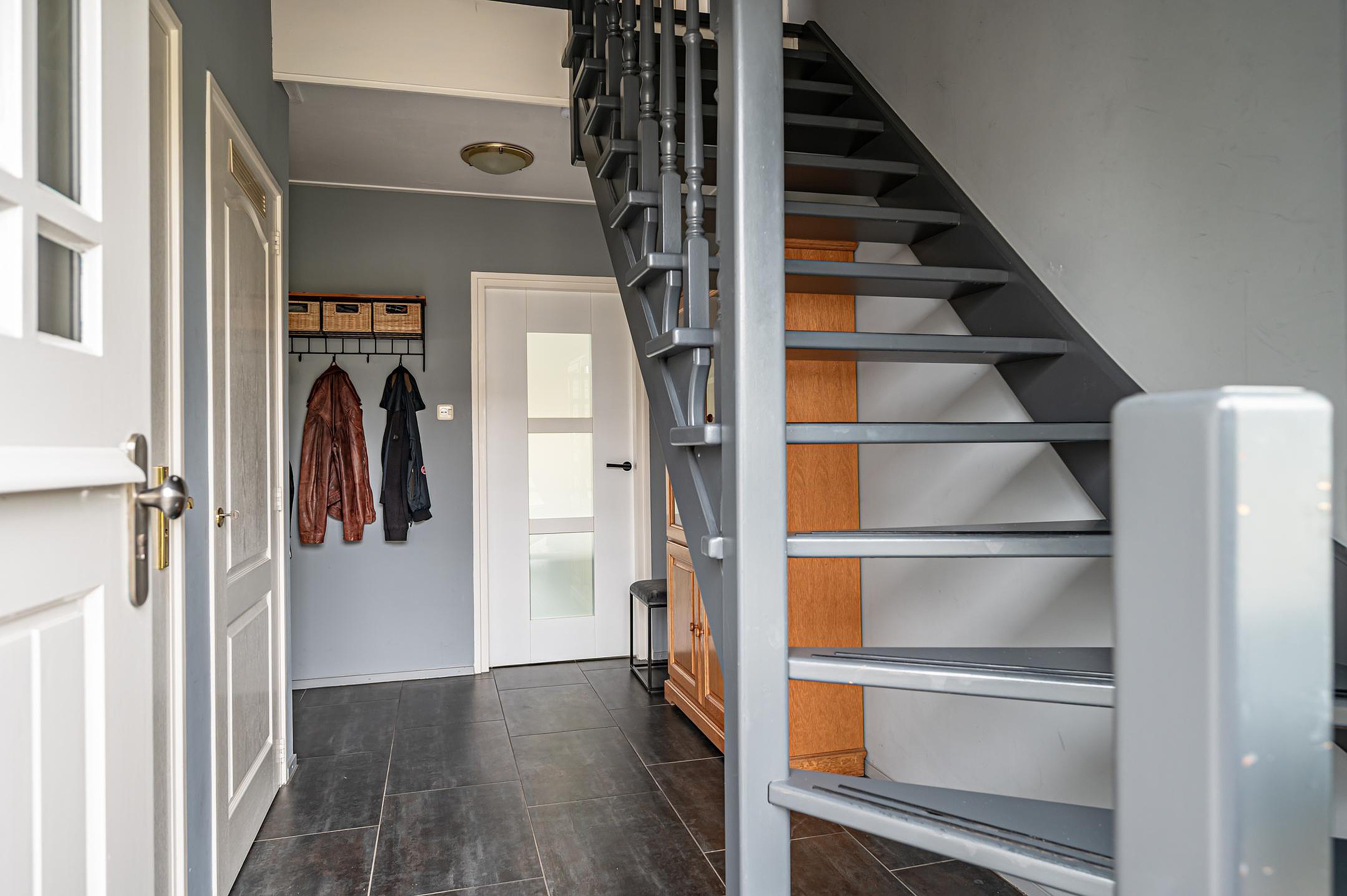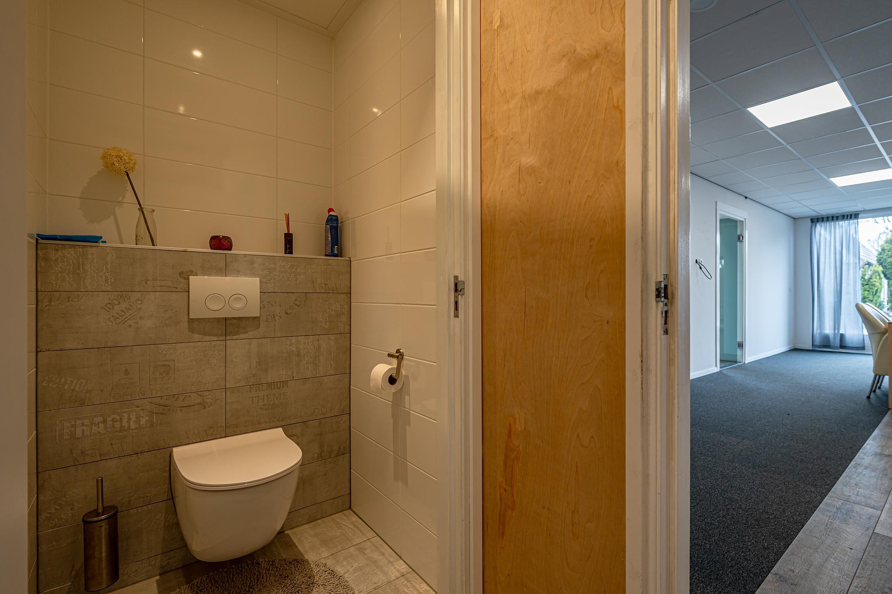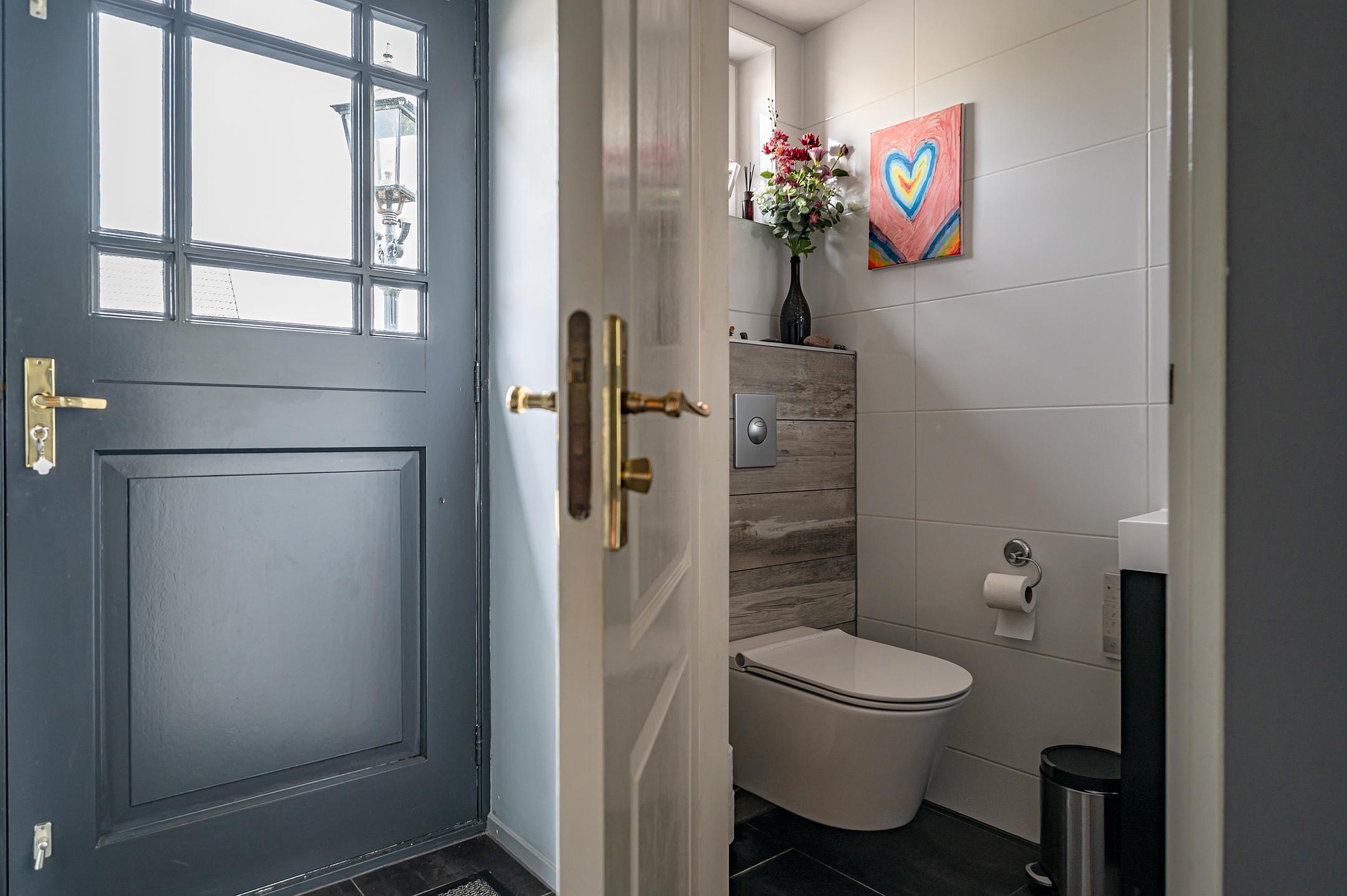 Entree/hal met trapopgang, meterkast (opstelling waterontharder) en trapopgang. Moderne toiletruimte (ca. 2023) met hangend spoeltoilet met afstandsbediening en wastafel. Vanuit de hal toegang tot een kantoorruimte, welke eventueel ook geschikt is voor het realiseren van een slaap- en badkamer op de begane grond.