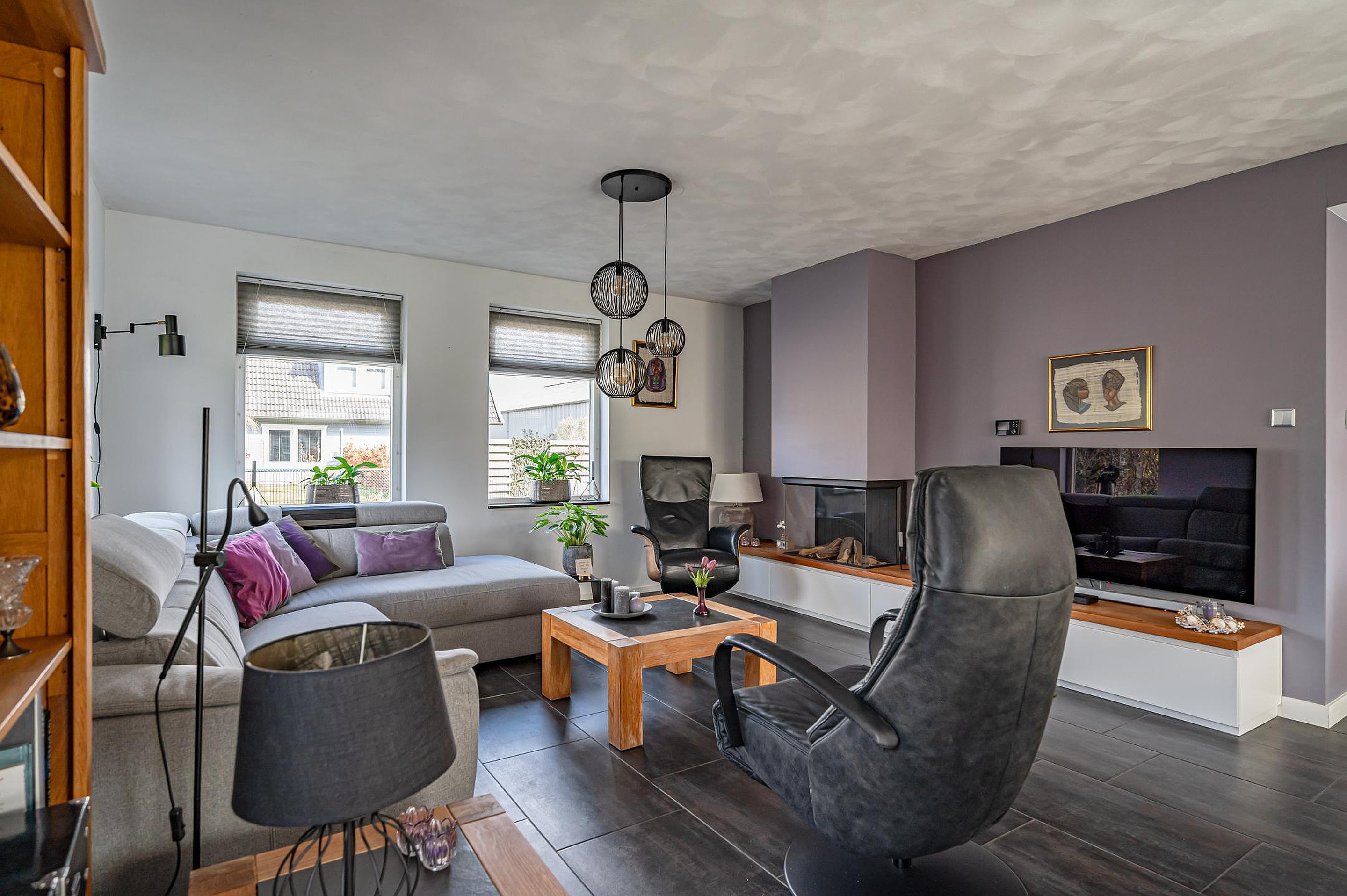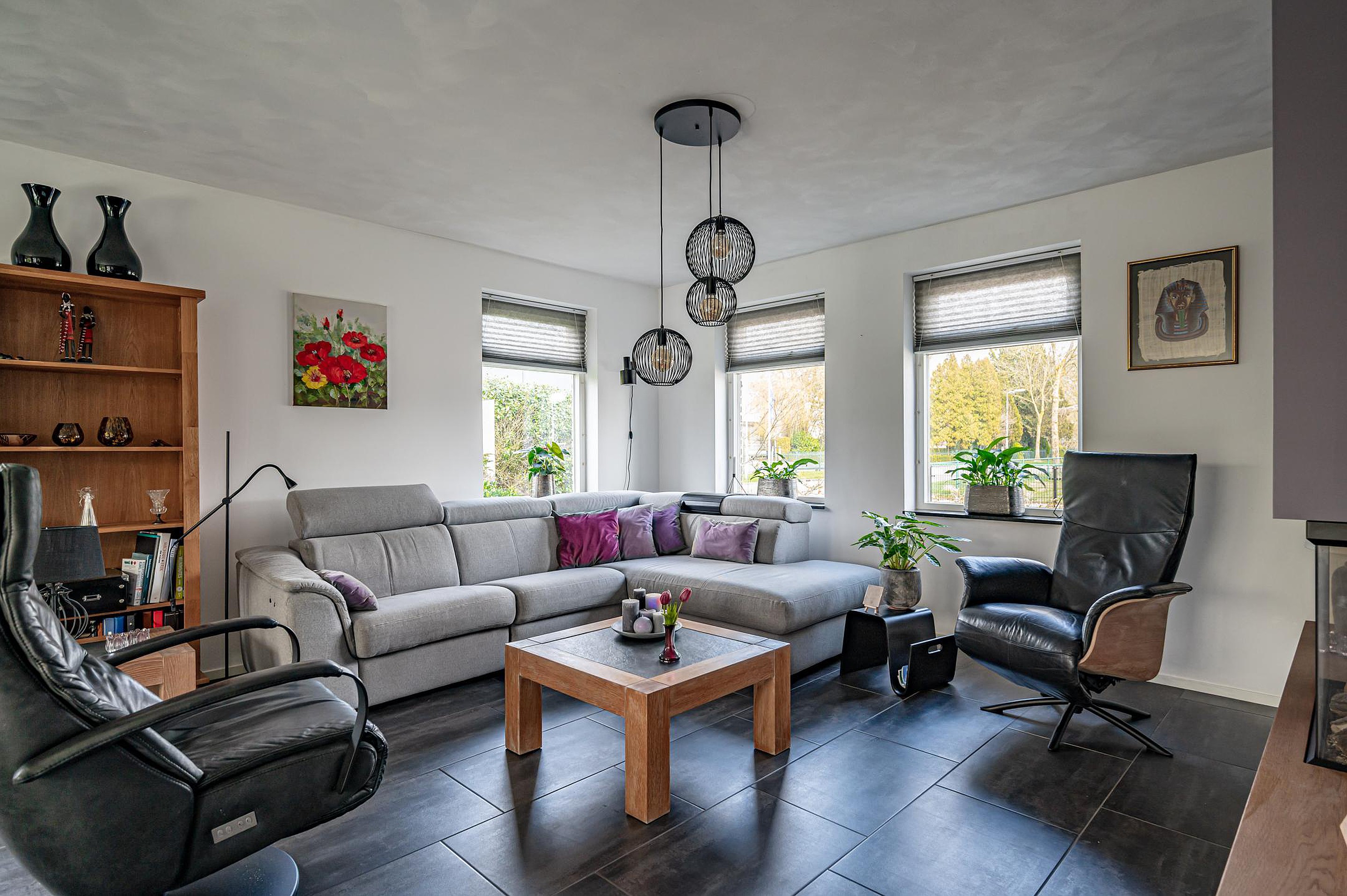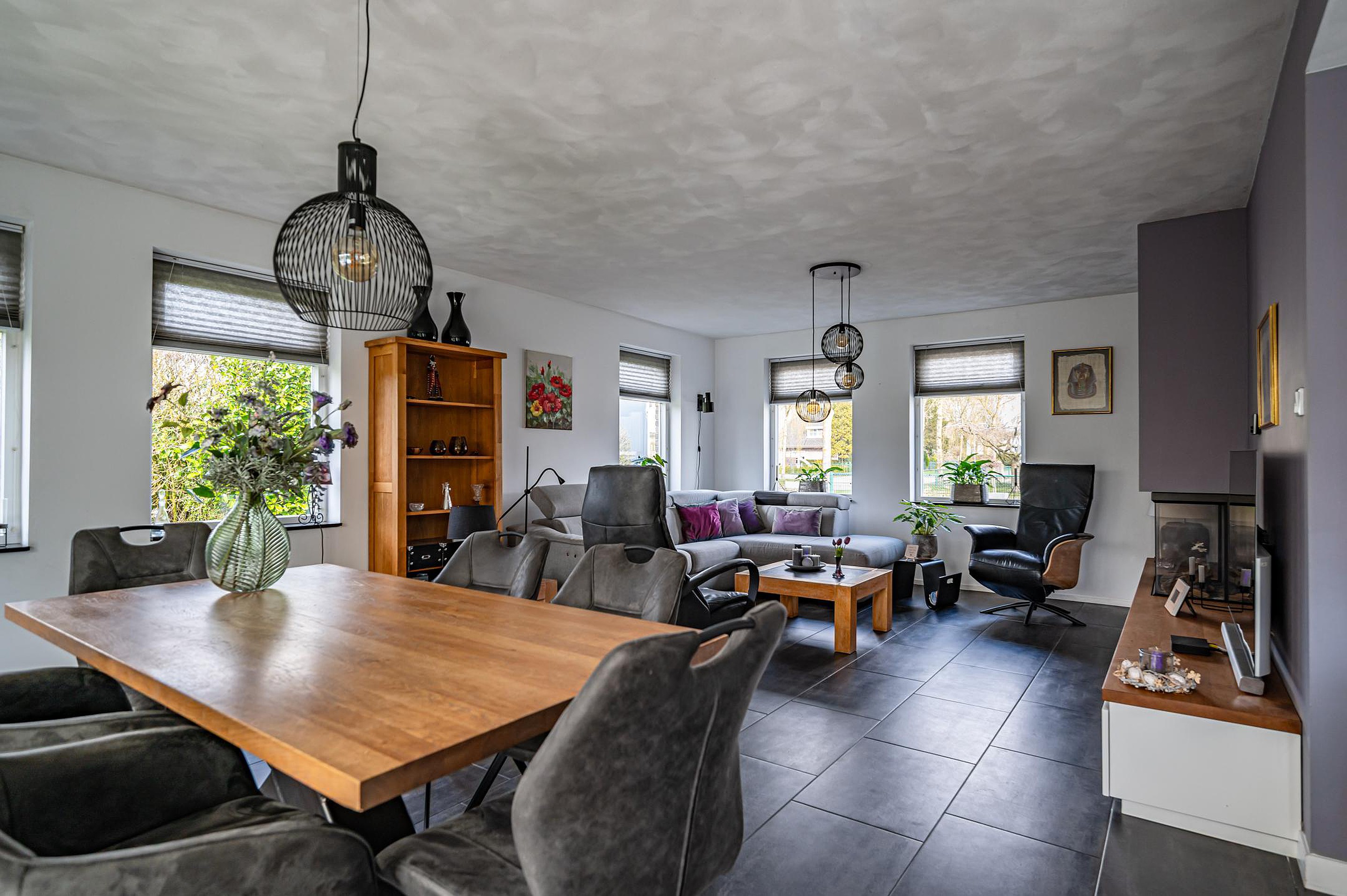 De royale en lichte woonkamer is voorzien van een schuifpui naar de overkapping en een stijlvol design wandmeubel.