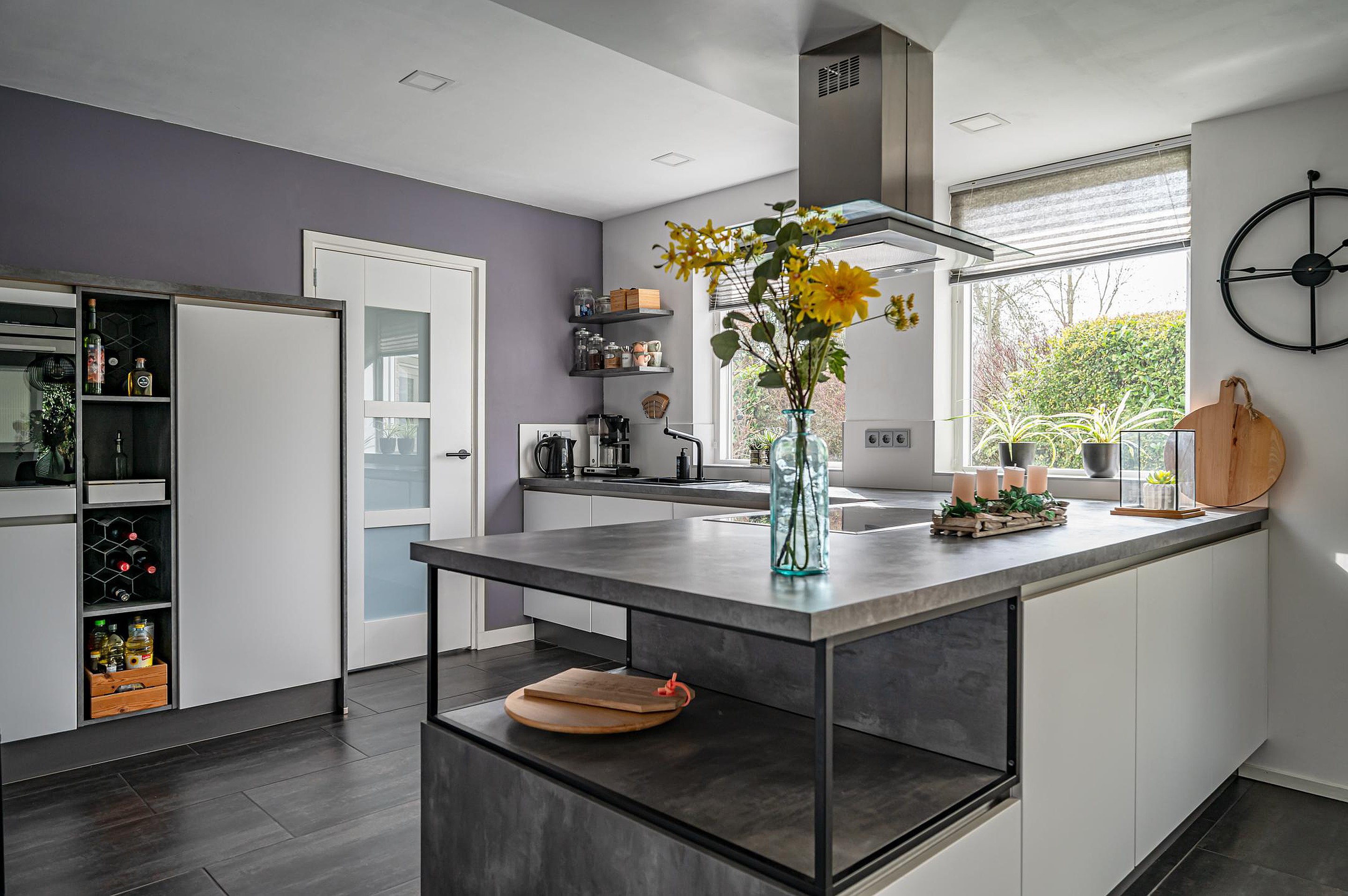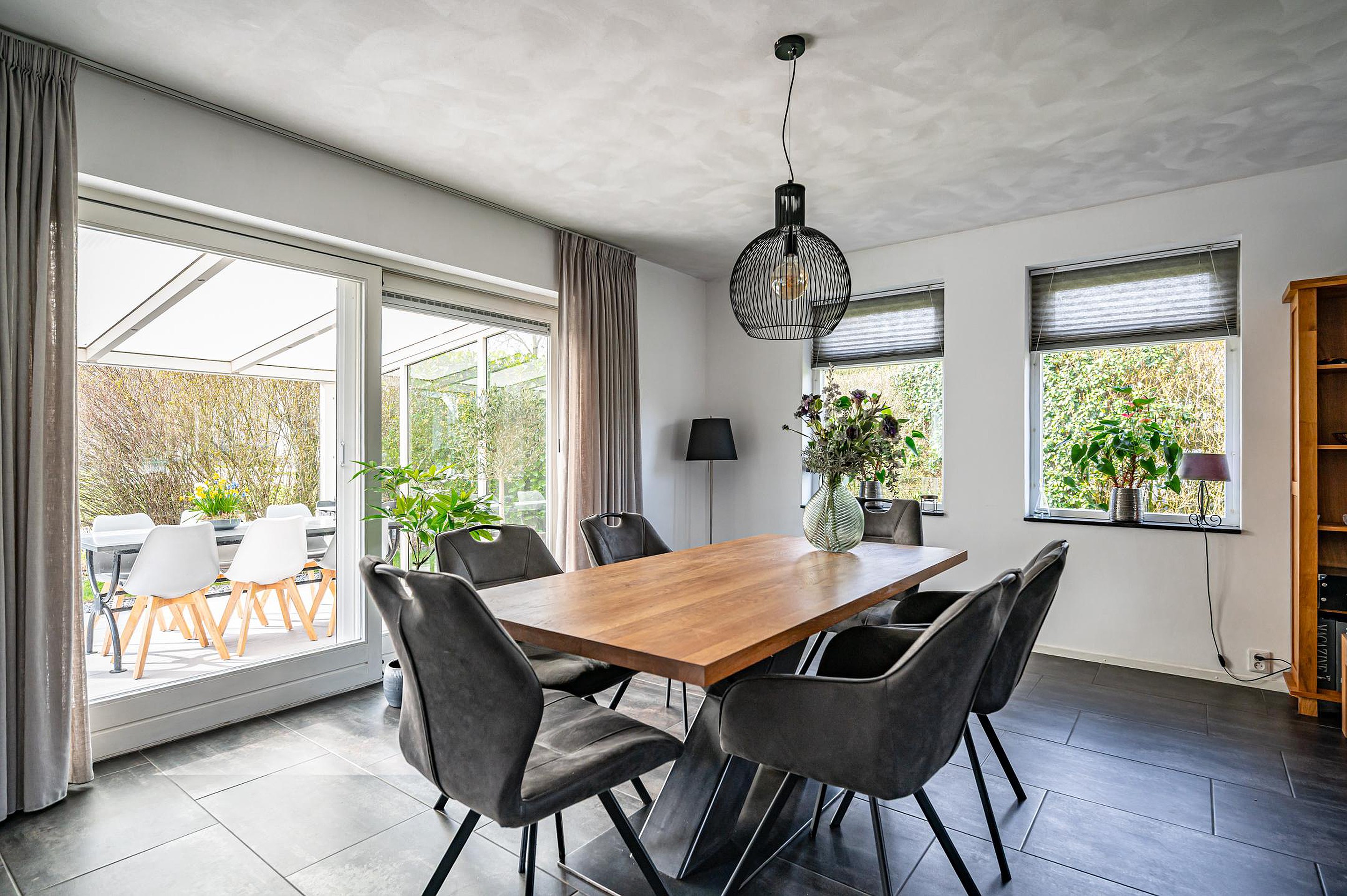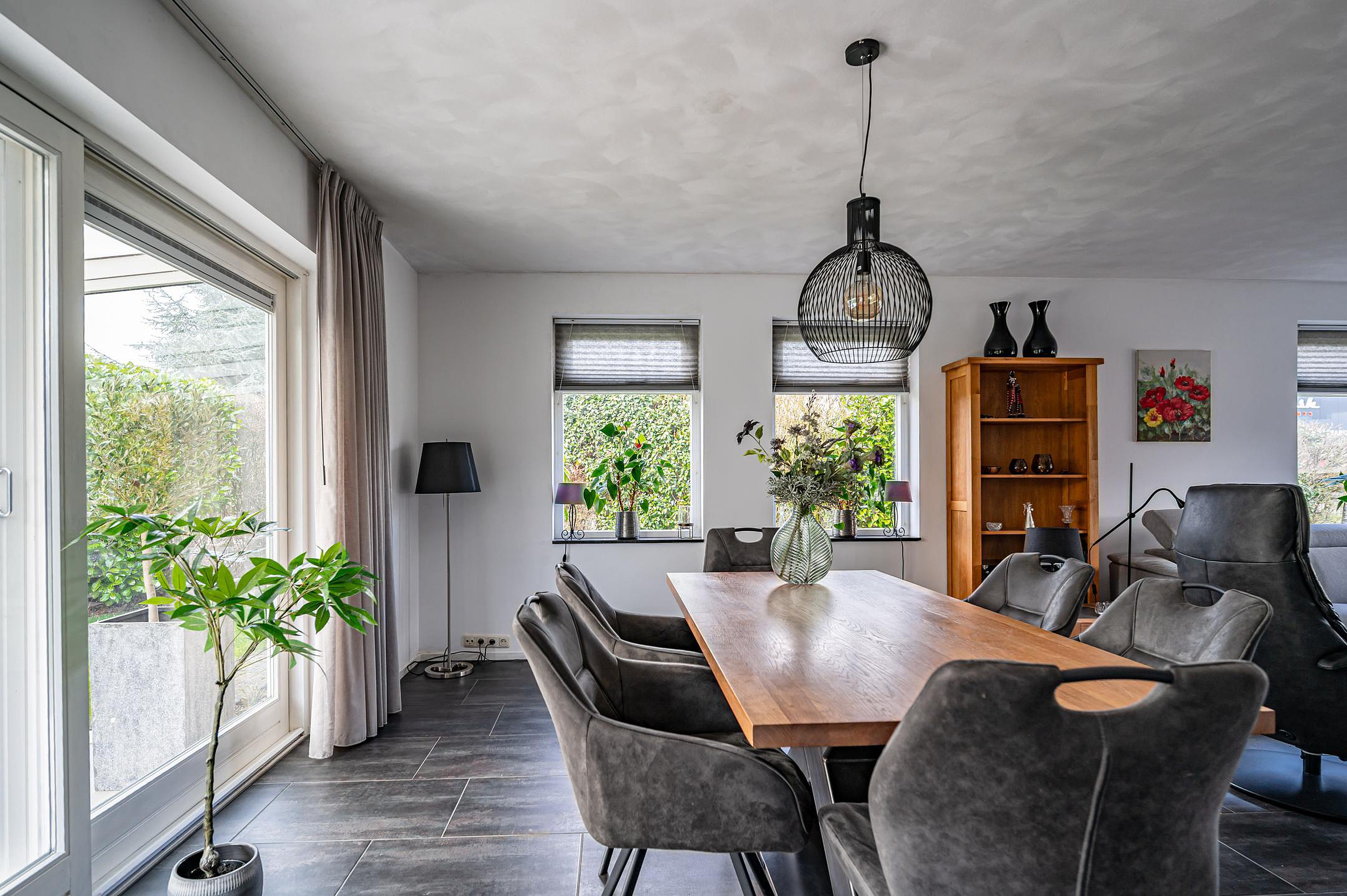 De royale en lichte woonkamer is voorzien van een schuifpui naar de overkapping en een stijlvol design wandmeubel.