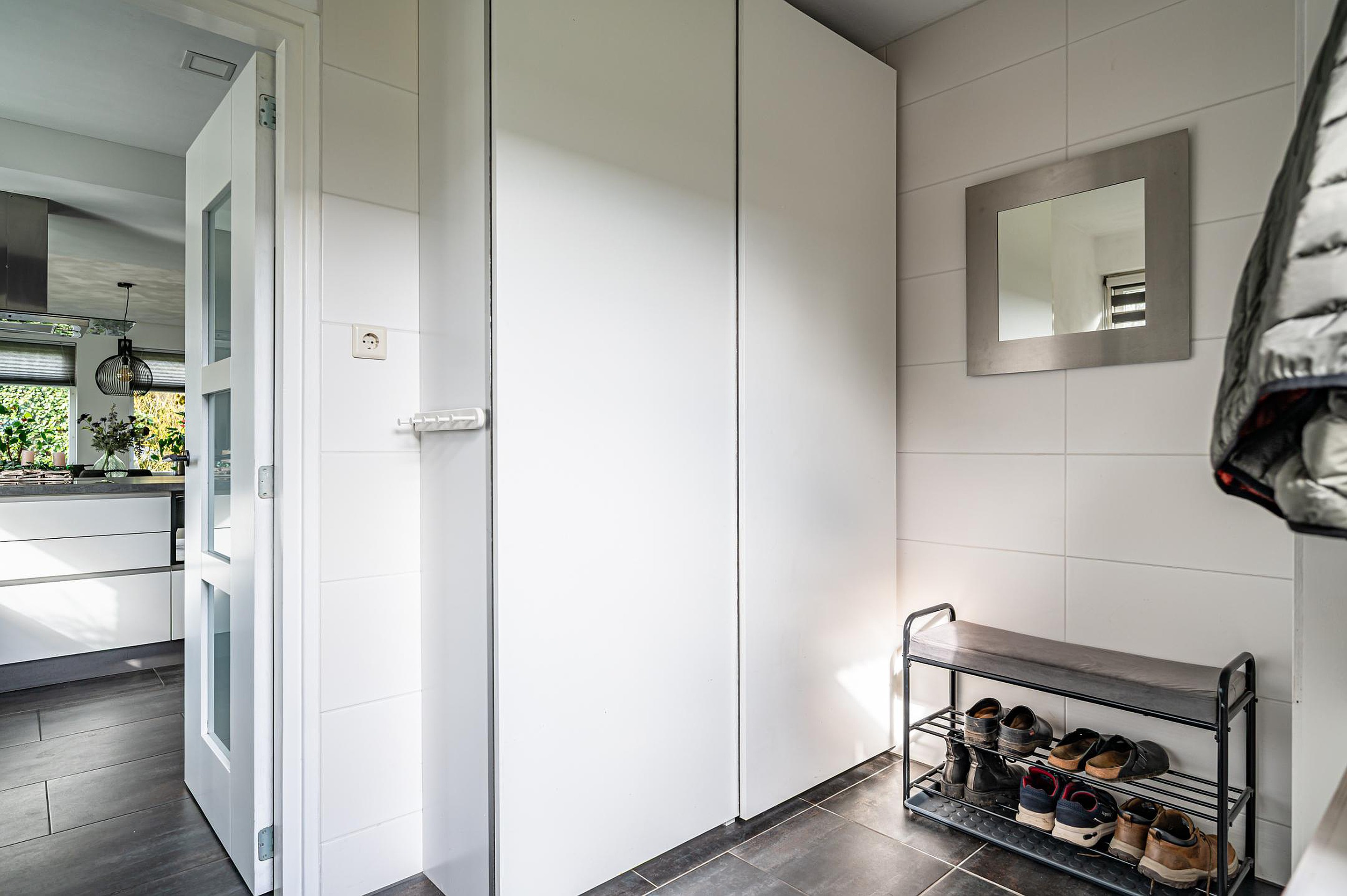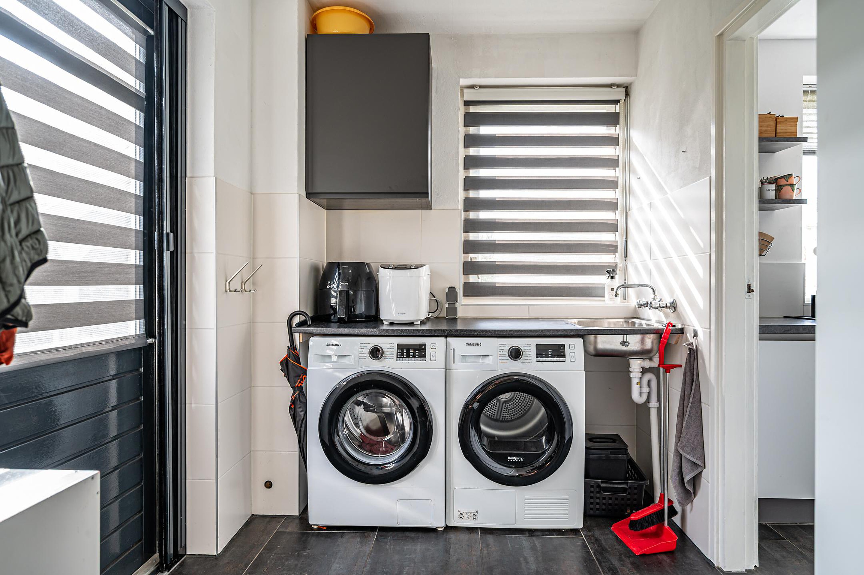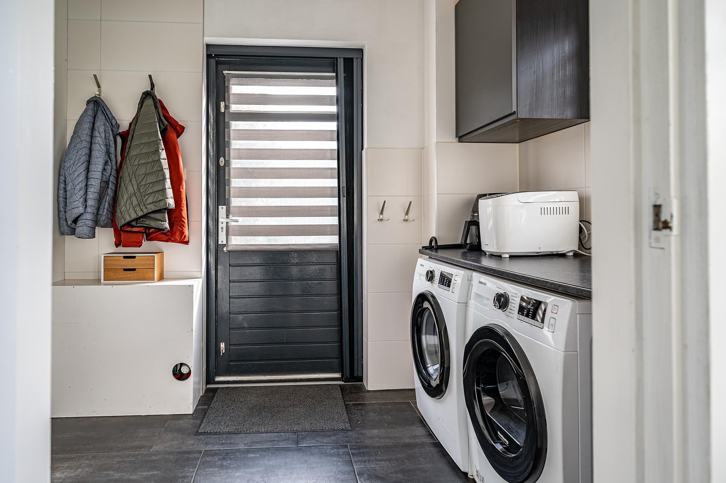 De praktische bijkeuken beschikt over een werkblad met wastafel, aansluitingen voor witgoed en de opstelling van de warmtepomp (2024). Vanuit de bijkeuken is er toegang tot de tuin.