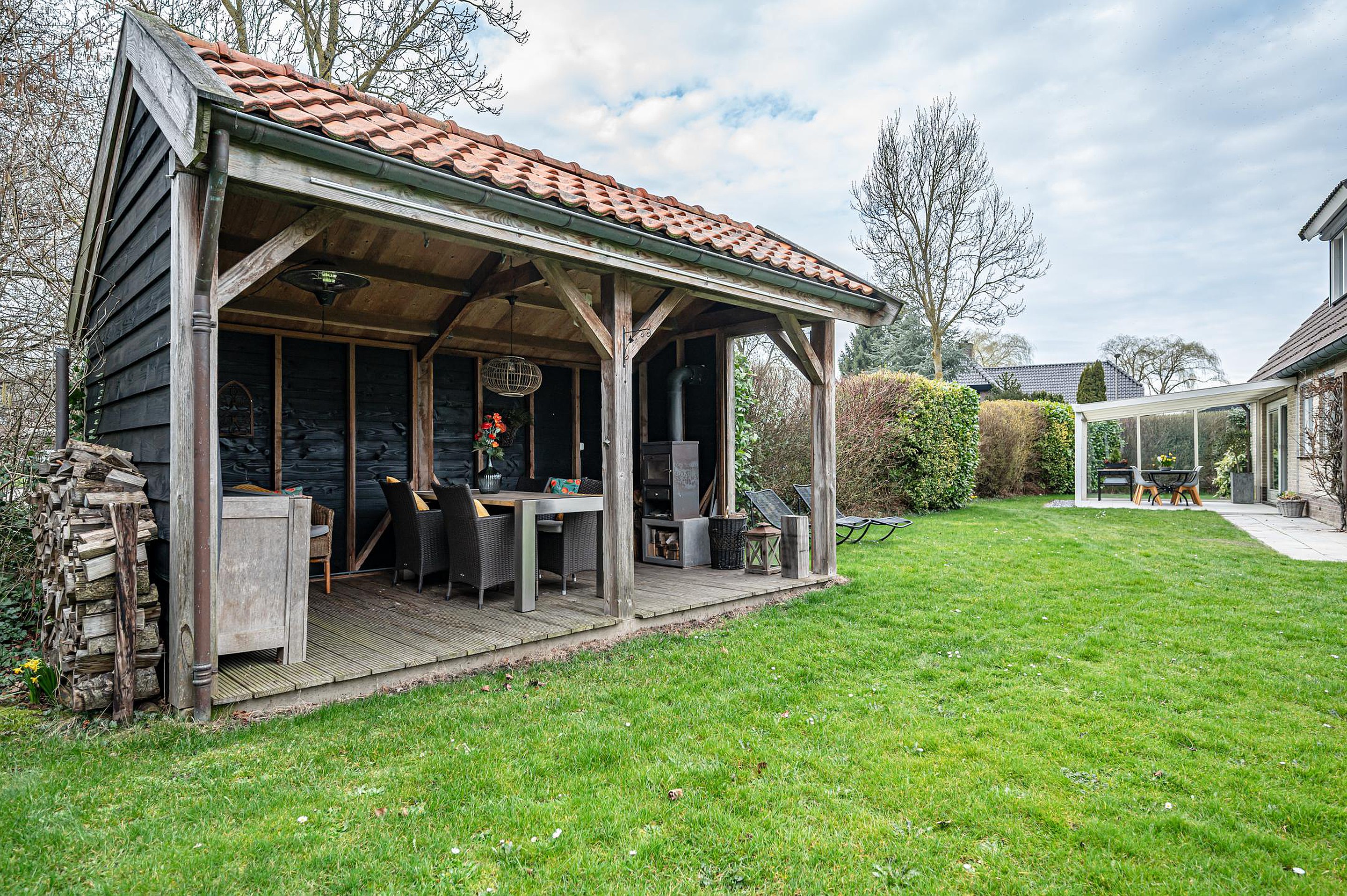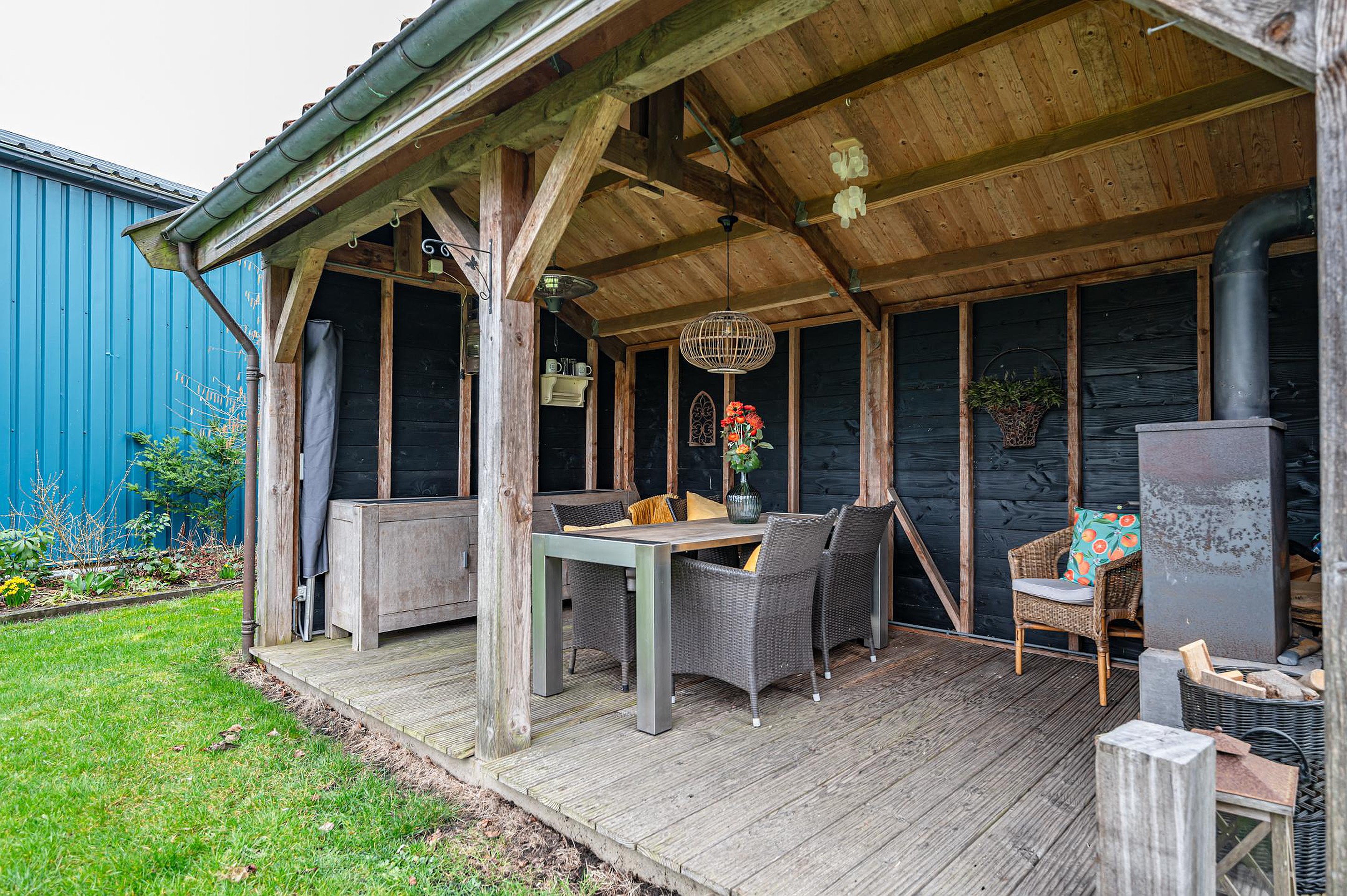 - houten overkapping met pannendak en houtkachel