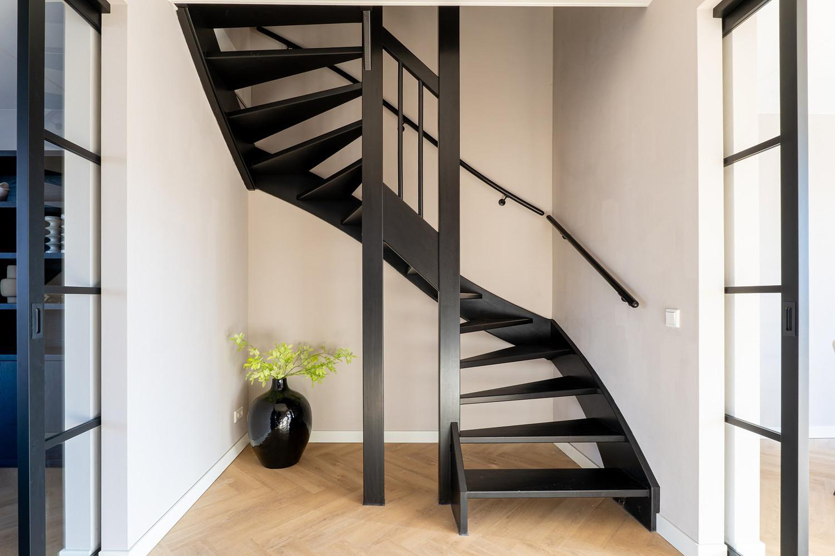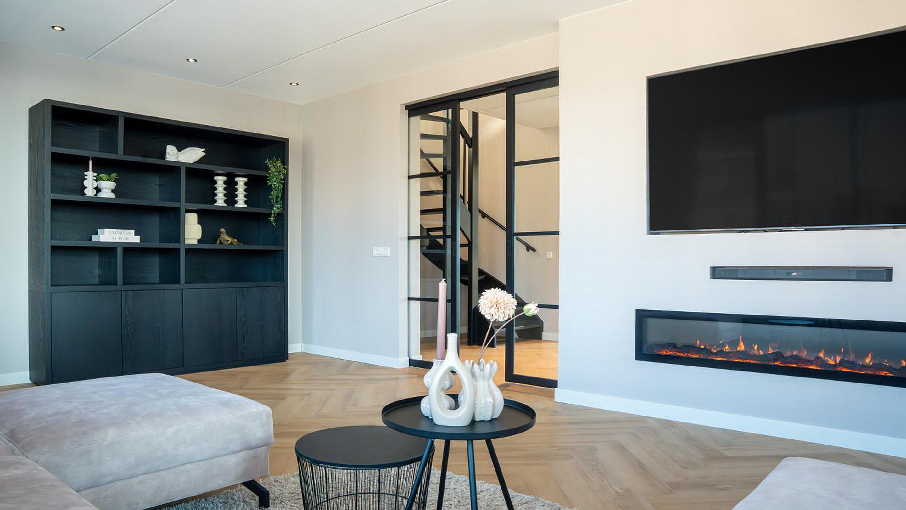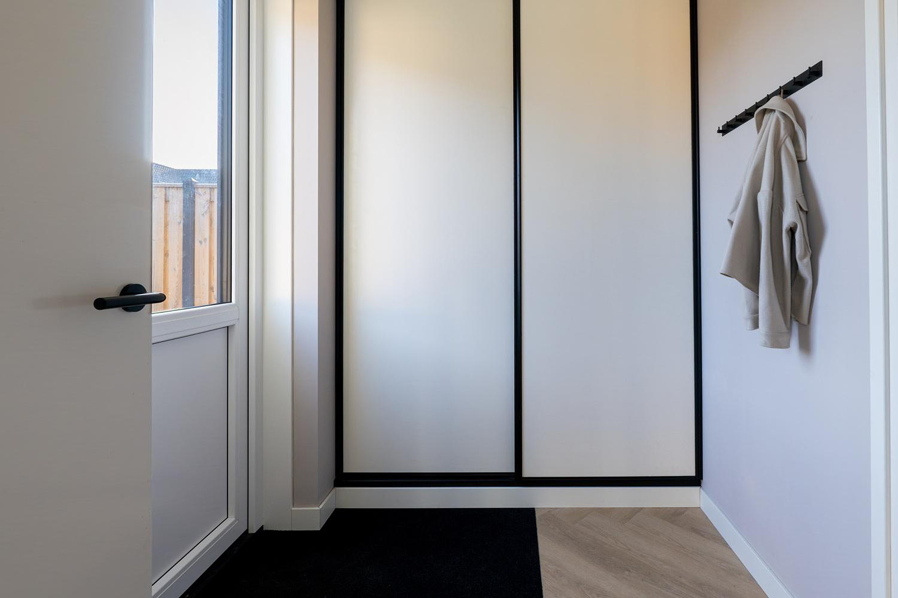 Begane grond Entree, hal, ingebouwde schoenenkast, meterkast met 16 groepen en 3 fasen aansluiting, tijdschakelaar voor inbouwspotjes, modern toilet (wandcloset) met fonteintje en trapopgang naar de eerste verdieping. De ruime woonkamer heeft een prachtige visgraat PVC-vloer met vloerverwarming. De smaakvolle woon-leefkeuken en de woonkamer kunnen worden afgesloten met stijlvolle en-suite deuren. De kunststof kozijnen met triple glas zorgen voor een optimale isolatie en een heerlijk stil binnenklimaat.