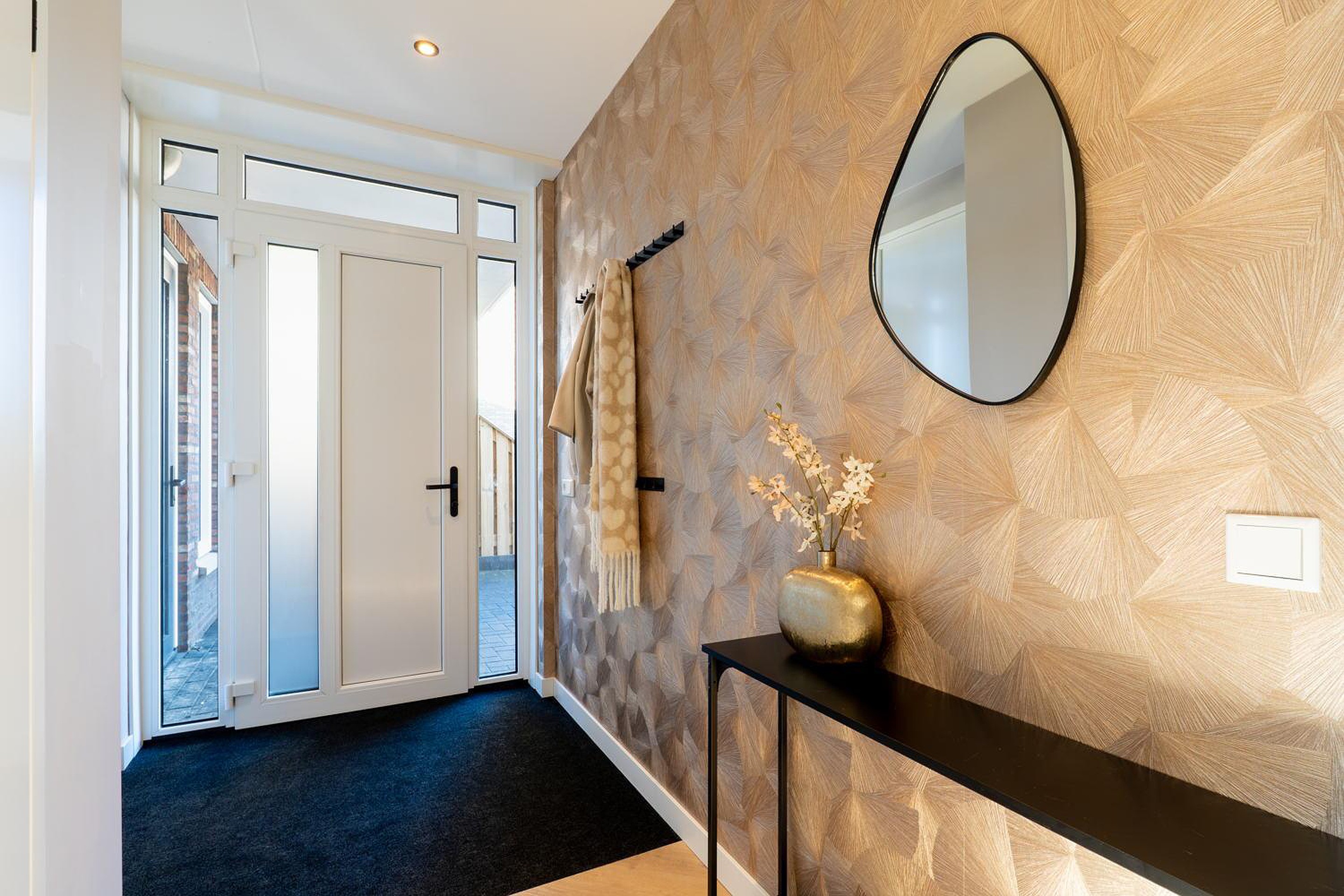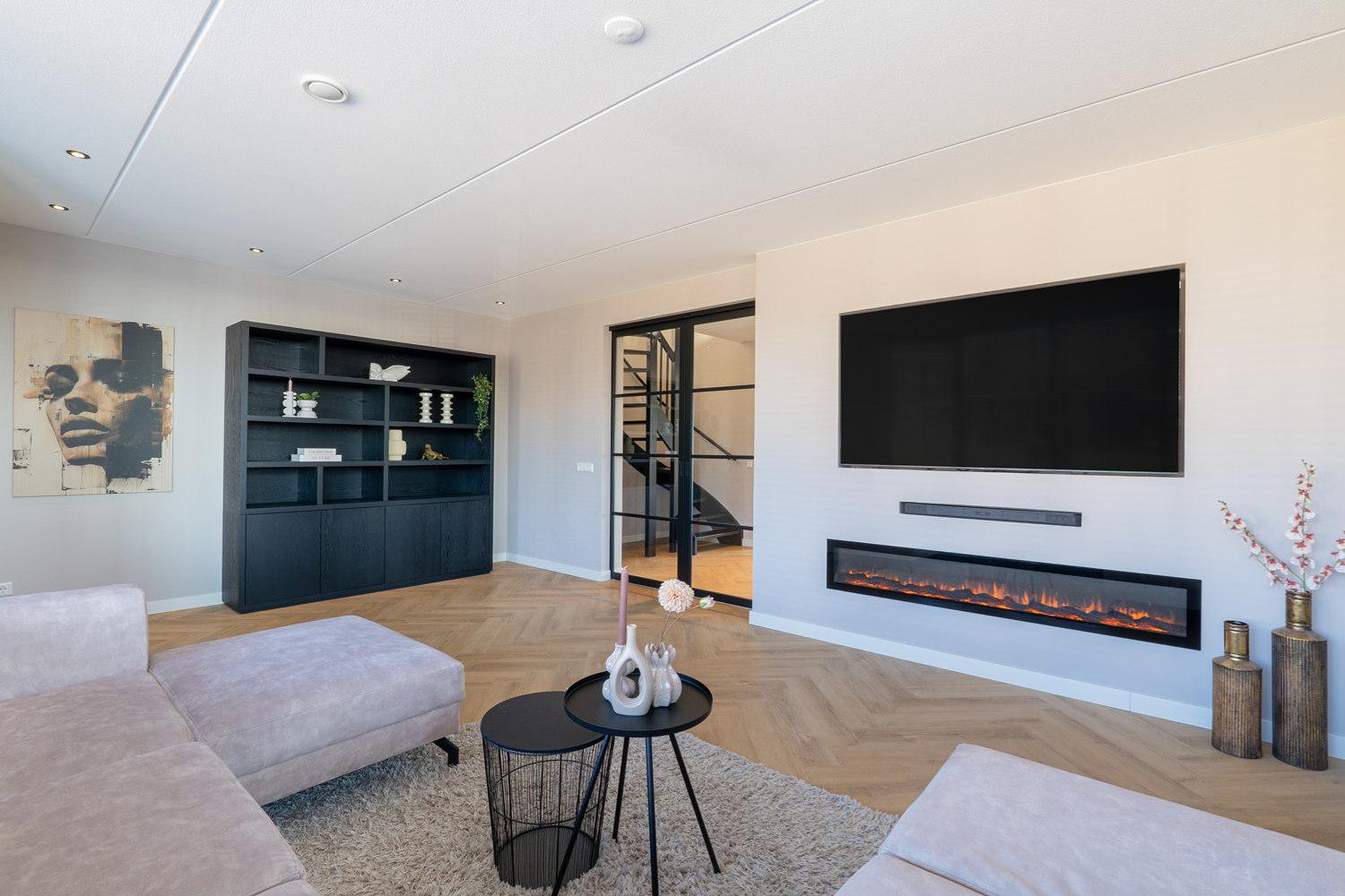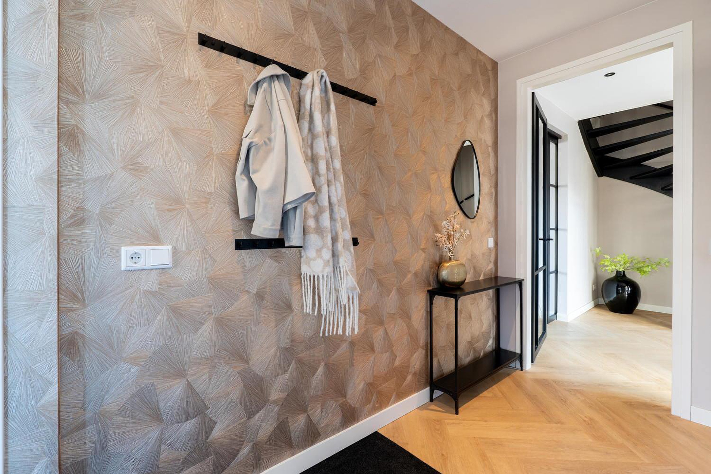 Begane grond Entree, hal, ingebouwde schoenenkast, meterkast met 16 groepen en 3 fasen aansluiting, tijdschakelaar voor inbouwspotjes, modern toilet (wandcloset) met fonteintje en trapopgang naar de eerste verdieping. De ruime woonkamer heeft een prachtige visgraat PVC-vloer met vloerverwarming. De smaakvolle woon-leefkeuken en de woonkamer kunnen worden afgesloten met stijlvolle en-suite deuren. De kunststof kozijnen met triple glas zorgen voor een optimale isolatie en een heerlijk stil binnenklimaat.