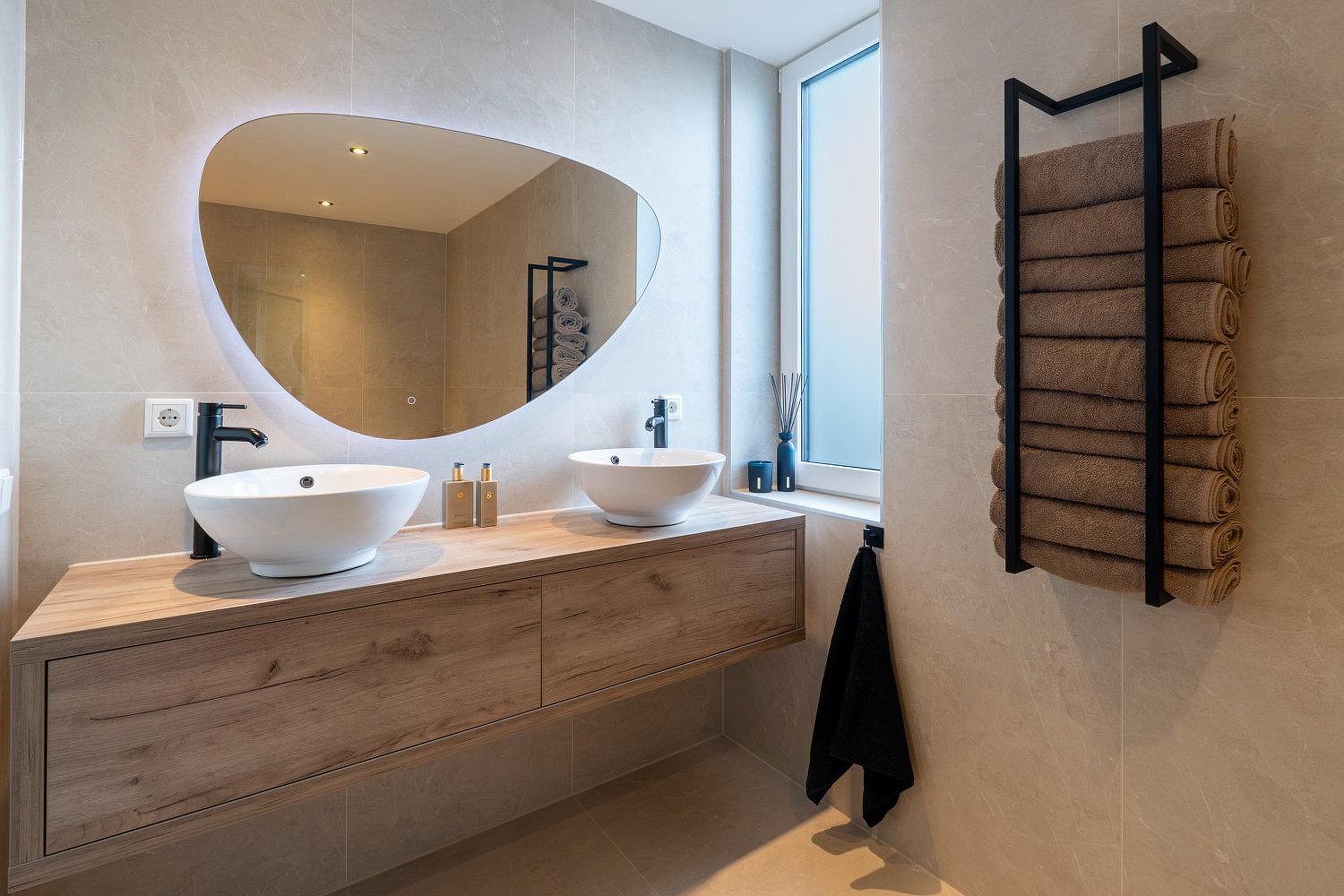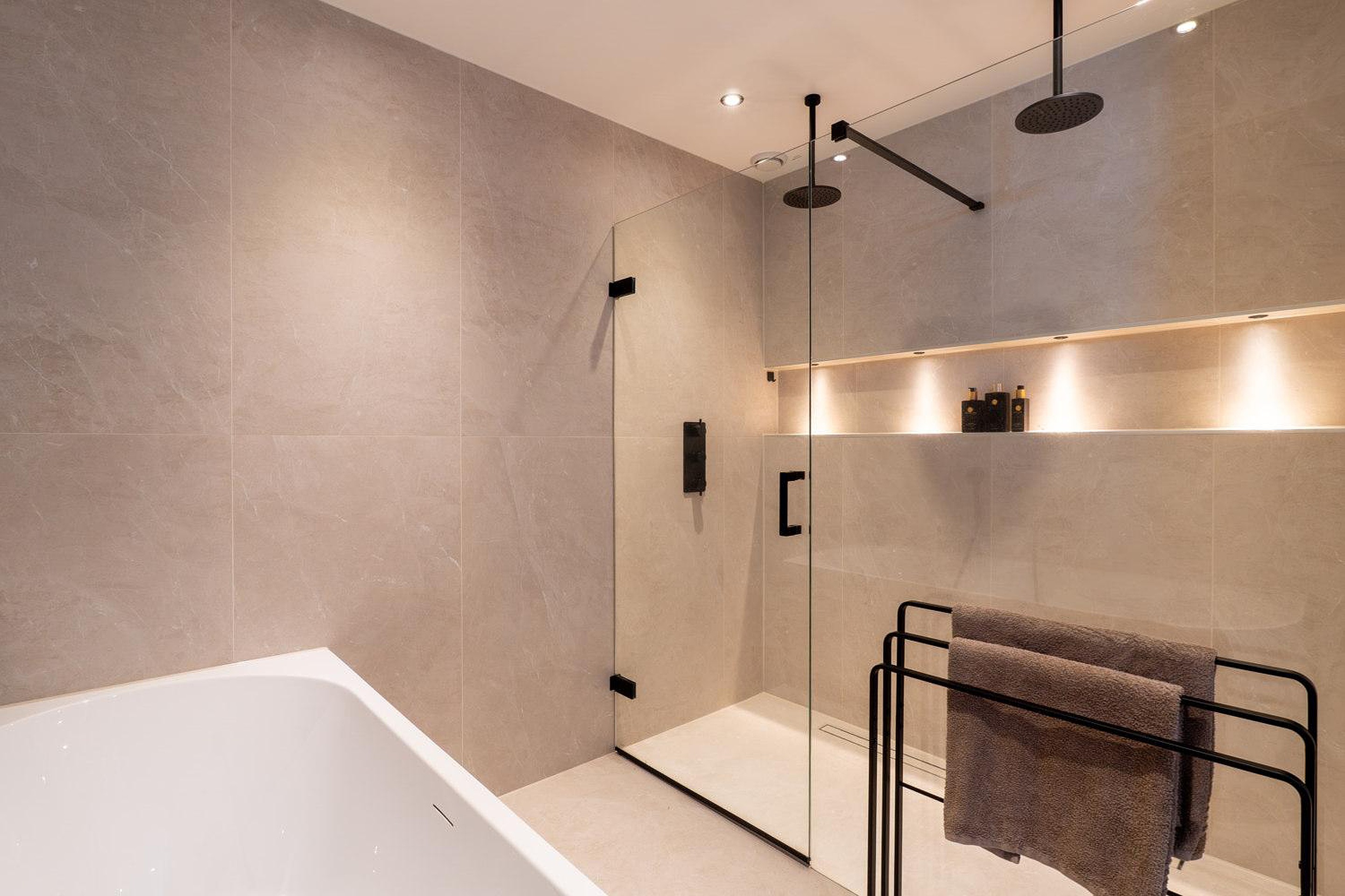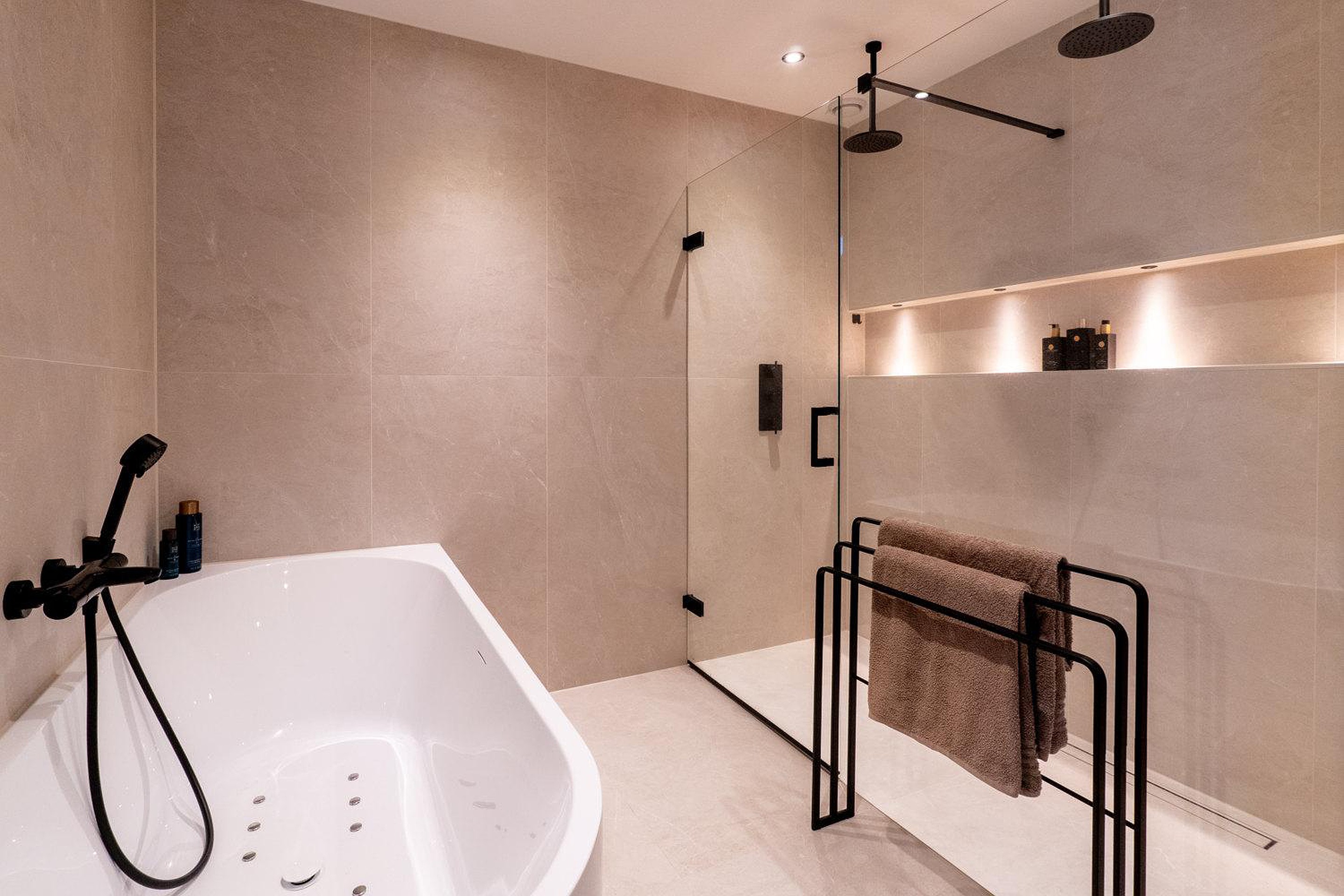 -moderne luxe keuken met kookeiland en moderne badkamer met dubbele inloop regendouche en whirlpool;