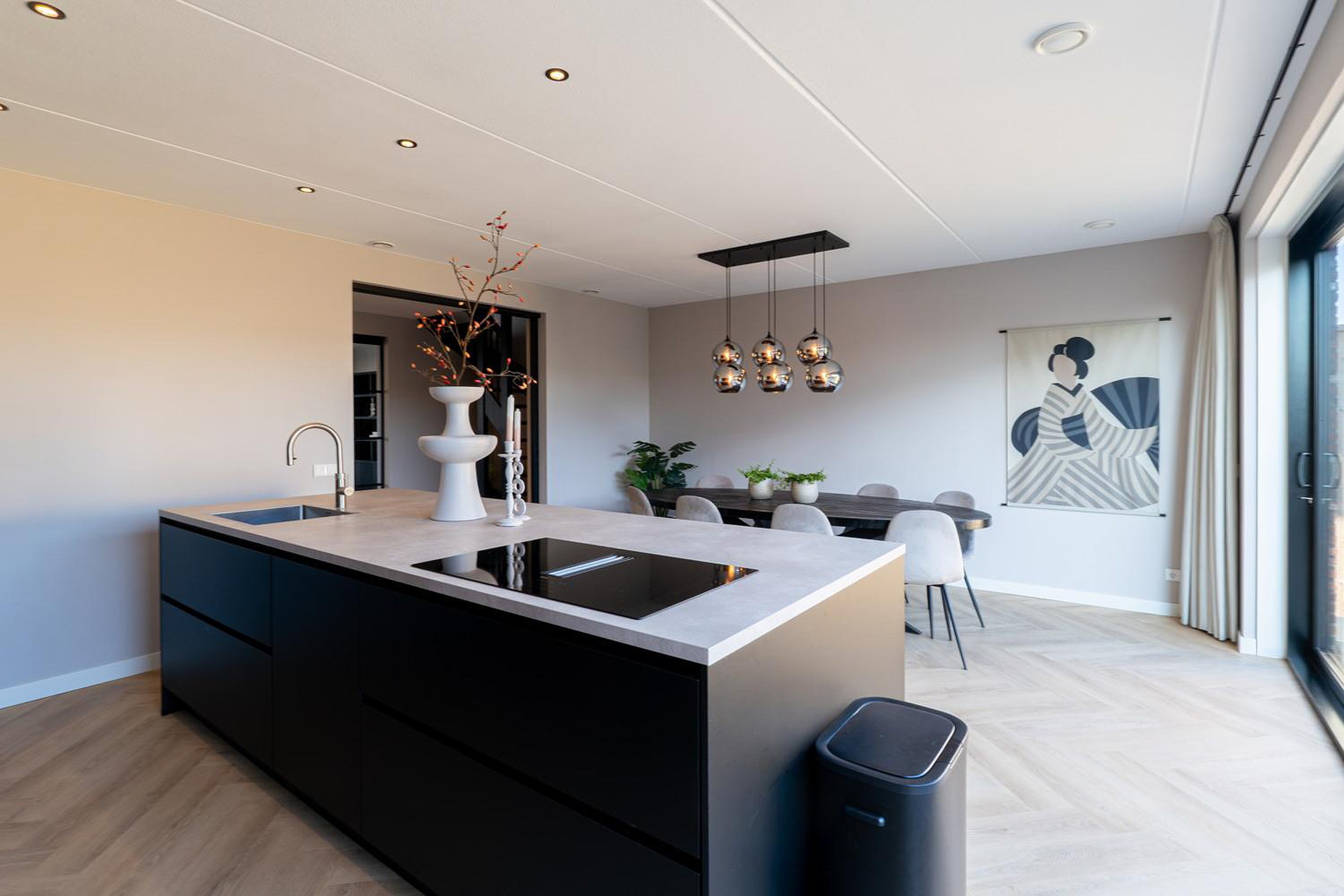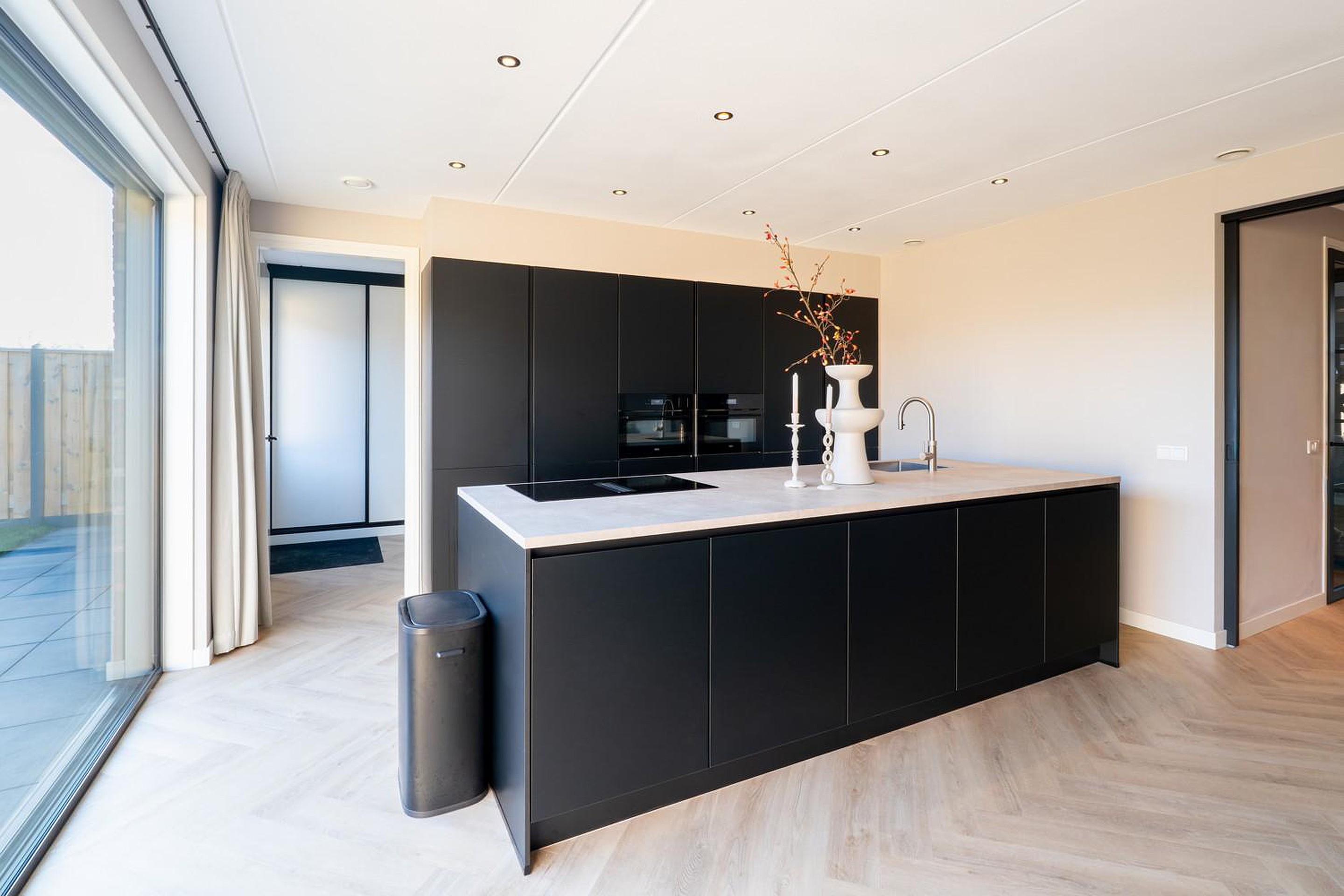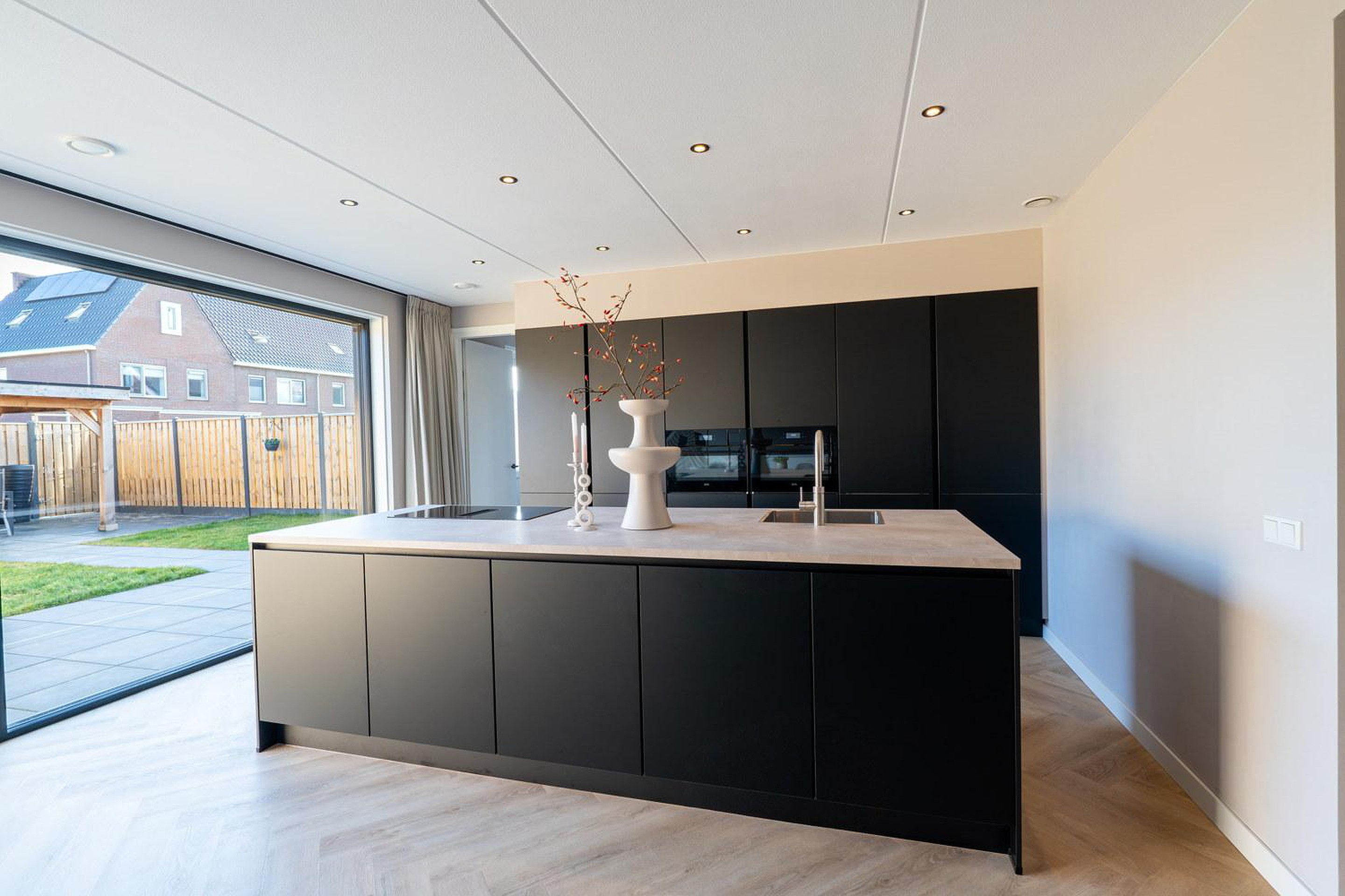 De stijlvolle woonkamer straalt luxe uit, mede door de prachtige en-suite deuren die de ruimte stijlvol scheidt van de woon-leefkeuken. De woning is voorzien van een uitbouw van 1,2 meter waardoor er een prachtige riante woon/ leefkeuken is gecreëerd. De zeer grote aluminium schuifpui van ca 5 meter biedt een zee aan licht, dus maximaal lichtinval en in de zomer schuif je die deuren lekker open en wordt je terras een verlengstuk van je woon-leefkeuken. En ook in de winter heb je prachtig uitzicht op je tuin.