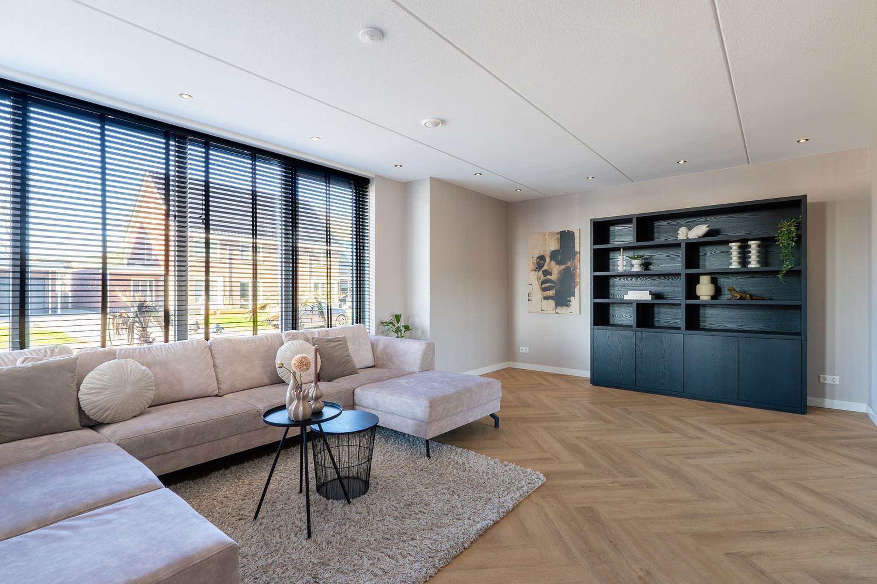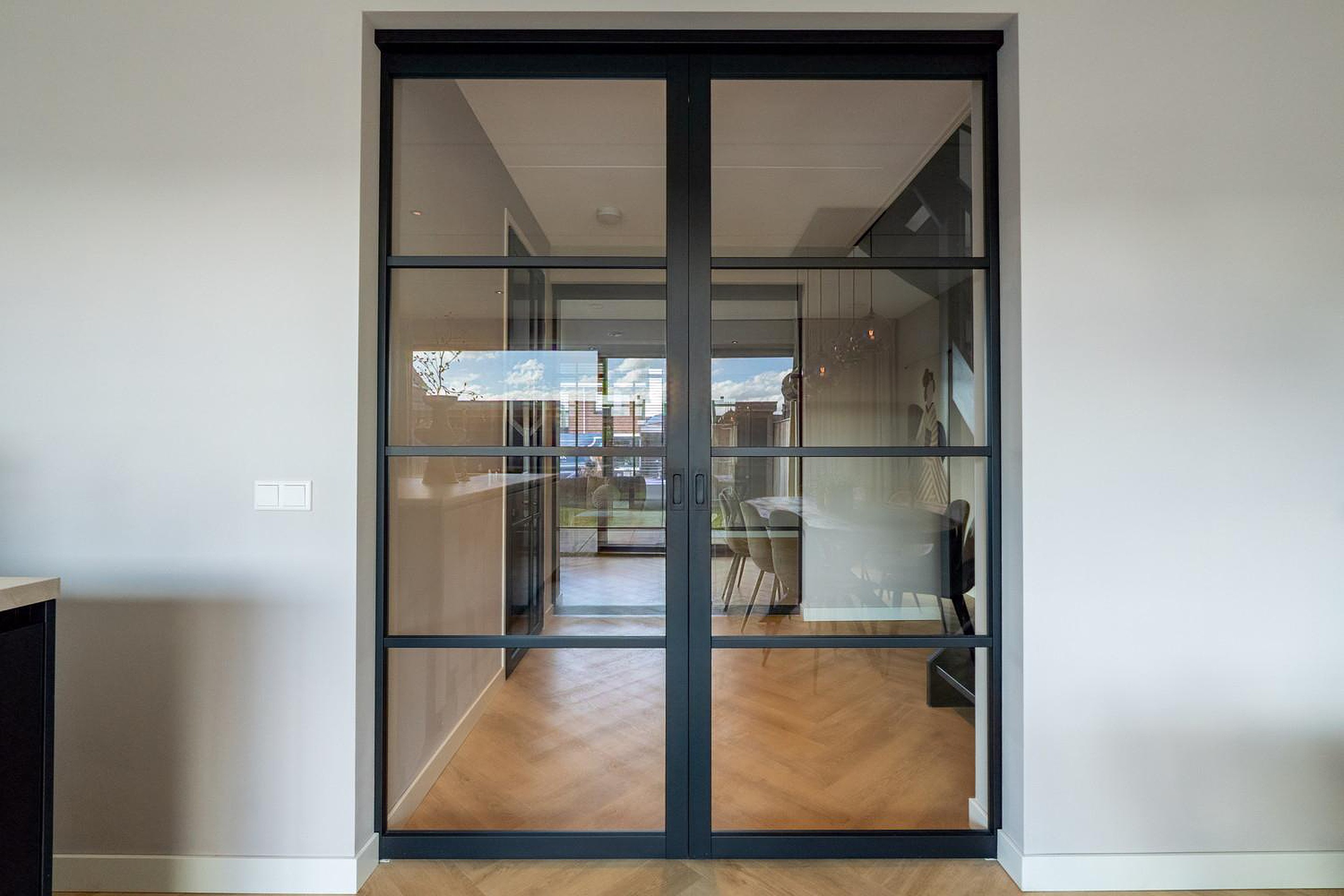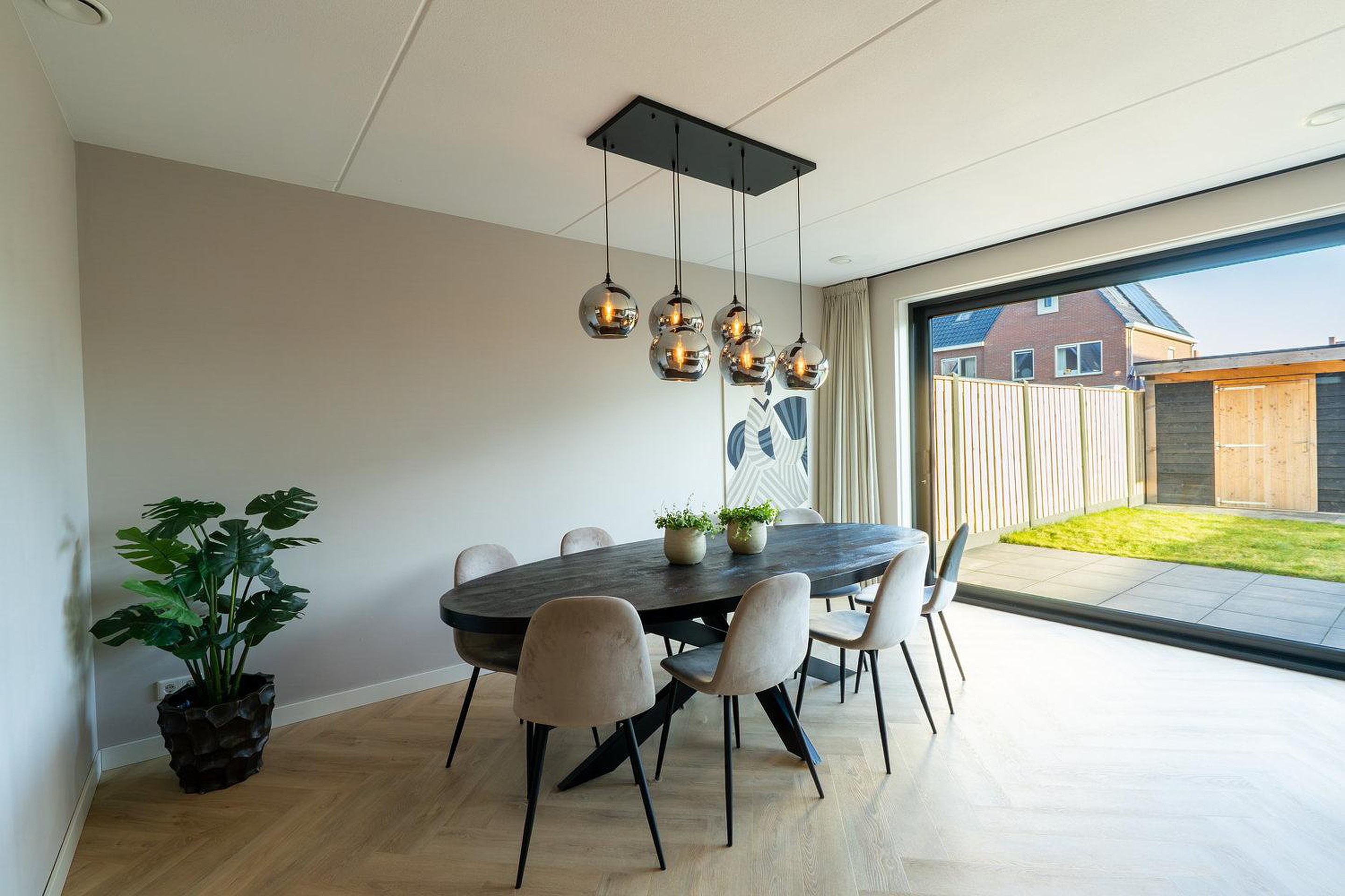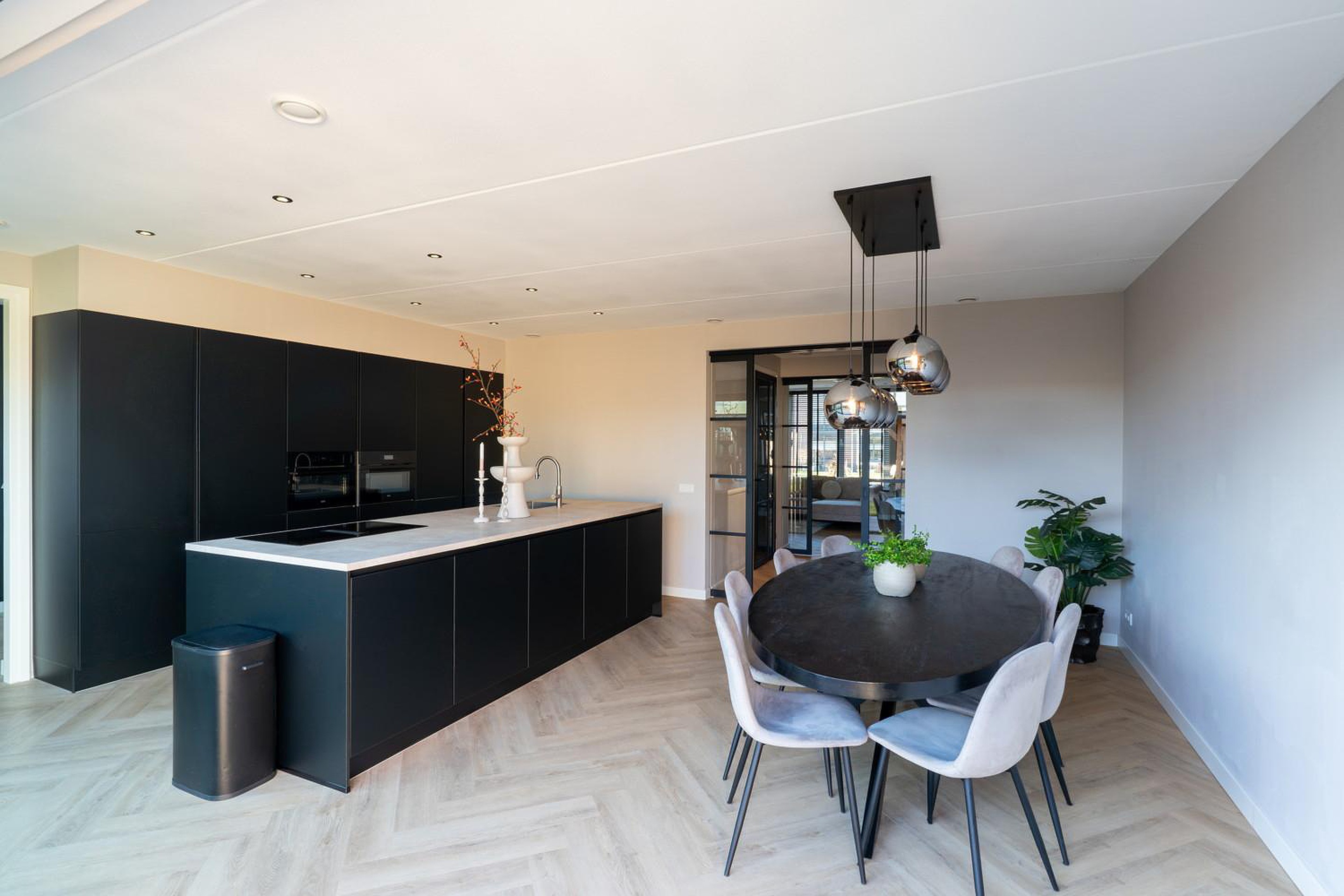 De stijlvolle woonkamer straalt luxe uit, mede door de prachtige en-suite deuren die de ruimte stijlvol scheidt van de woon-leefkeuken. De woning is voorzien van een uitbouw van 1,2 meter waardoor er een prachtige riante woon/ leefkeuken is gecreëerd. De zeer grote aluminium schuifpui van ca 5 meter biedt een zee aan licht, dus maximaal lichtinval en in de zomer schuif je die deuren lekker open en wordt je terras een verlengstuk van je woon-leefkeuken. En ook in de winter heb je prachtig uitzicht op je tuin.
