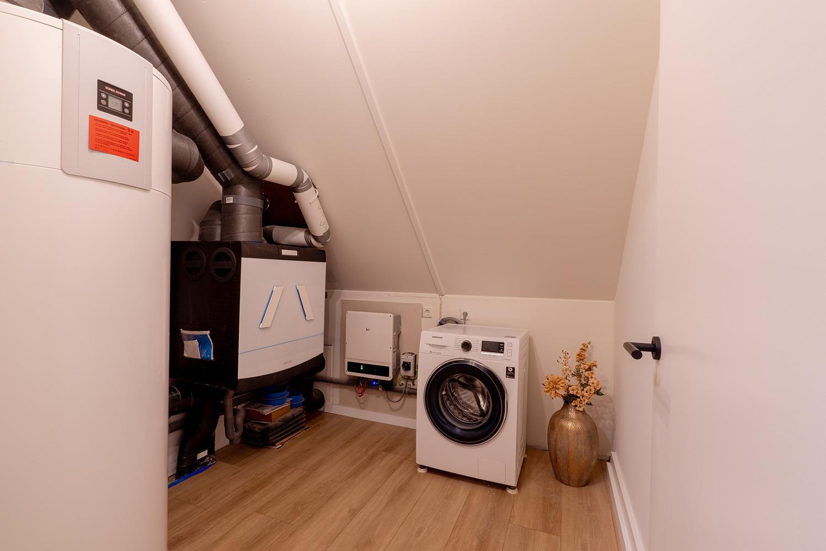 Tweede verdieping Via een vaste trap kom je op de overloop van de tweede verdieping. Hier is een aparte technische ruimte met de WTW installatie, warmtepompboiler (300 liter) en omvormer zonnepanelen. Tevens bevinden zich hier de witgoedaansluitingen. Ook is hier nog een aparte berging voor opslag. De beide ruime volwaardige slaapkamers zijn kwalitatief goed afgewerkt en zijn beide circa 12 m2 groot. De hele verdieping is uitgerust met een mooie laminaatvloer. Via een vlizotrap is er nog toegang tot de vliering, welke geschikt is al extra bergruimte.