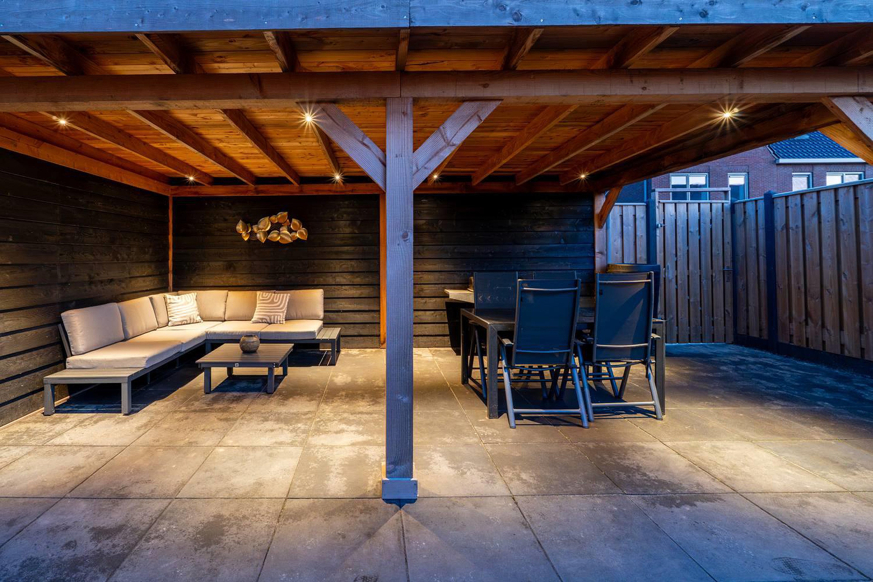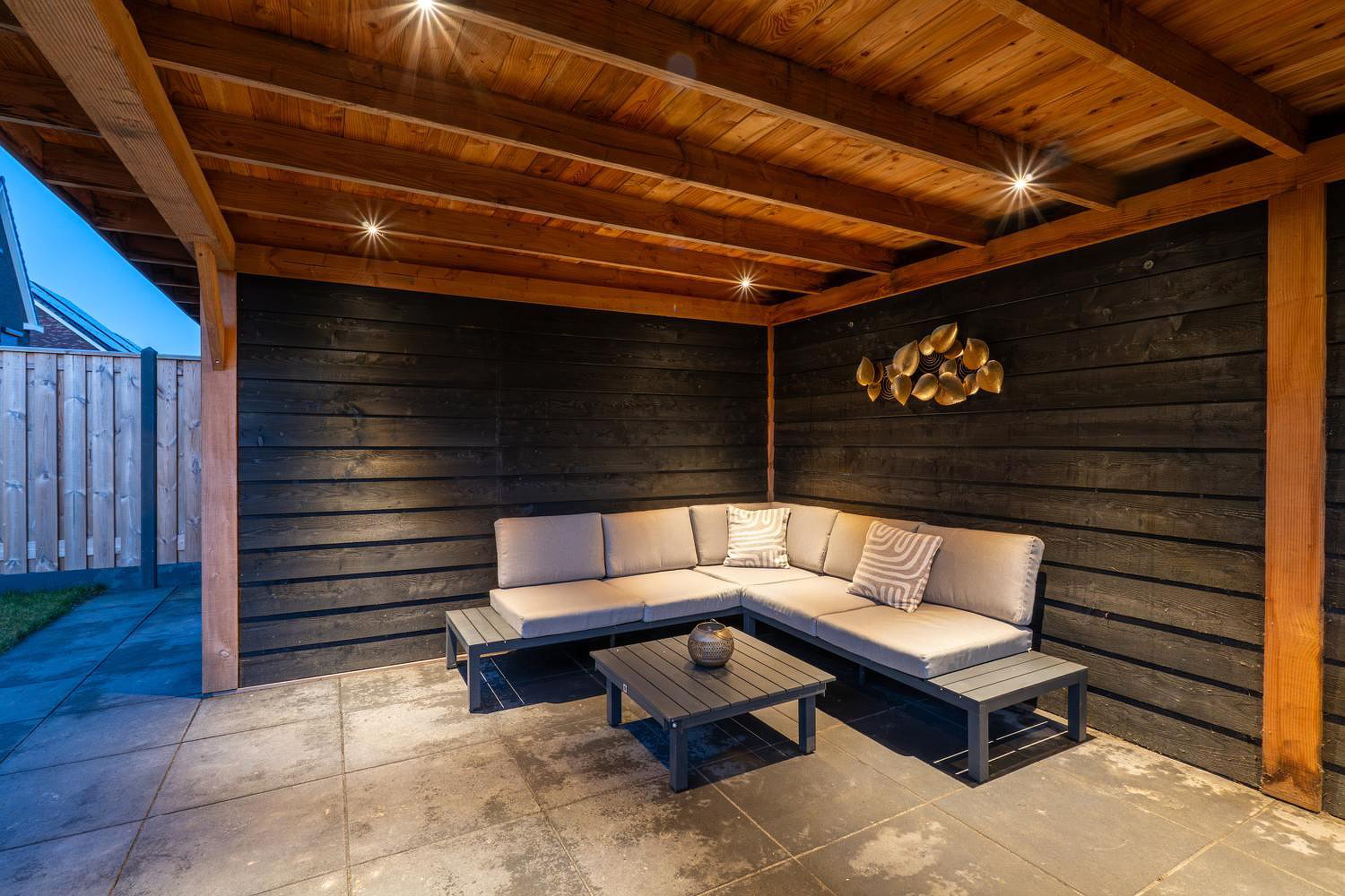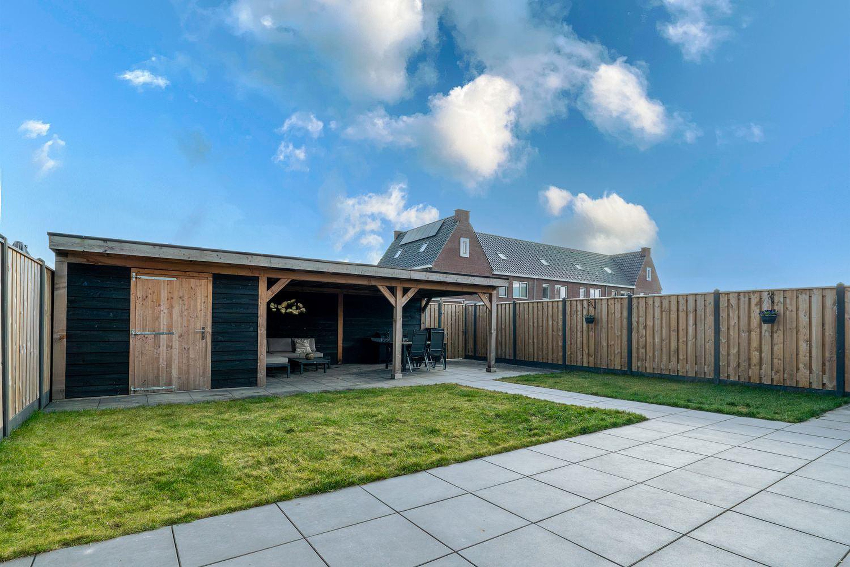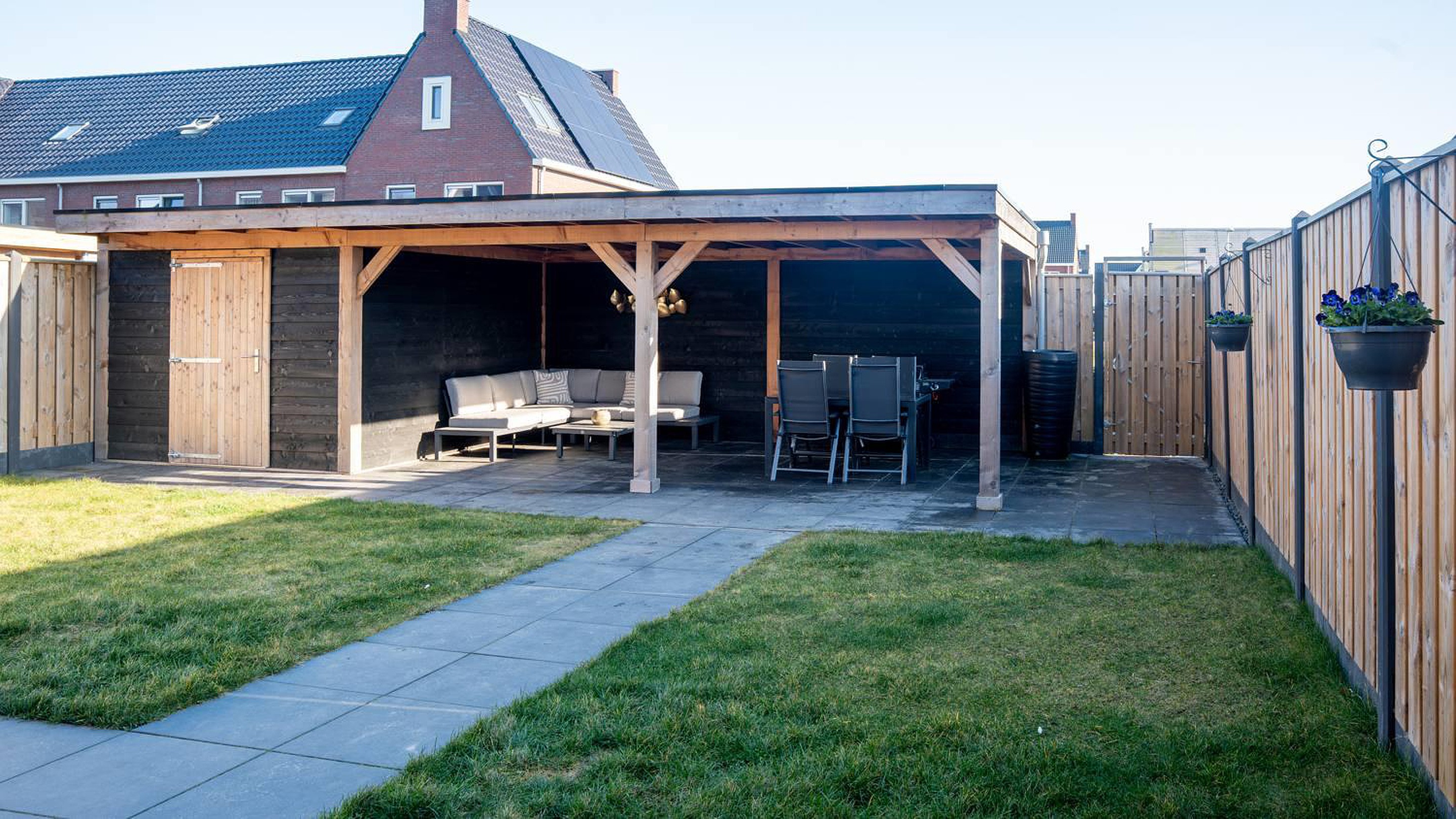 -tuin op het zuiden met grote overkapping;