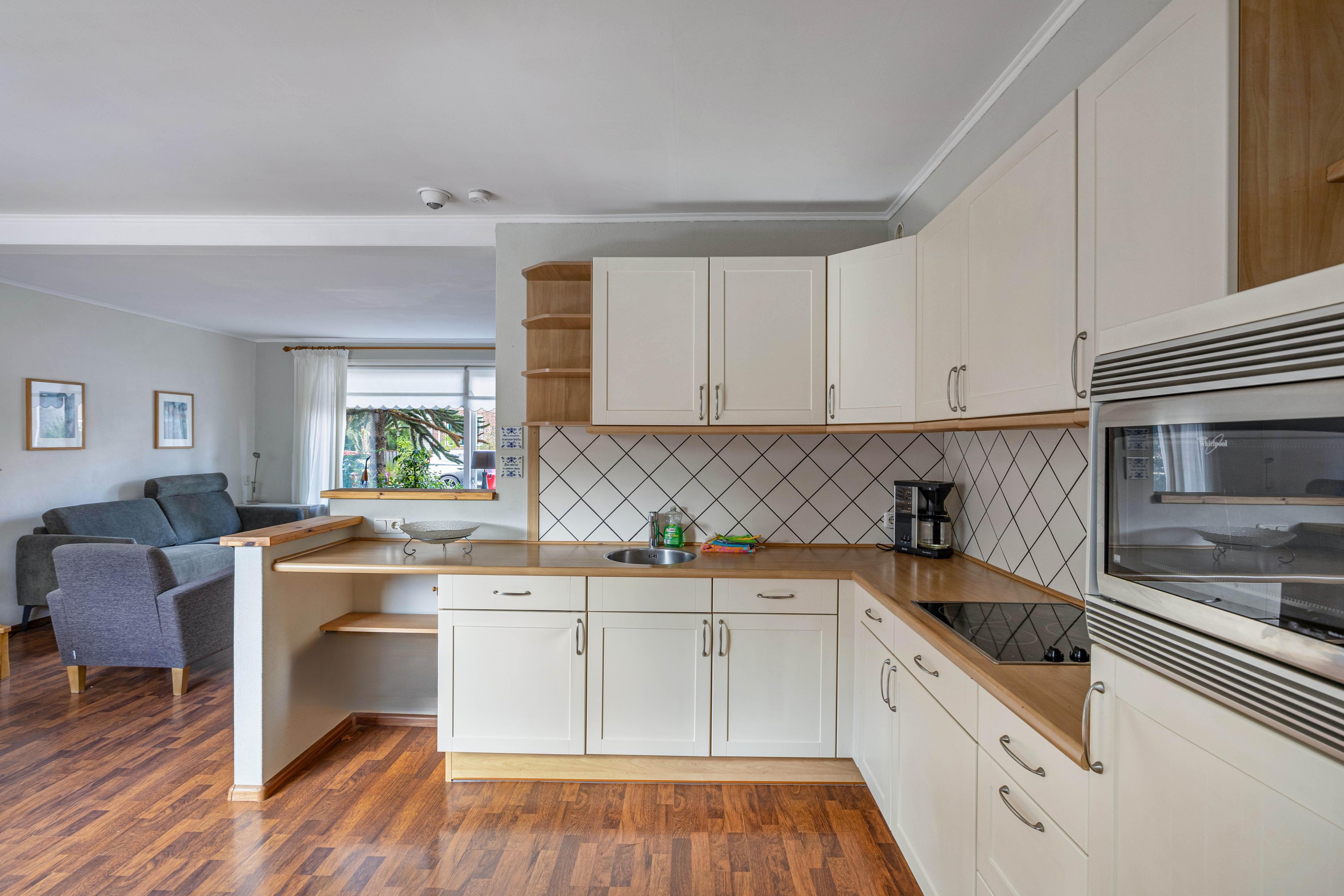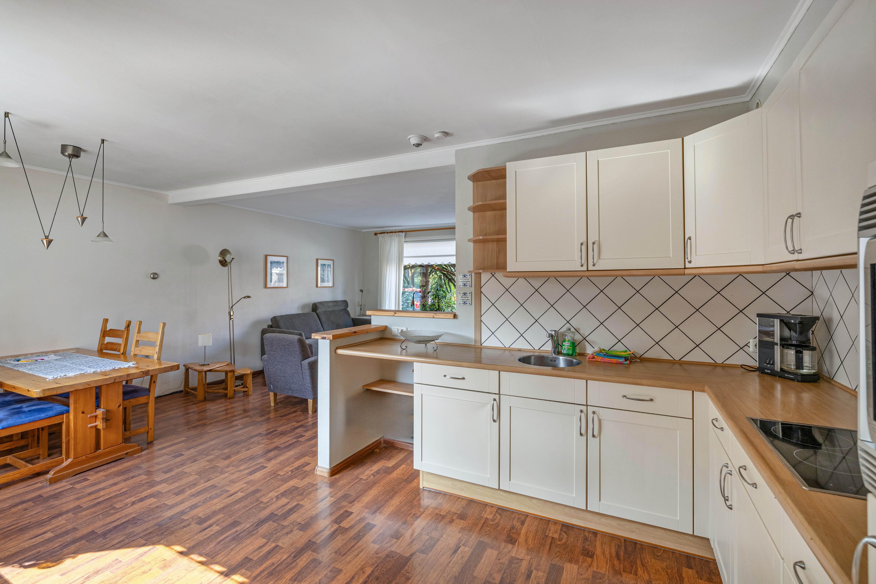 Dit huis heeft een open keuken voorzien van inductiekookplaat, afzuigkap en koelkast.