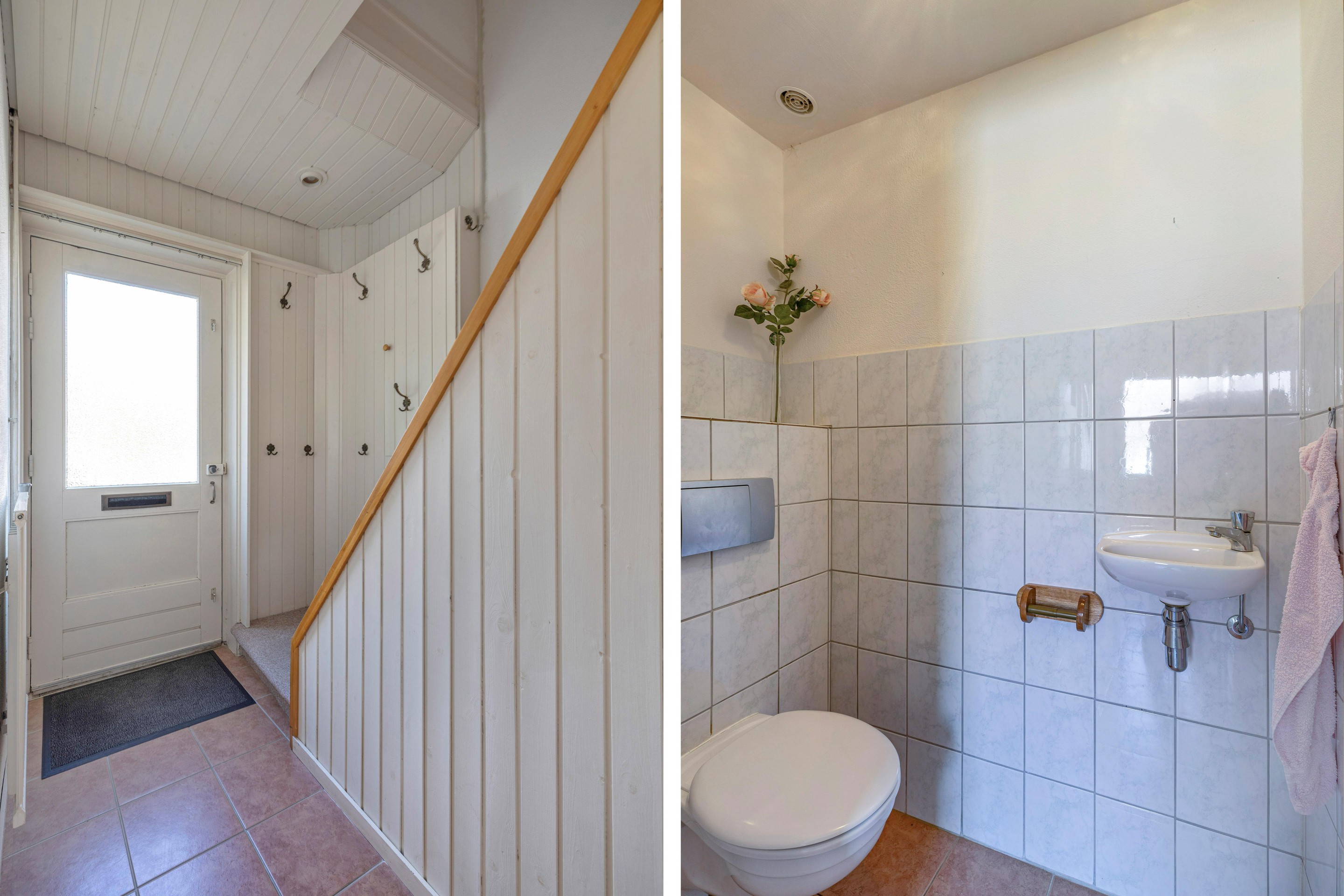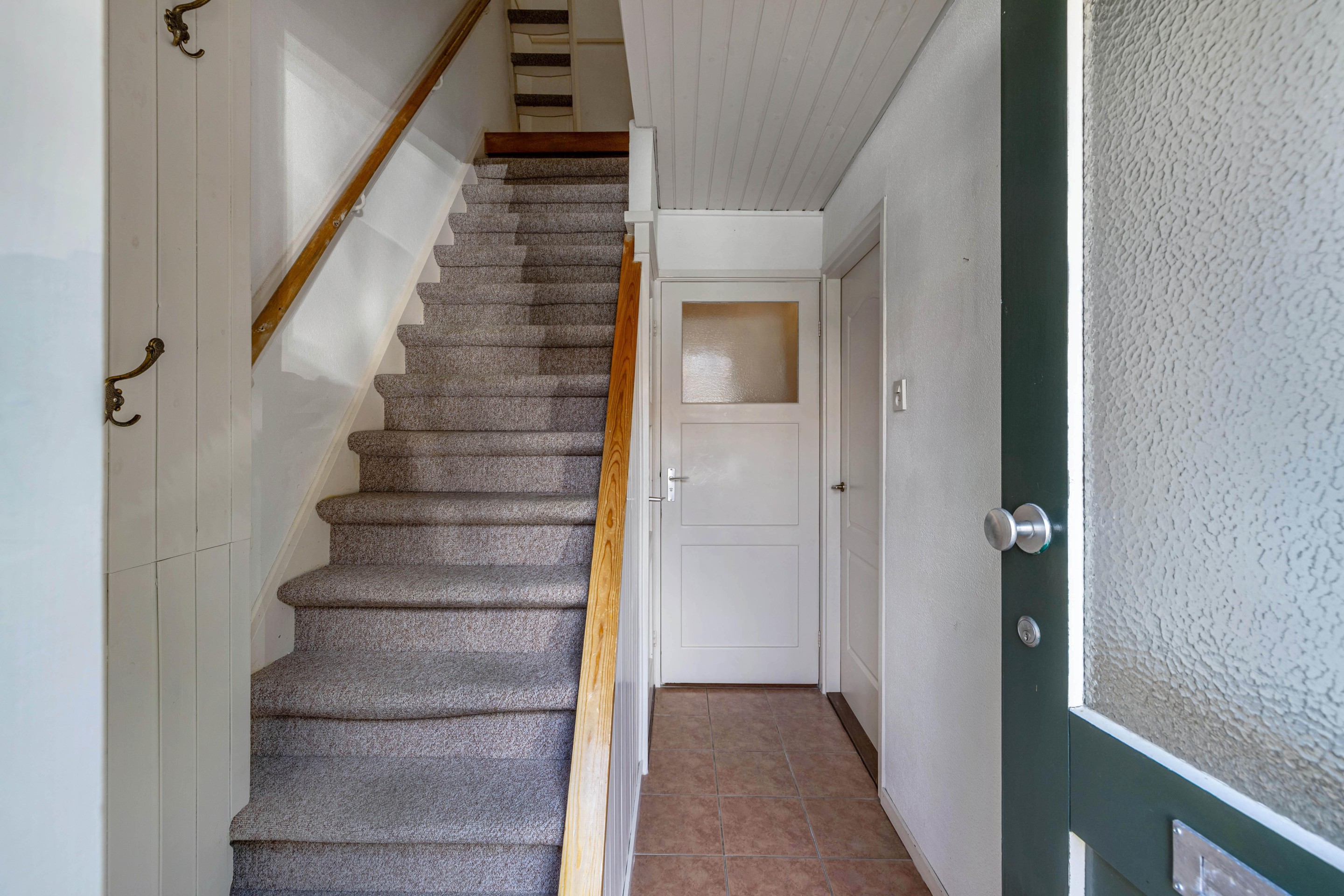 Via de entree bereik je het toilet, de trapopgang naar de eerste verdieping, de kelderkast en de woonkamer.